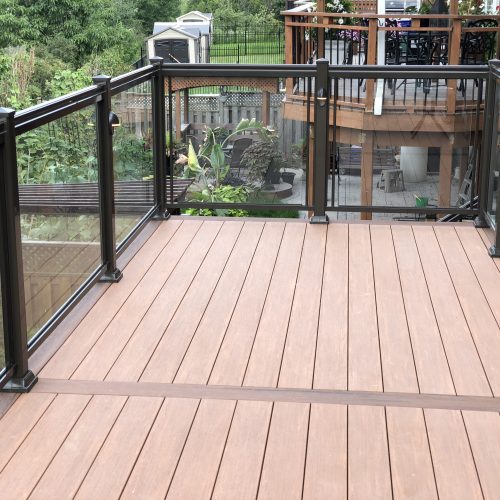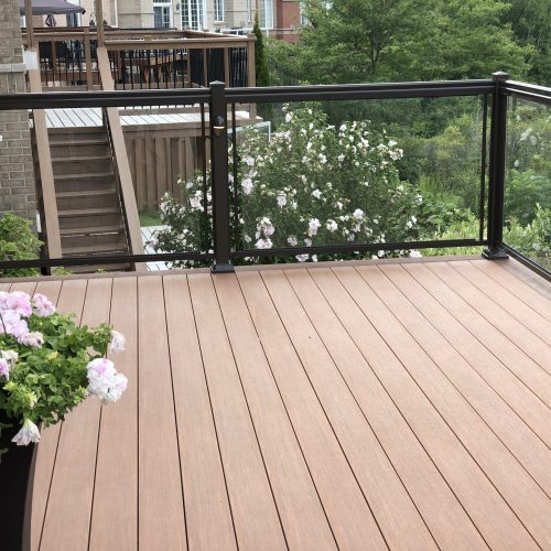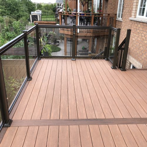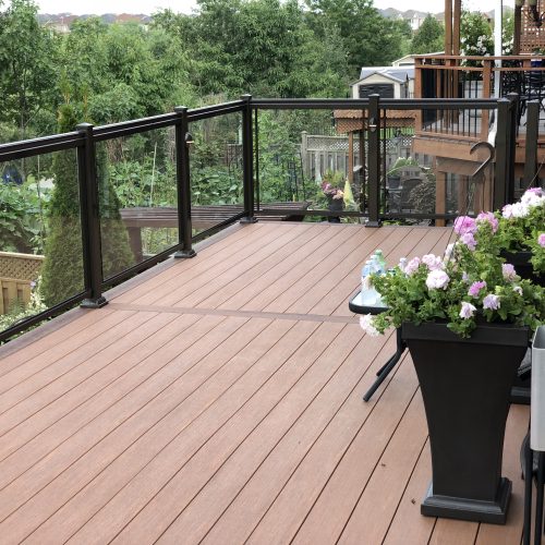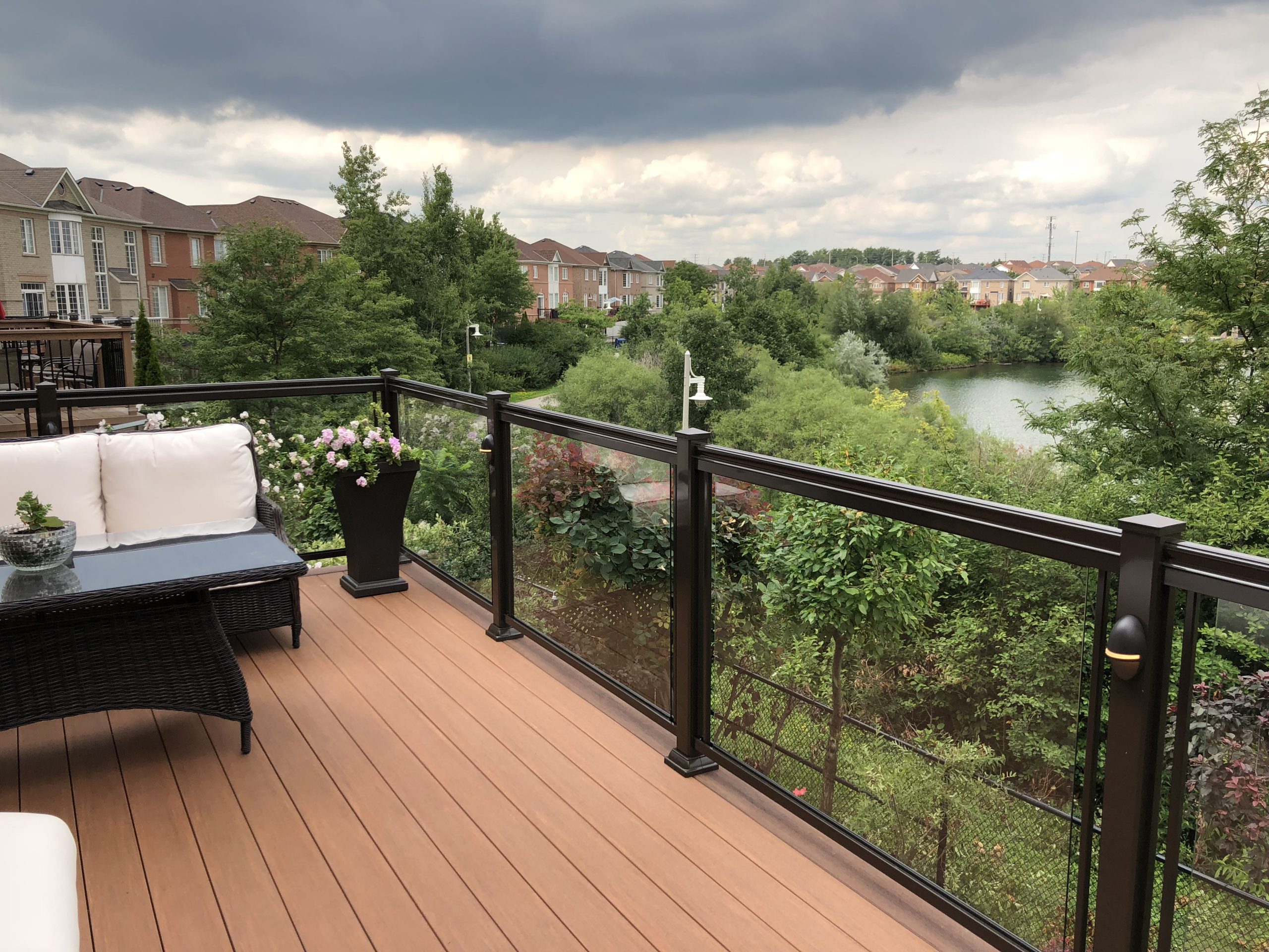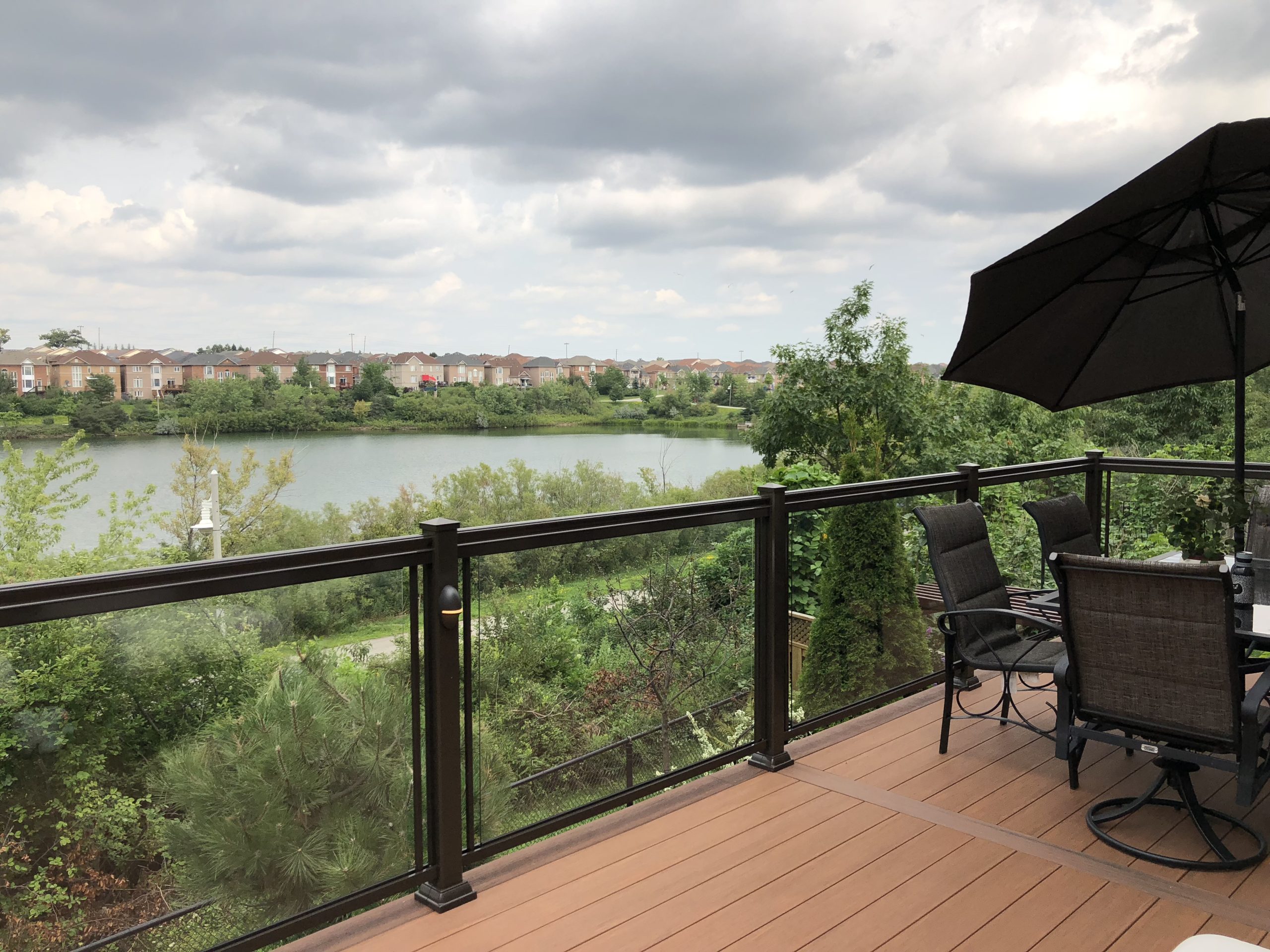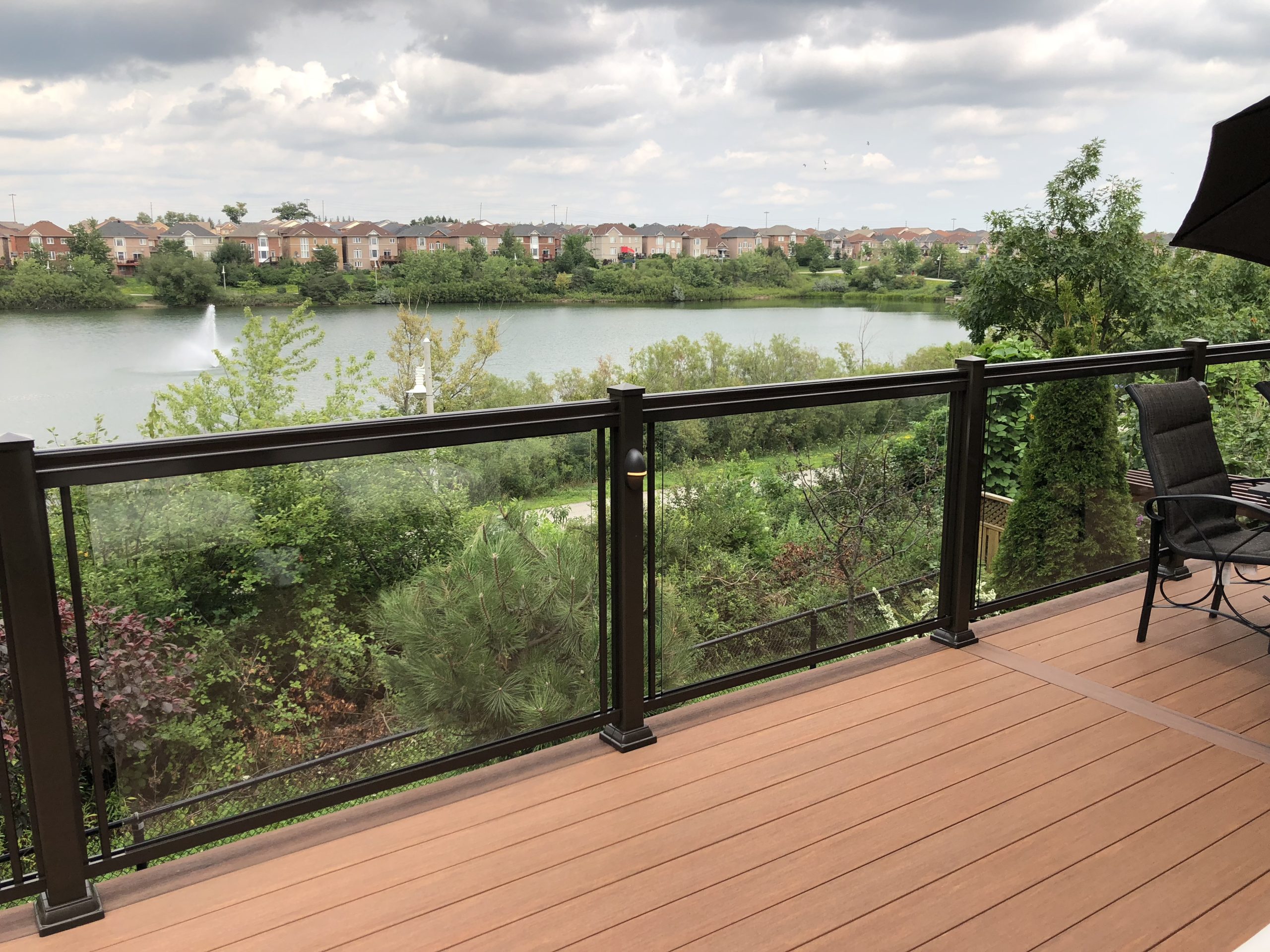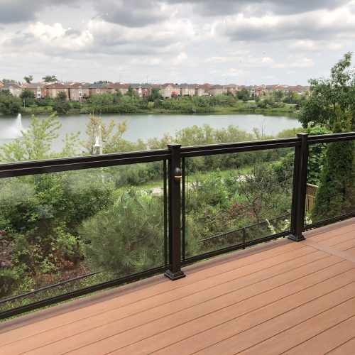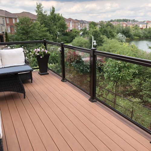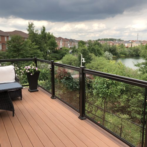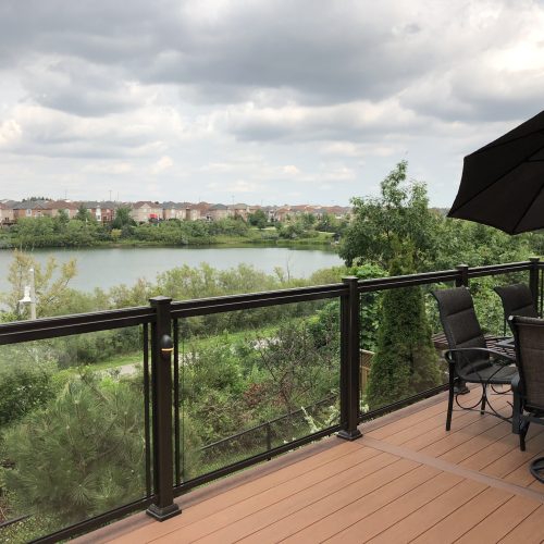 This elevated PVC deck in Richmond Hill was designed to take full advantage of the property’s natural pond view, creating a premium outdoor living space with unbeatable durability and zero maintenance. Built using high-performance PVC decking and a bronze aluminum–glass railing system, the deck offers long-term weather resistance, superior stability, and a sleek, modern aesthetic.
