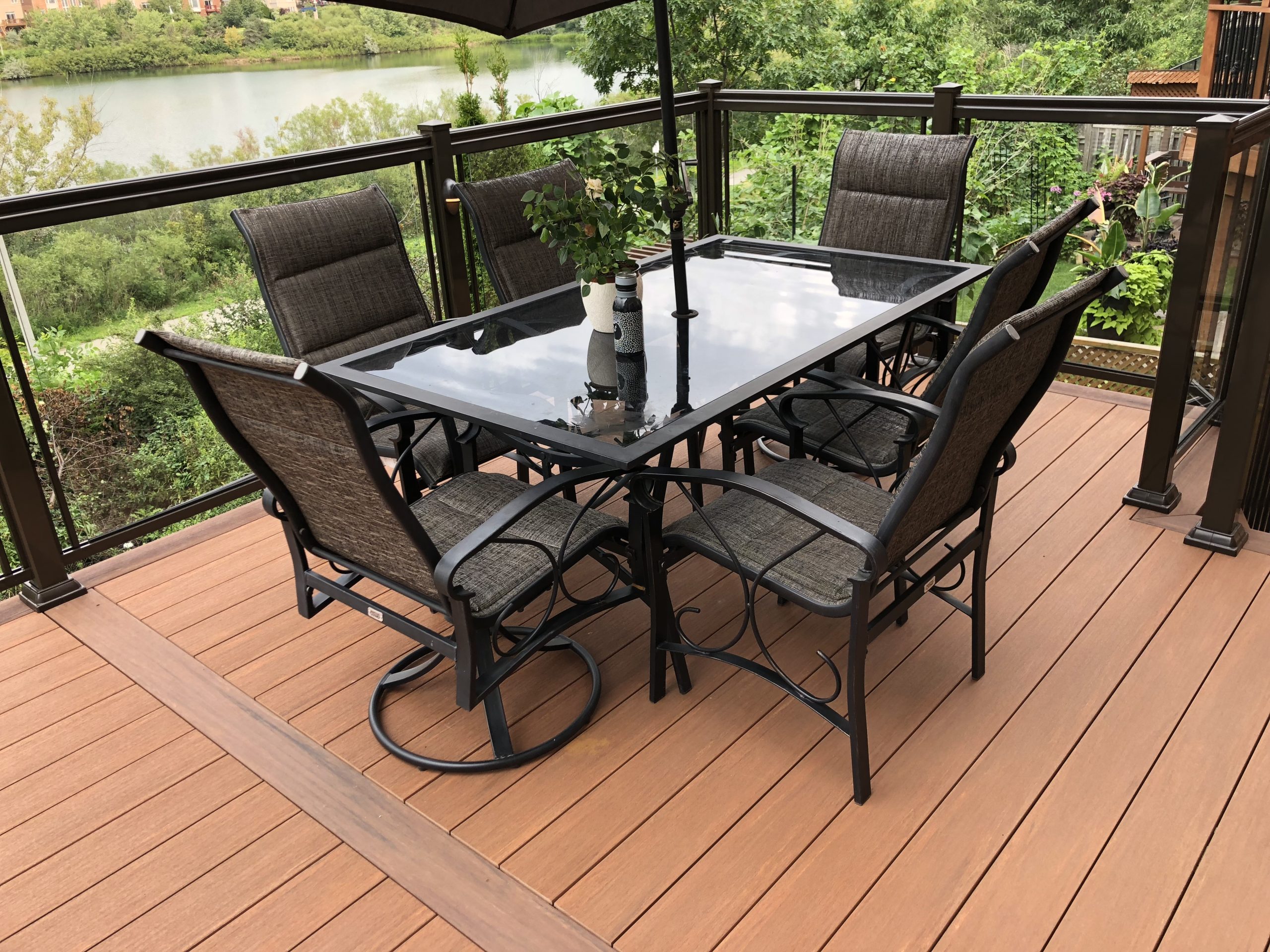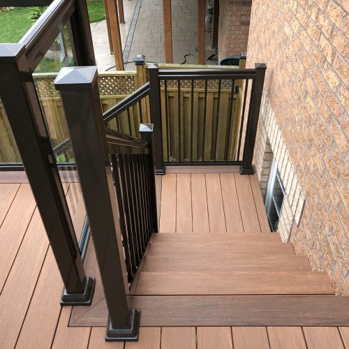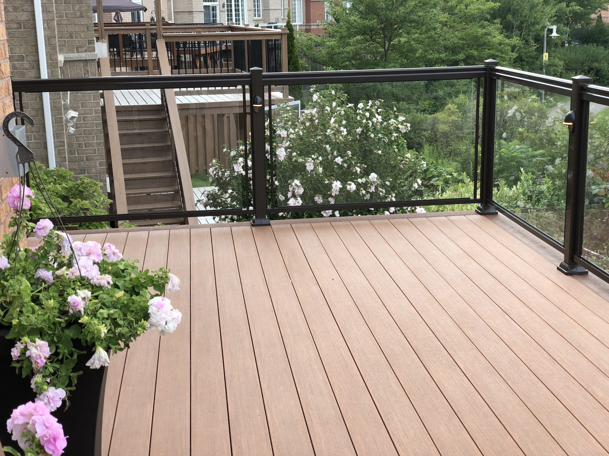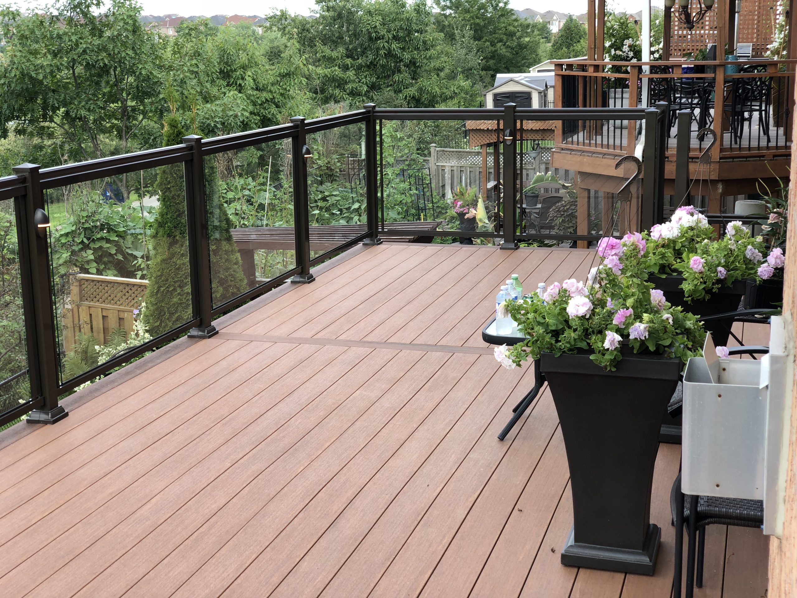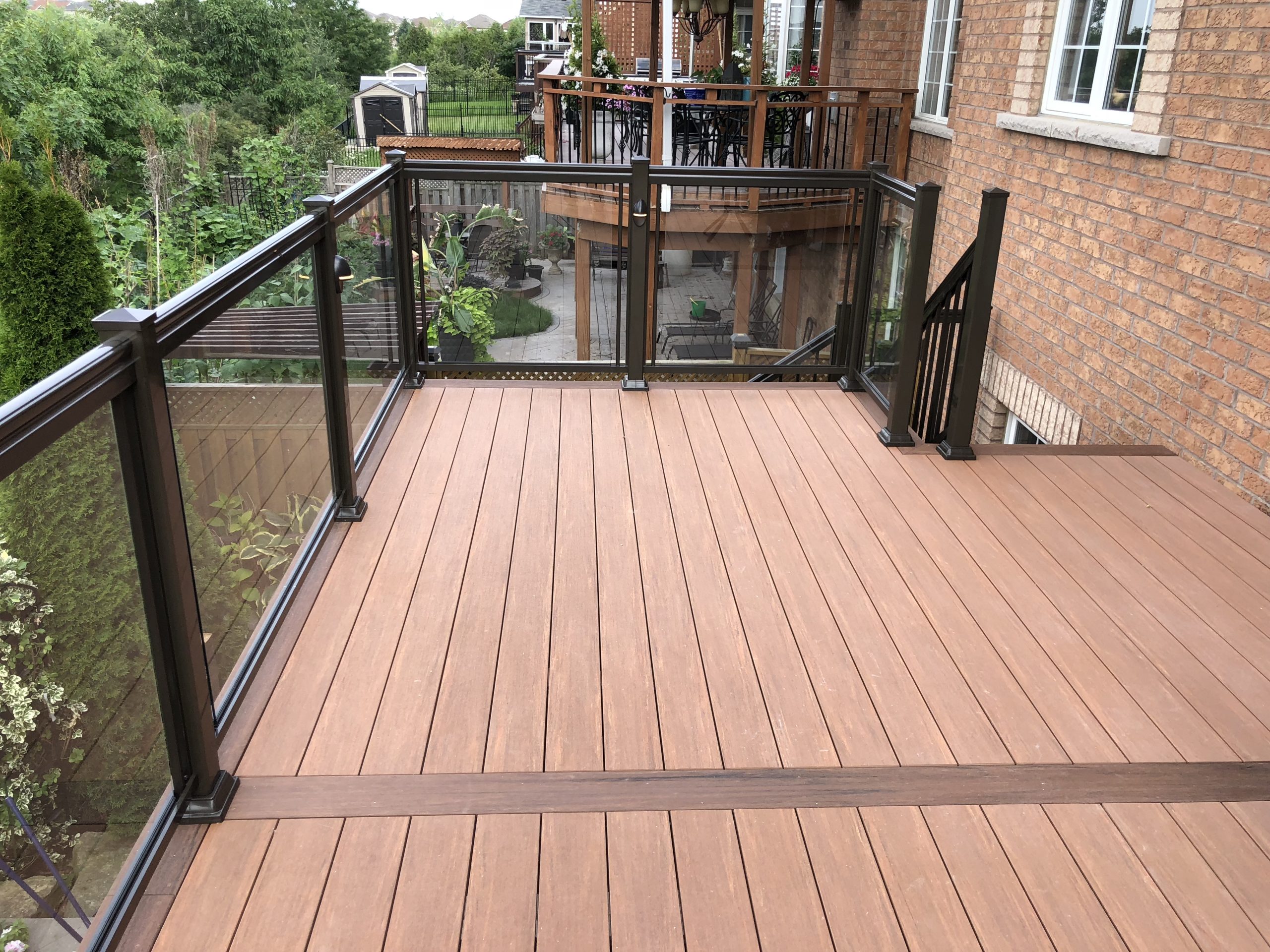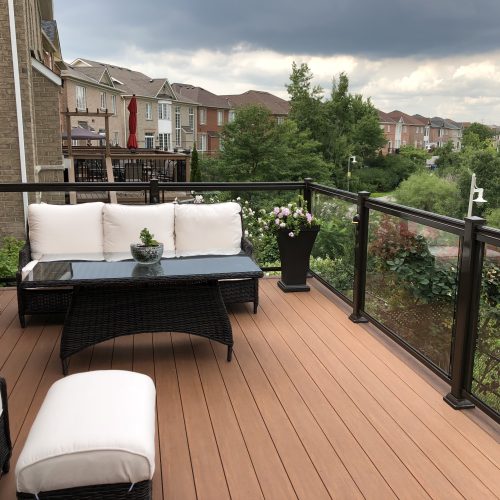 This elevated PVC deck in Richmond Hill was designed to take full advantage of the property’s natural pond view, creating a premium outdoor living space with unbeatable durability and zero maintenance. Built using high-performance PVC decking and a bronze aluminum–glass railing system, the deck offers long-term weather resistance, superior stability, and a sleek, modern aesthetic.