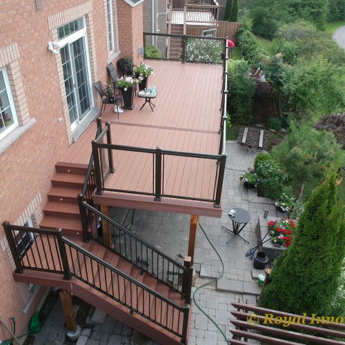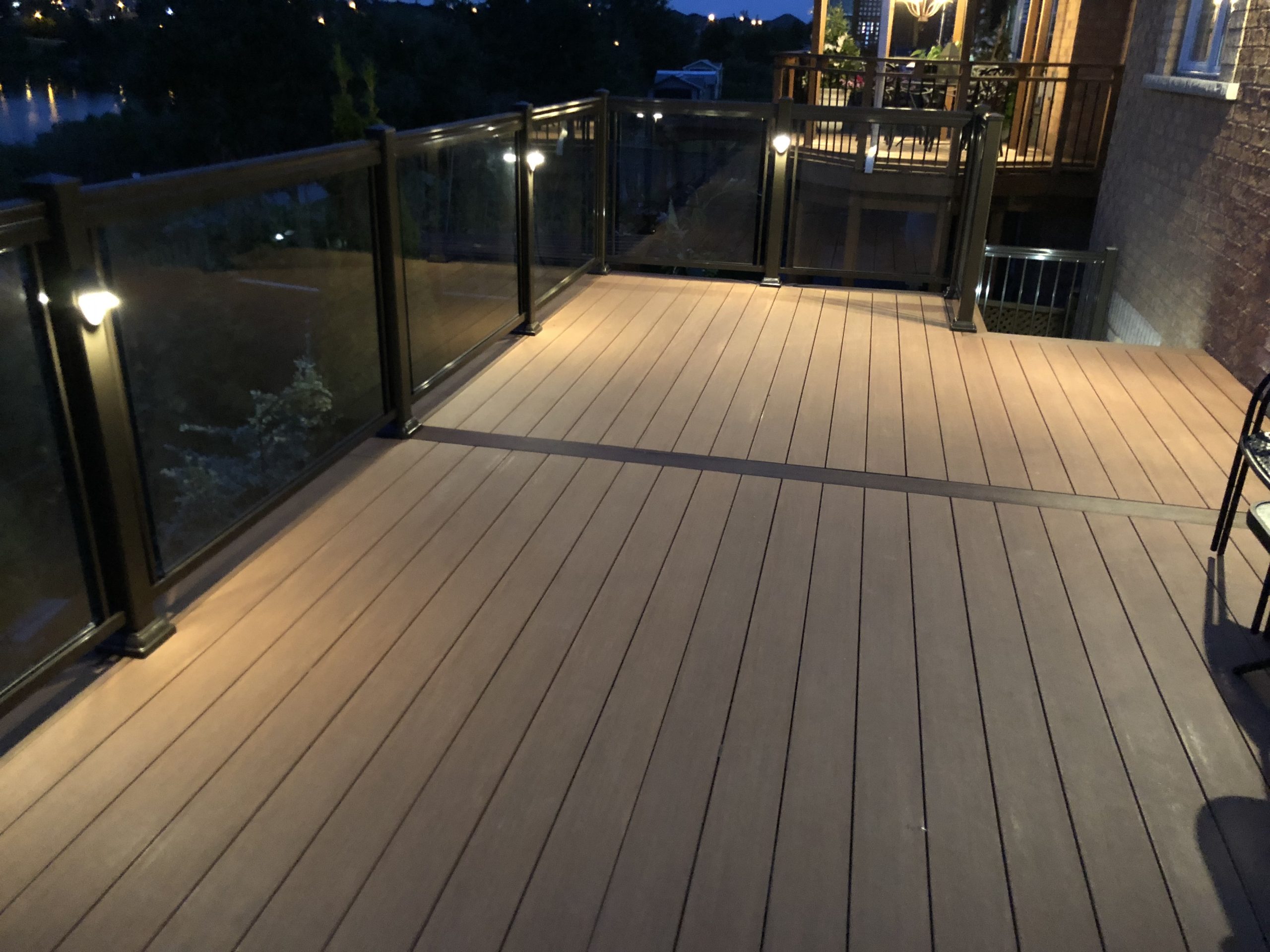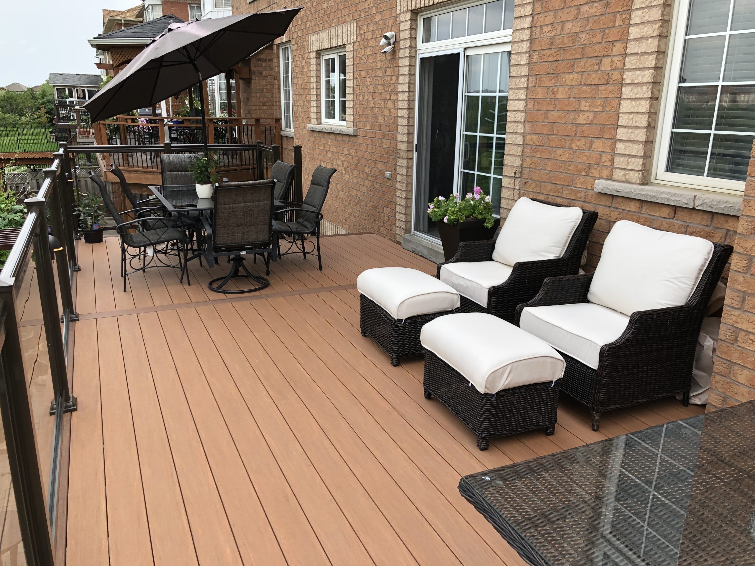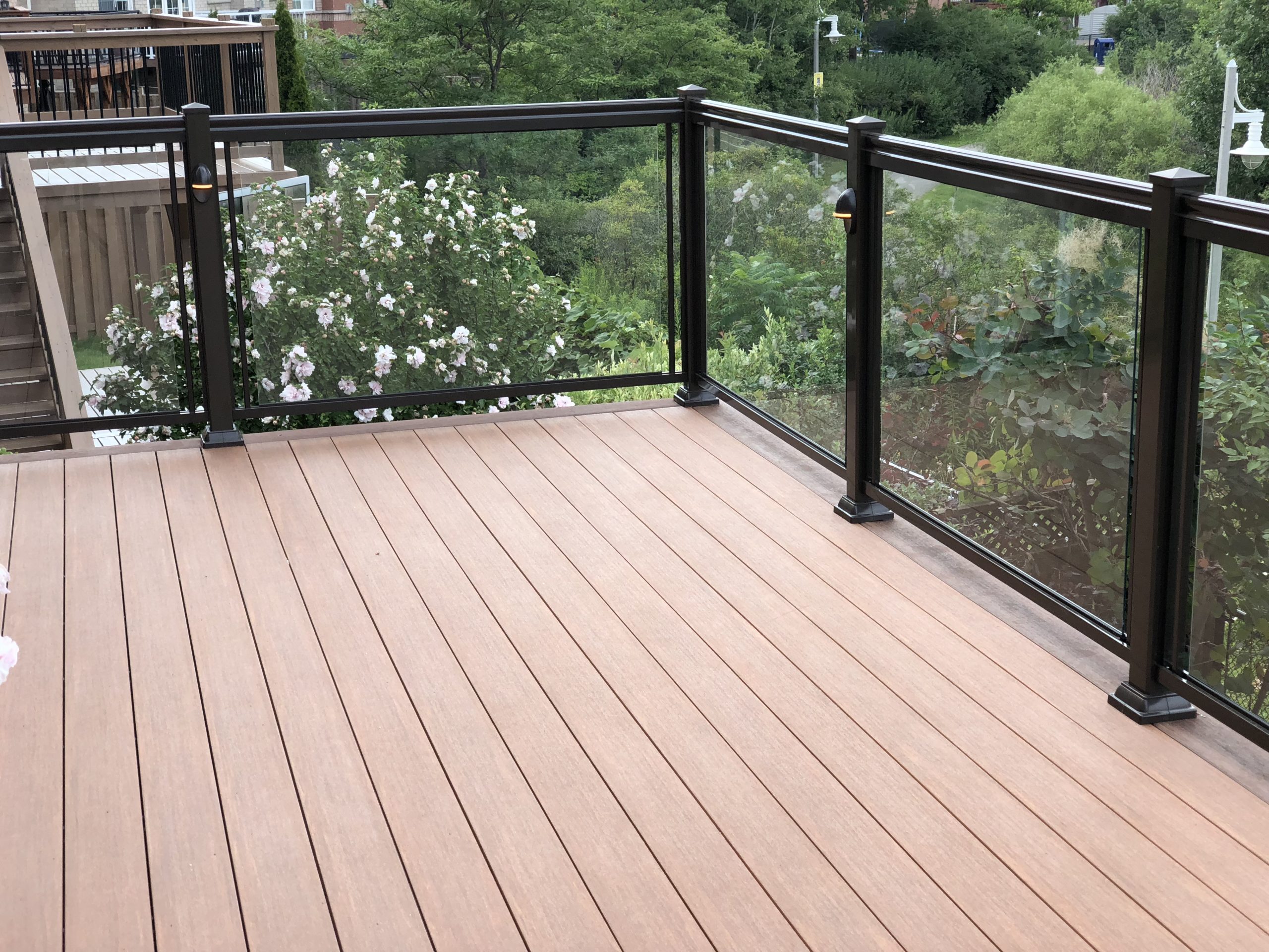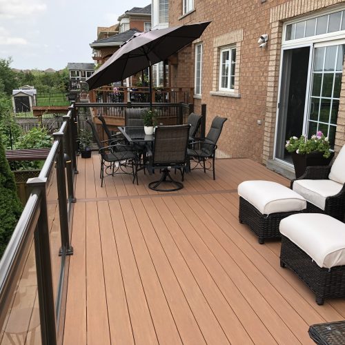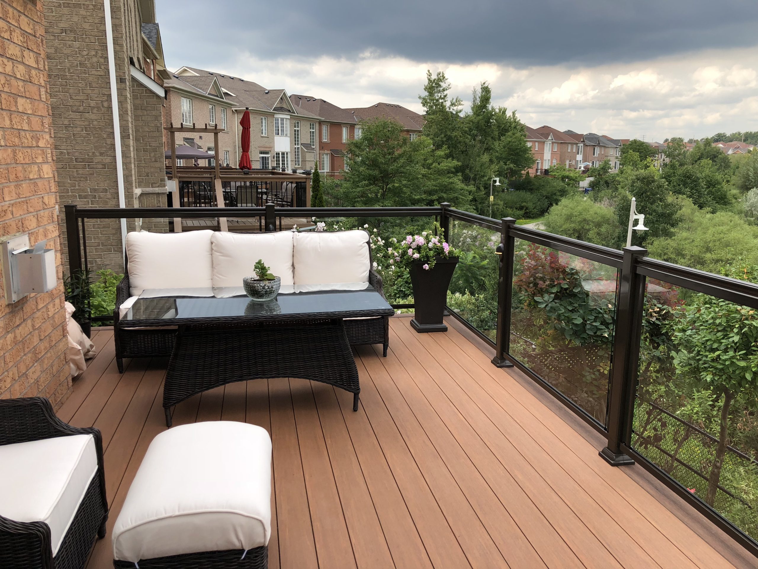 This elevated PVC deck in Richmond Hill was designed to take full advantage of the property’s natural pond view, creating a premium outdoor living space with unbeatable durability and zero maintenance. Built using high-performance PVC decking and a bronze aluminum–glass railing system, the deck offers long-term weather resistance, superior stability, and a sleek, modern aesthetic.
