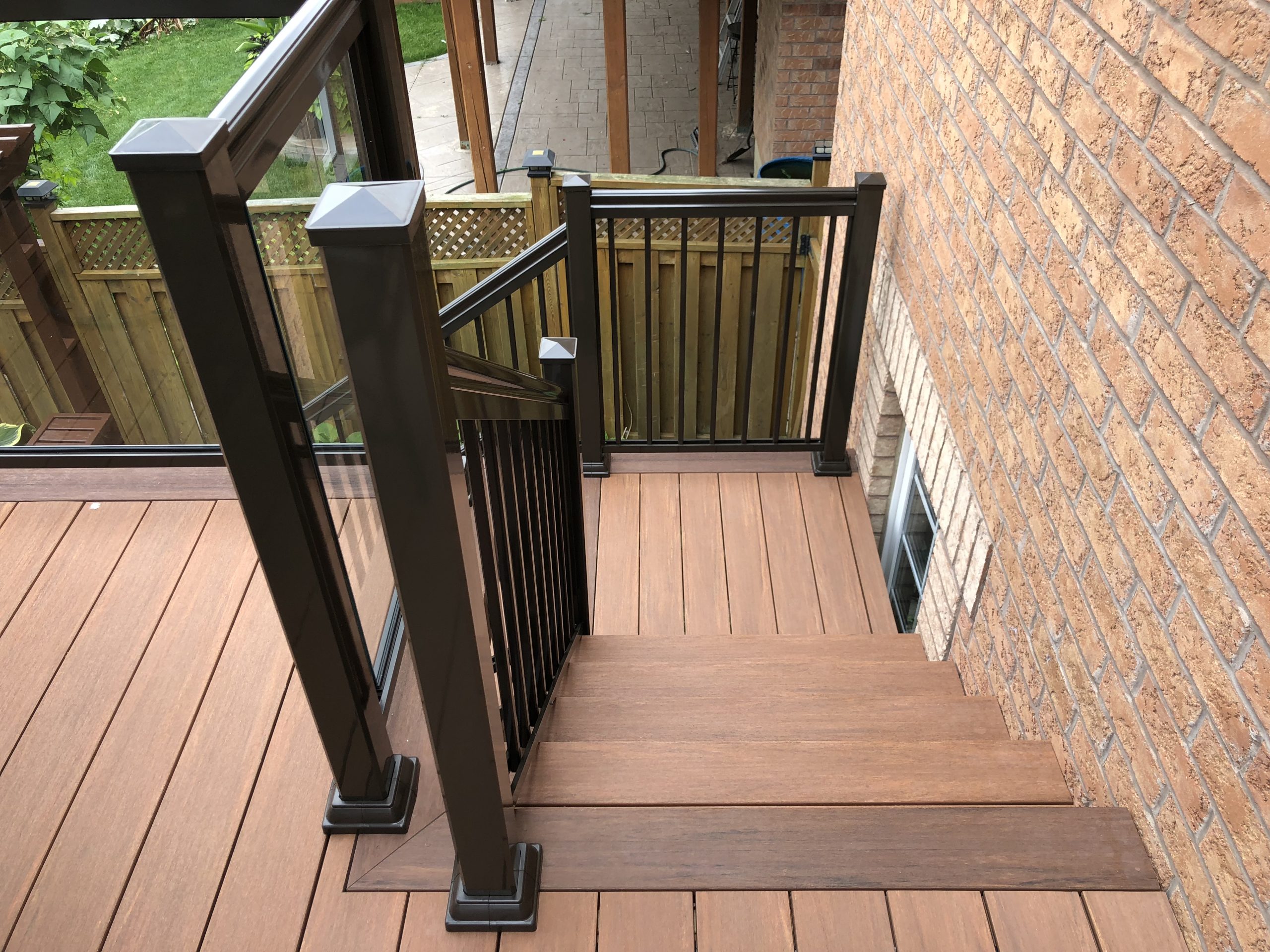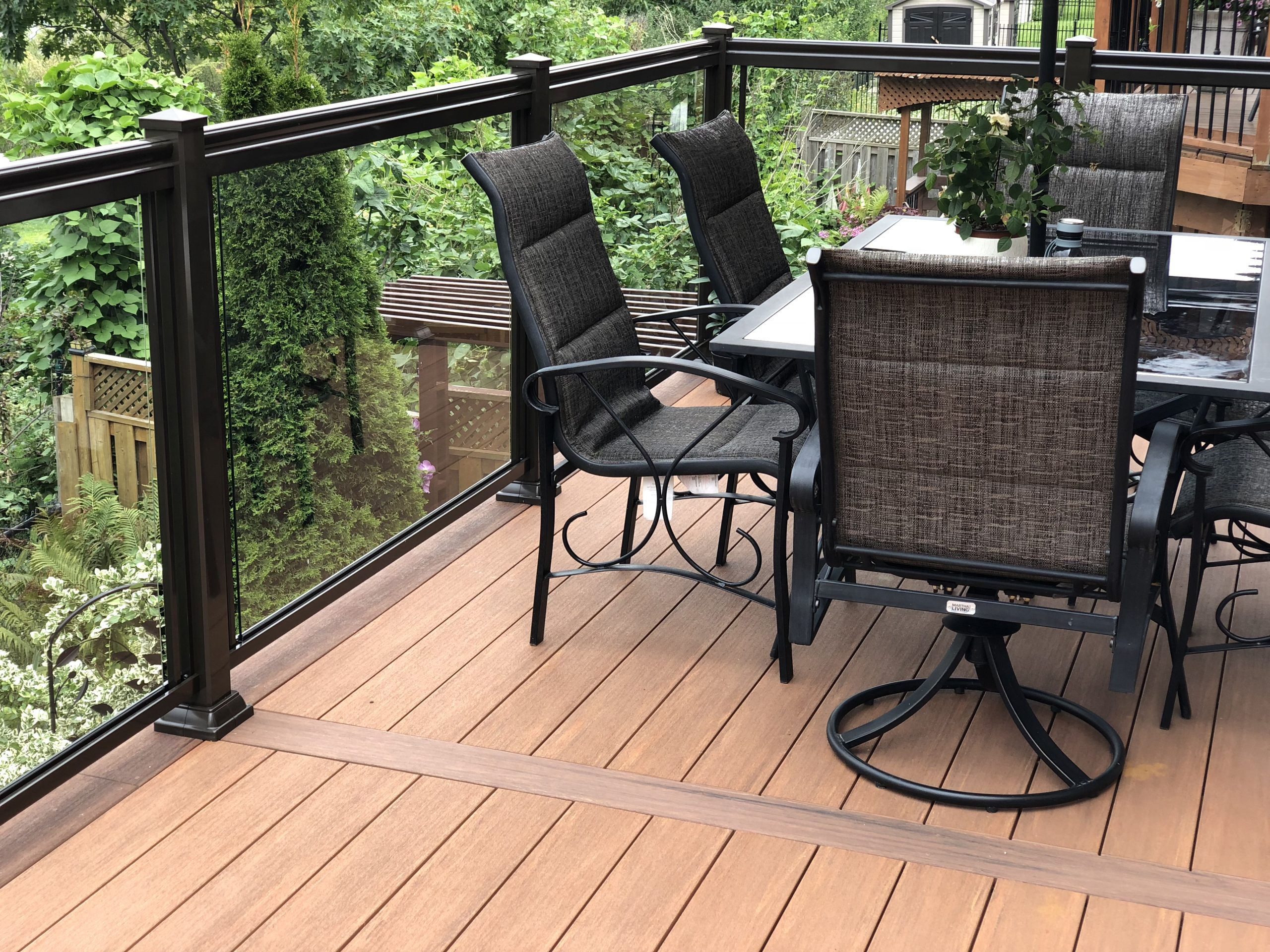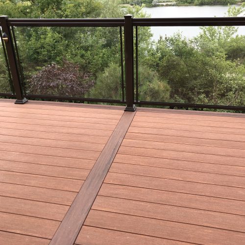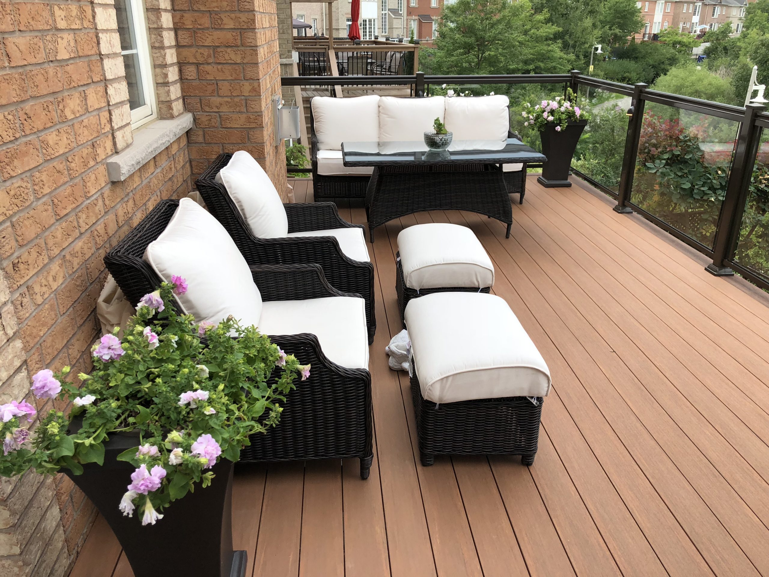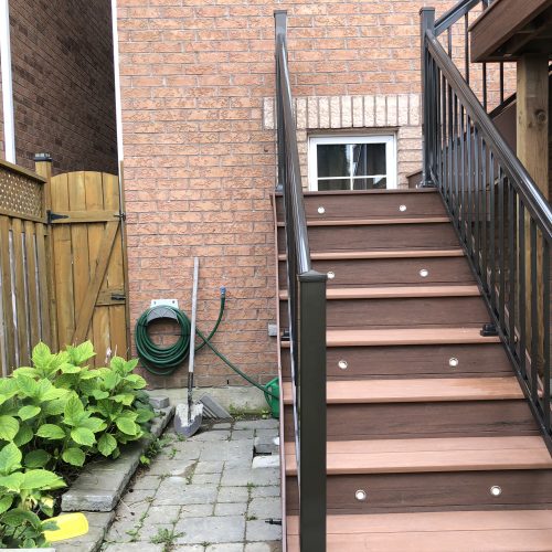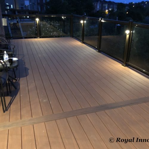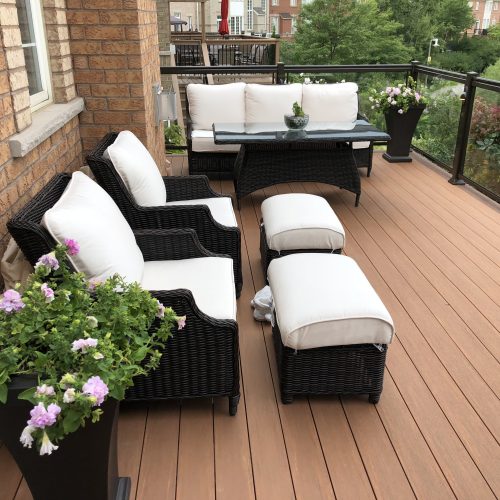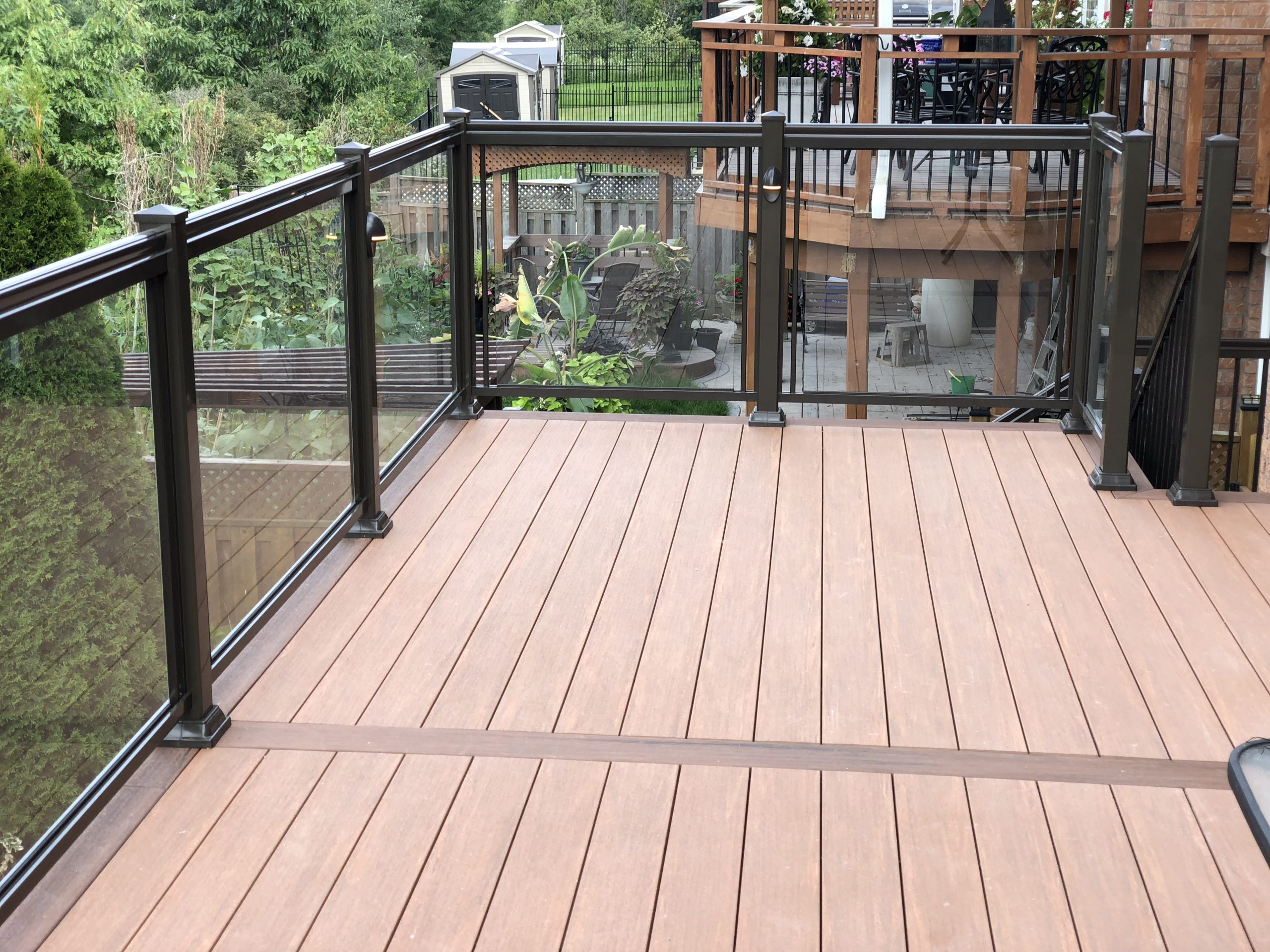 This elevated PVC deck in Richmond Hill was designed to take full advantage of the property’s natural pond view, creating a premium outdoor living space with unbeatable durability and zero maintenance. Built using high-performance PVC decking and a bronze aluminum–glass railing system, the deck offers long-term weather resistance, superior stability, and a sleek, modern aesthetic.
