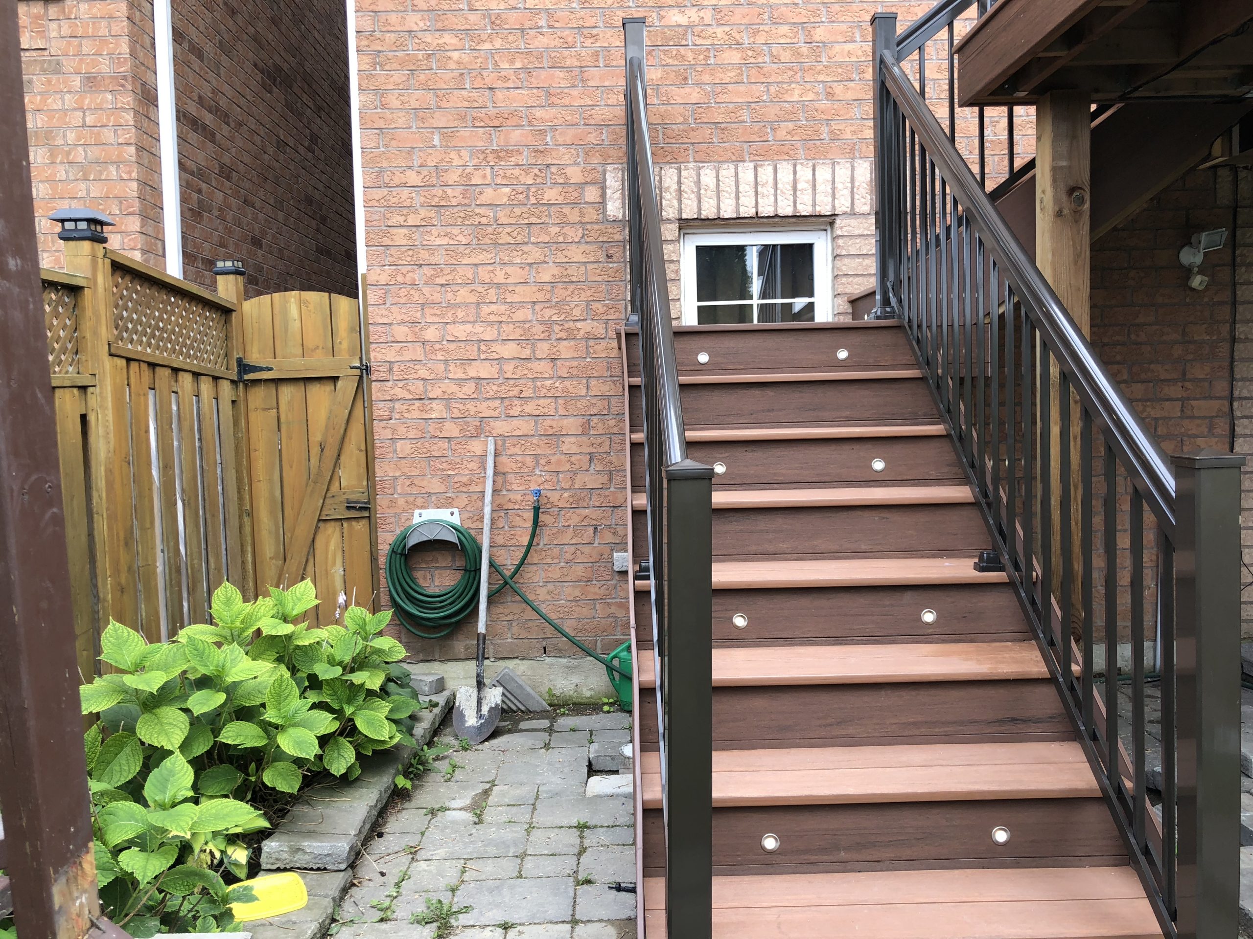A custom multi-level staircase connects the upper platform to the backyard, improving functionality and flow. With integrated LED lighting and a layout optimized for hosting,