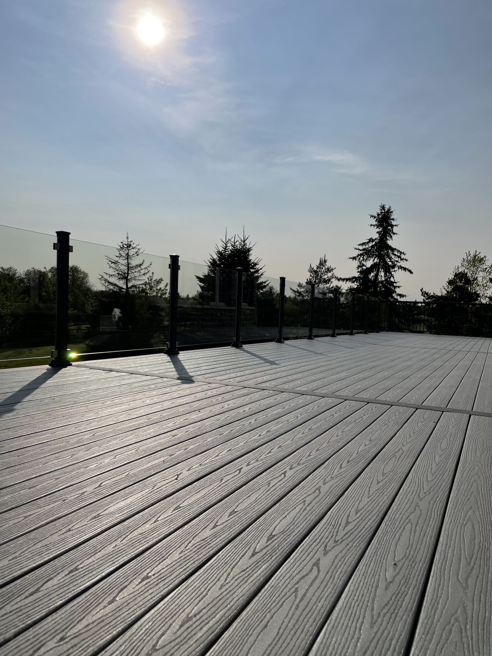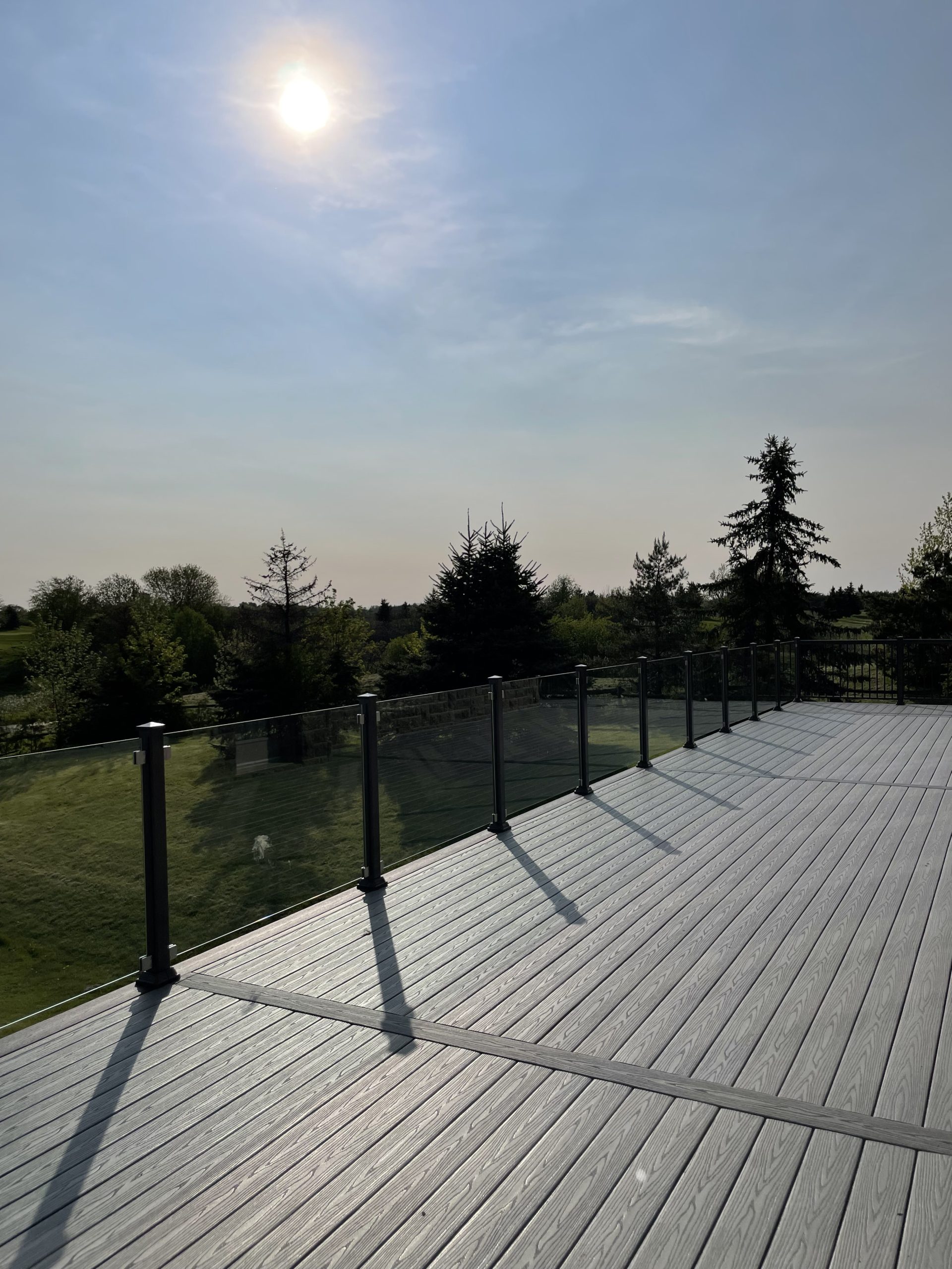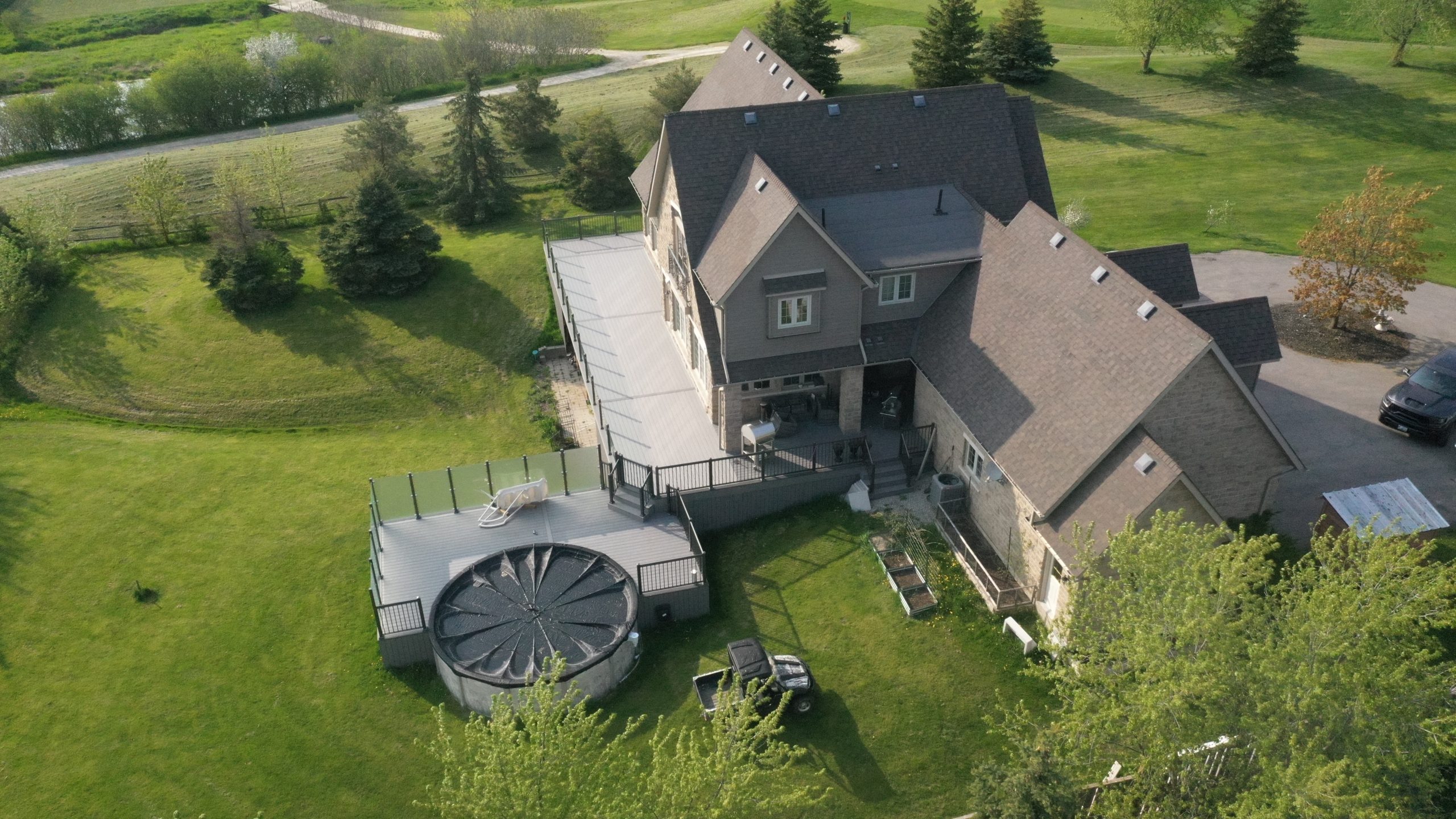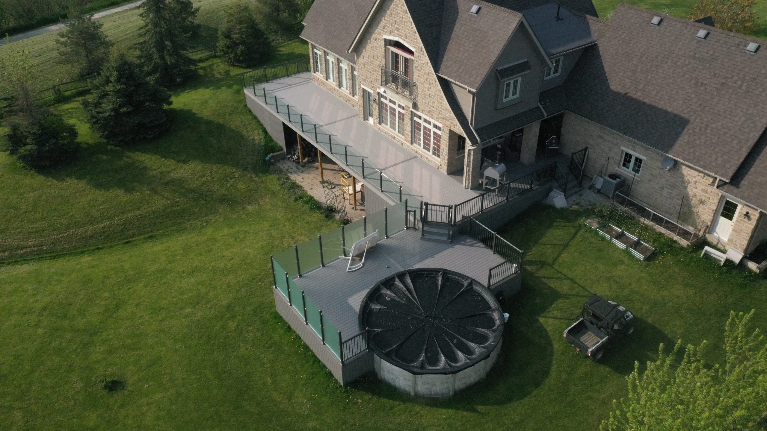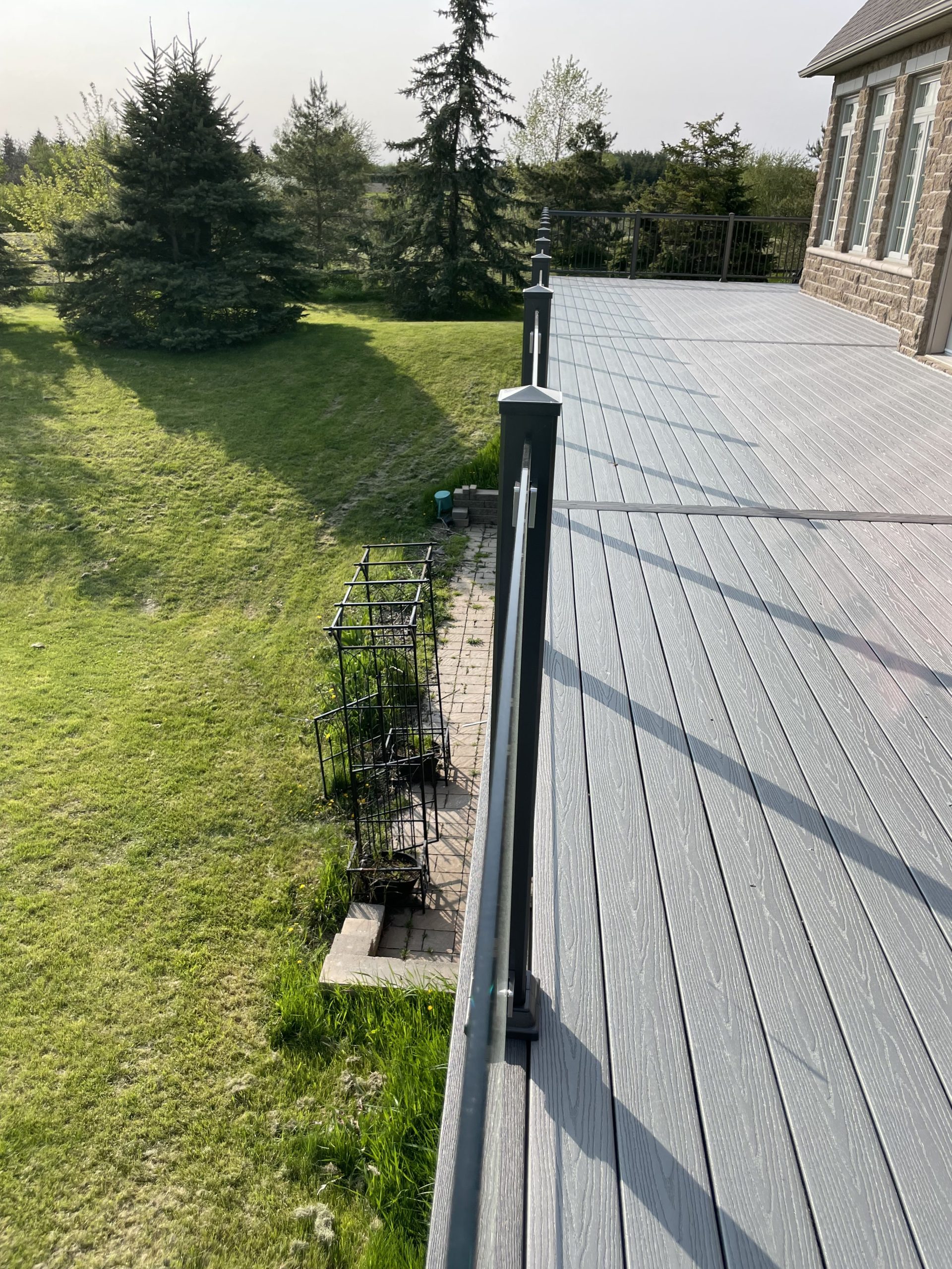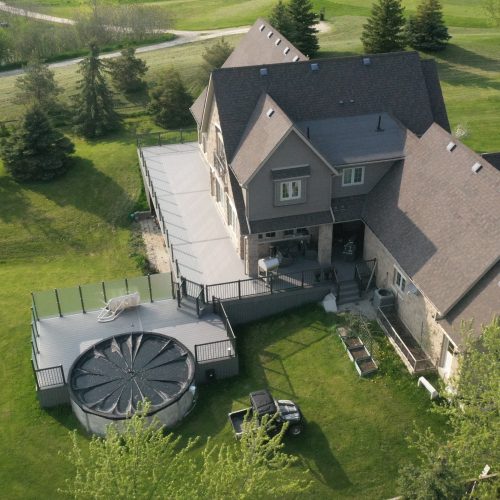 This premium estate home in rural Ontario showcases our expertise in creating sophisticated outdoor living spaces through a multi-faceted composite deck installation that maximizes breathtaking countryside views. Our team designed a comprehensive solution featuring two distinct deck areas connected by a thoughtful layout that perfectly complements the home’s grand architecture.