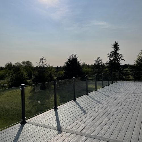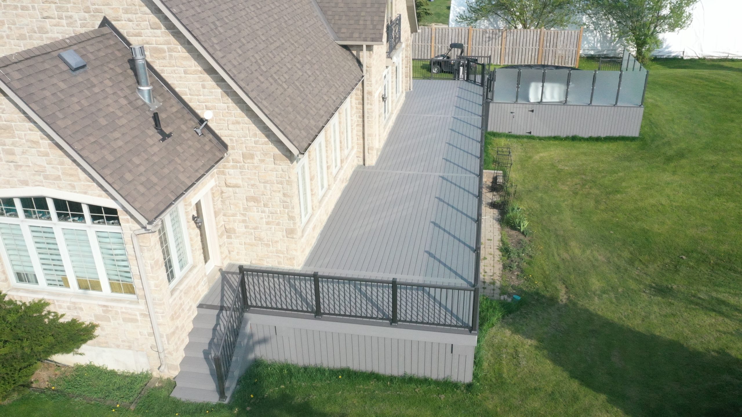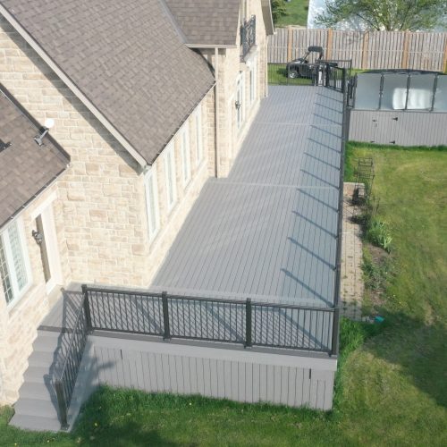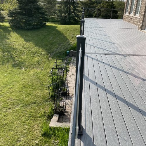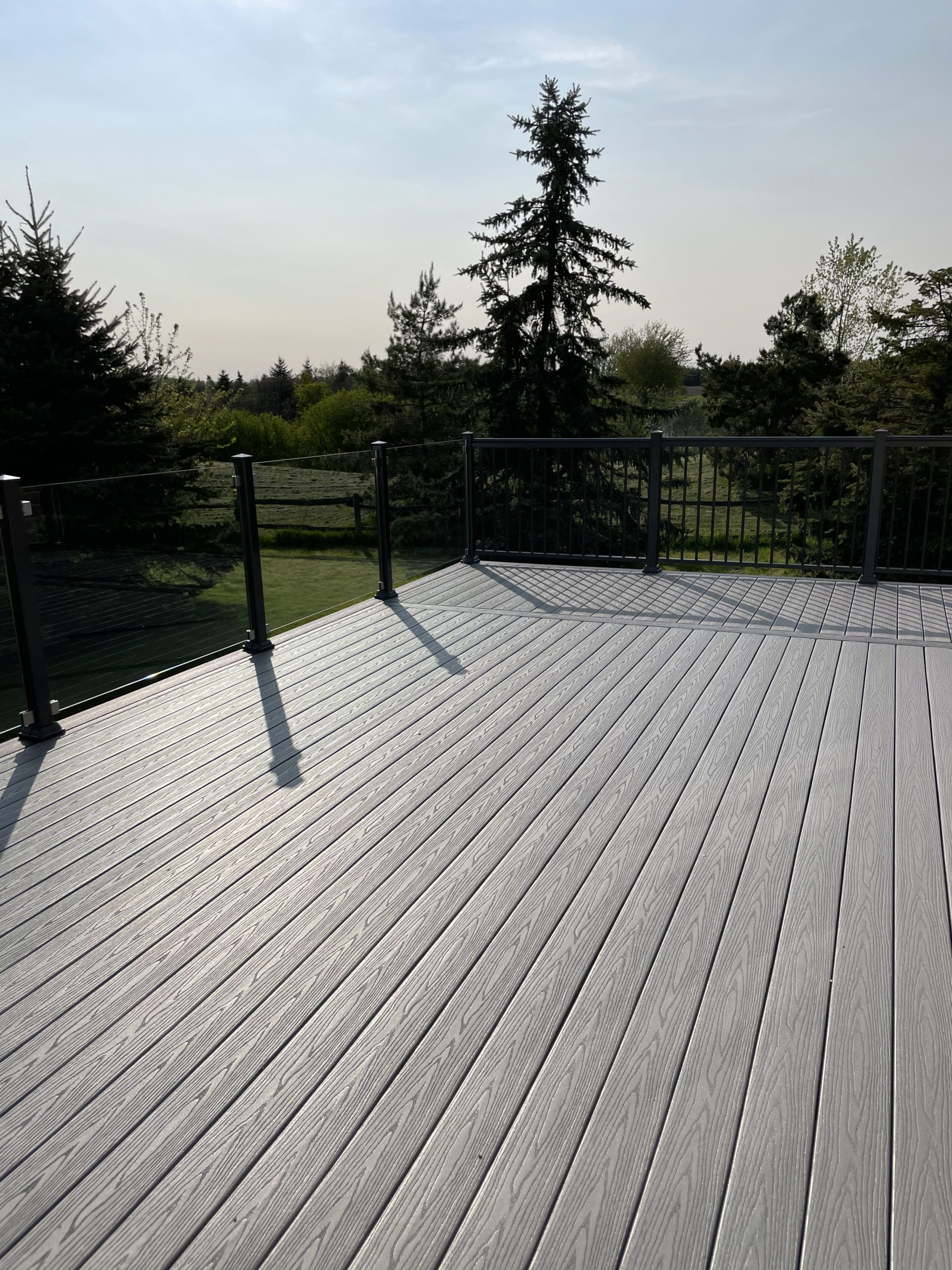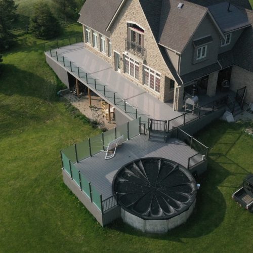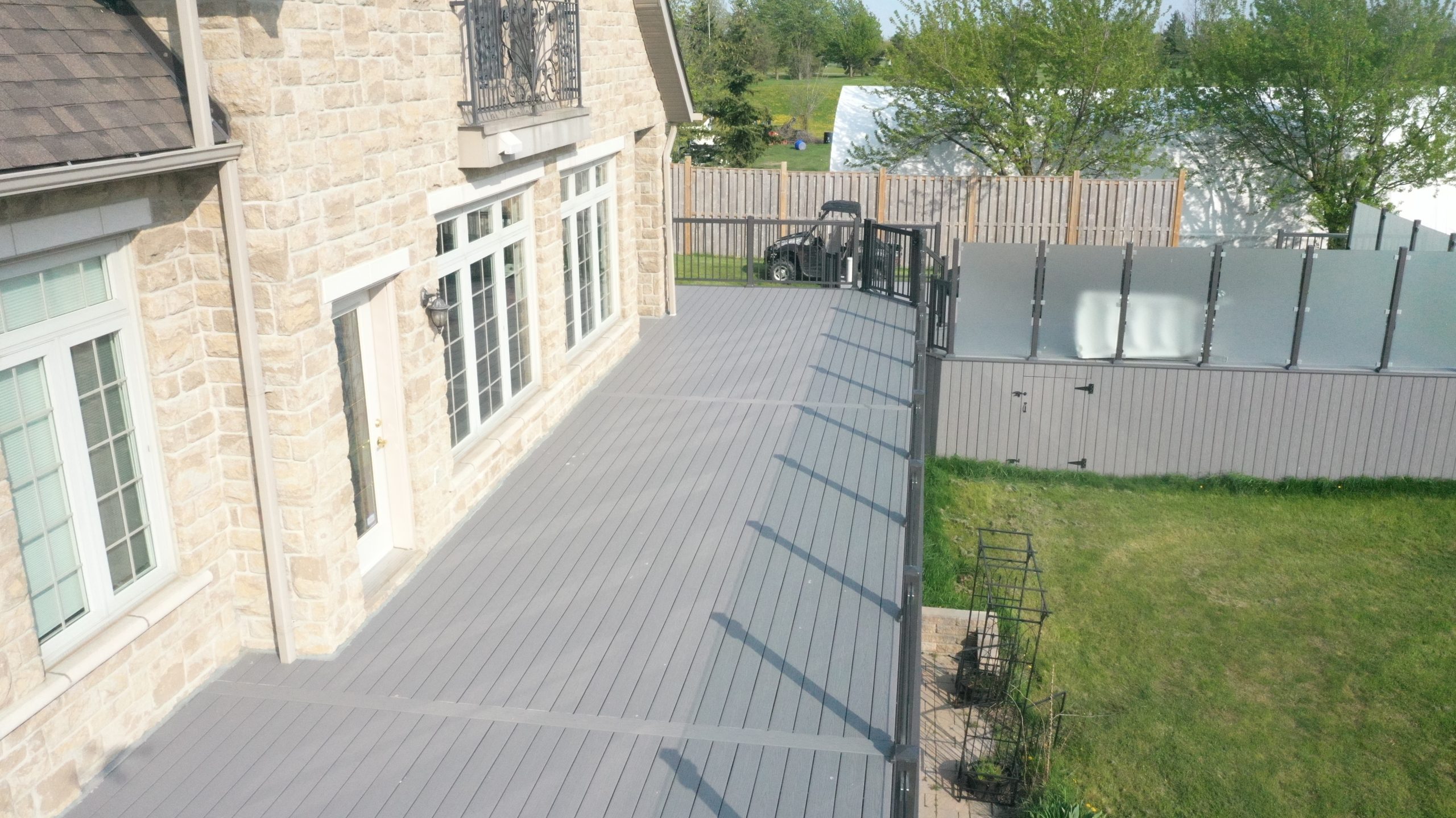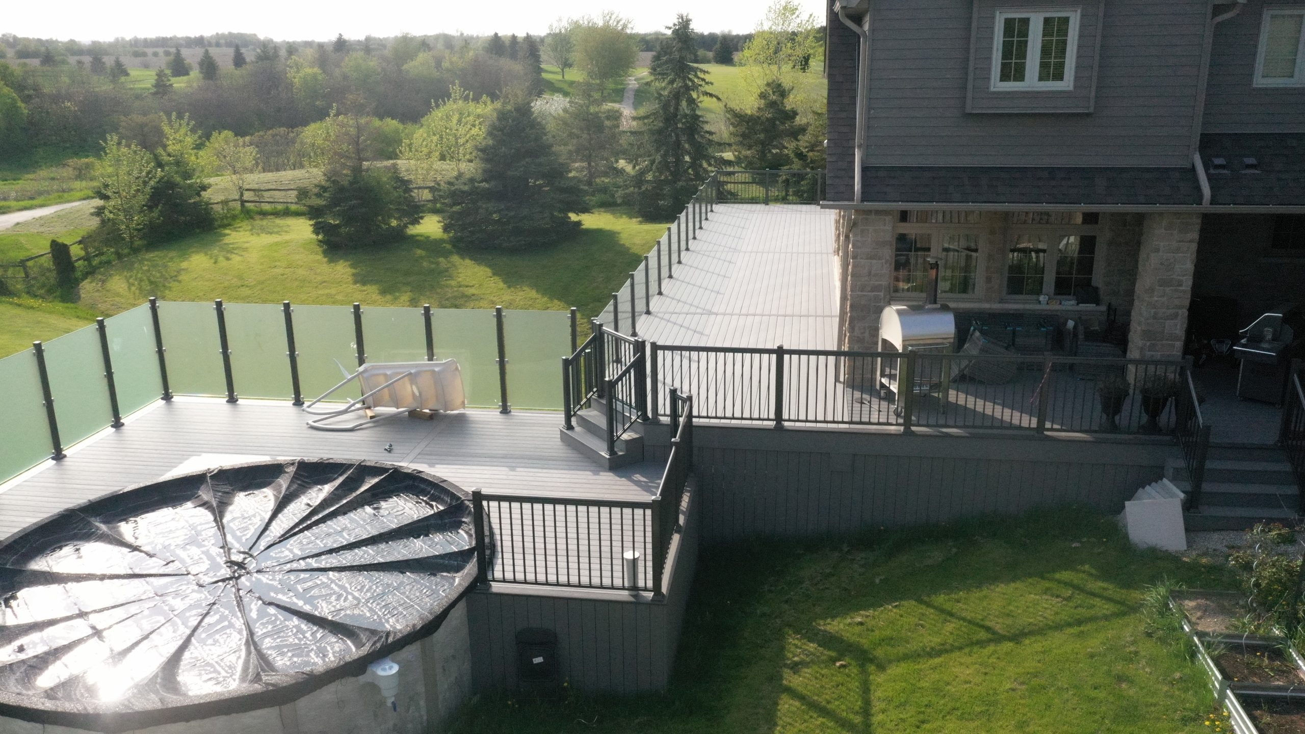 This premium estate home in rural Ontario showcases our expertise in creating sophisticated outdoor living spaces through a multi-faceted composite deck installation that maximizes breathtaking countryside views. Our team designed a comprehensive solution featuring two distinct deck areas connected by a thoughtful layout that perfectly complements the home’s grand architecture.