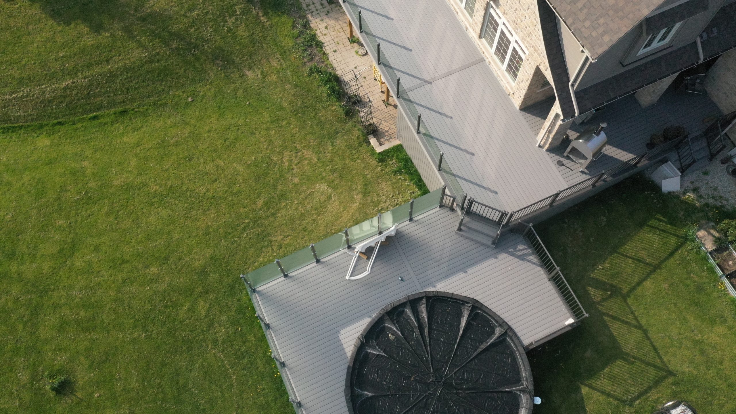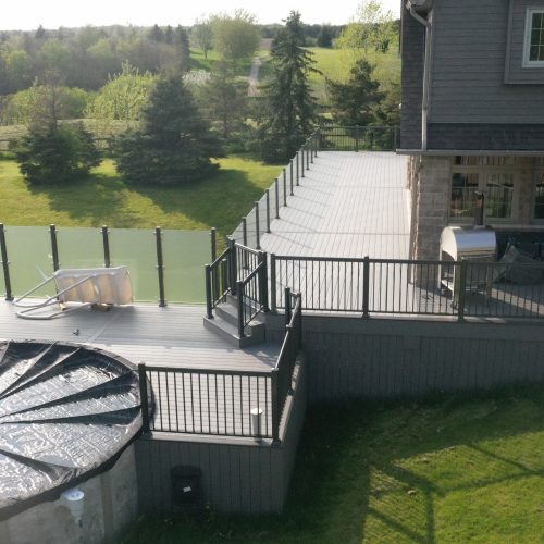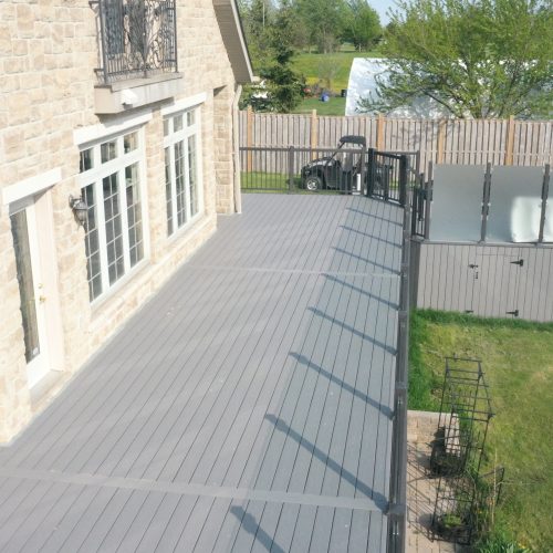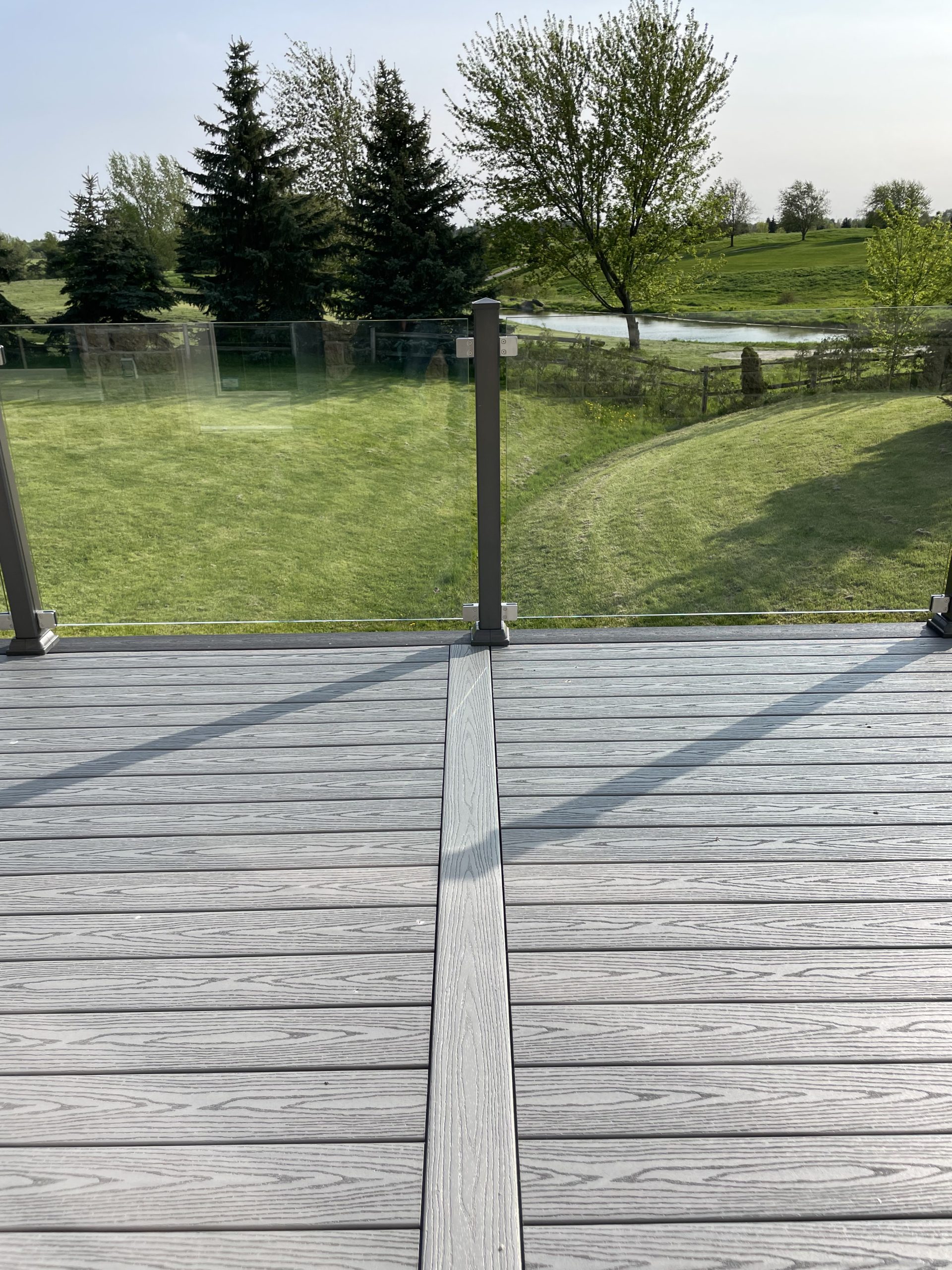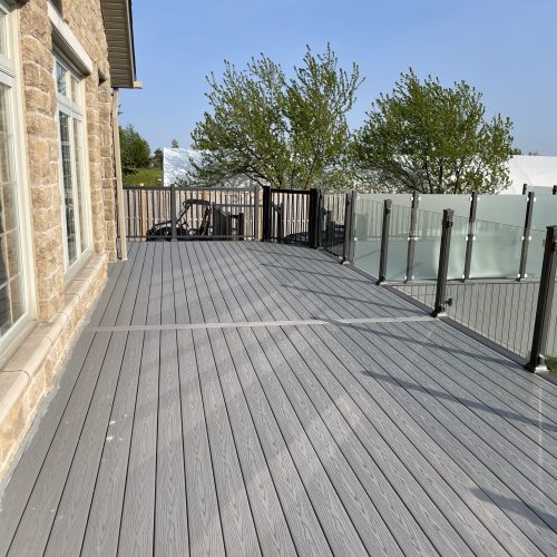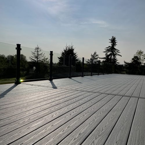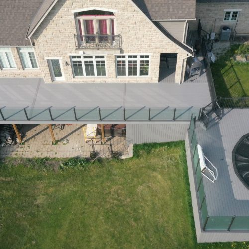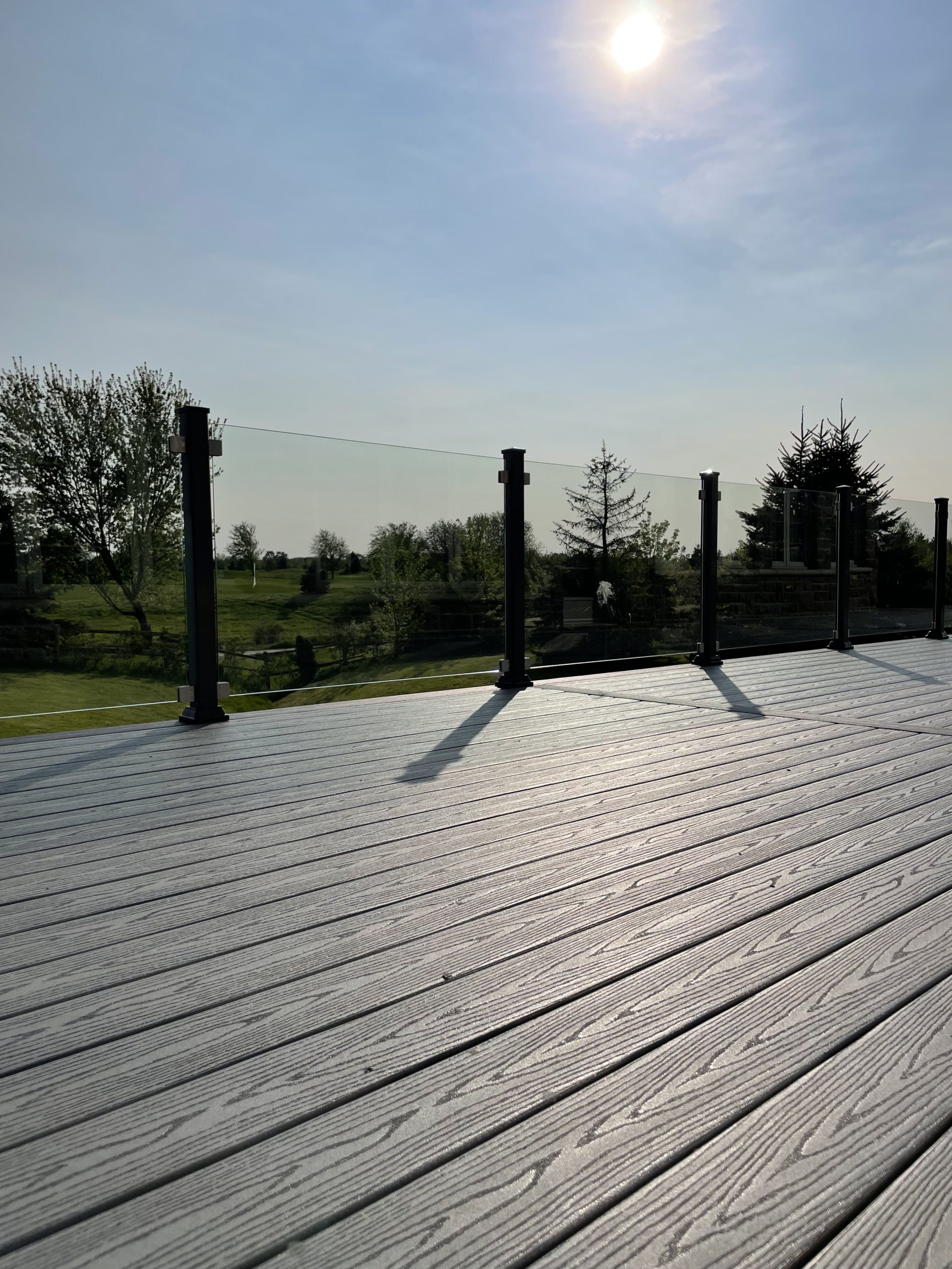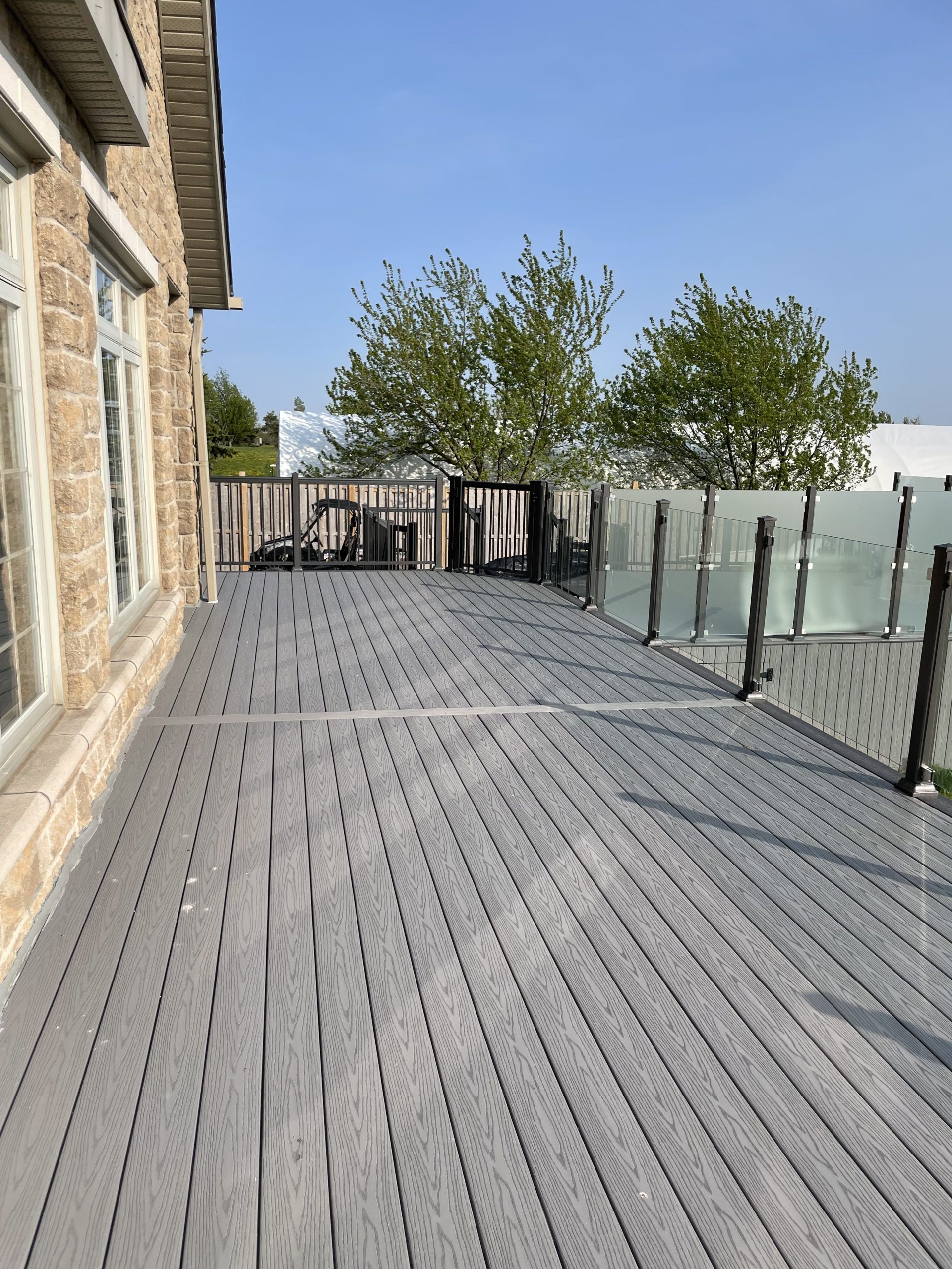 This premium estate home in rural Ontario showcases our expertise in creating sophisticated outdoor living spaces through a multi-faceted composite deck installation that maximizes breathtaking countryside views. Our team designed a comprehensive solution featuring two distinct deck areas connected by a thoughtful layout that perfectly complements the home’s grand architecture.