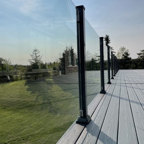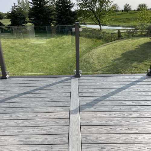 The main elevated deck extends along the home’s rear facade, providing sweeping views across the rolling landscape and nearby water feature. We selected premium gray composite decking for its exceptional weather resistance and refined appearance, installing it in a meticulous board pattern with hidden fasteners for a flawless surface. The integrated glass panel railing system with minimalist posts preserves unobstructed panoramic vistas while meeting all safety requirements.