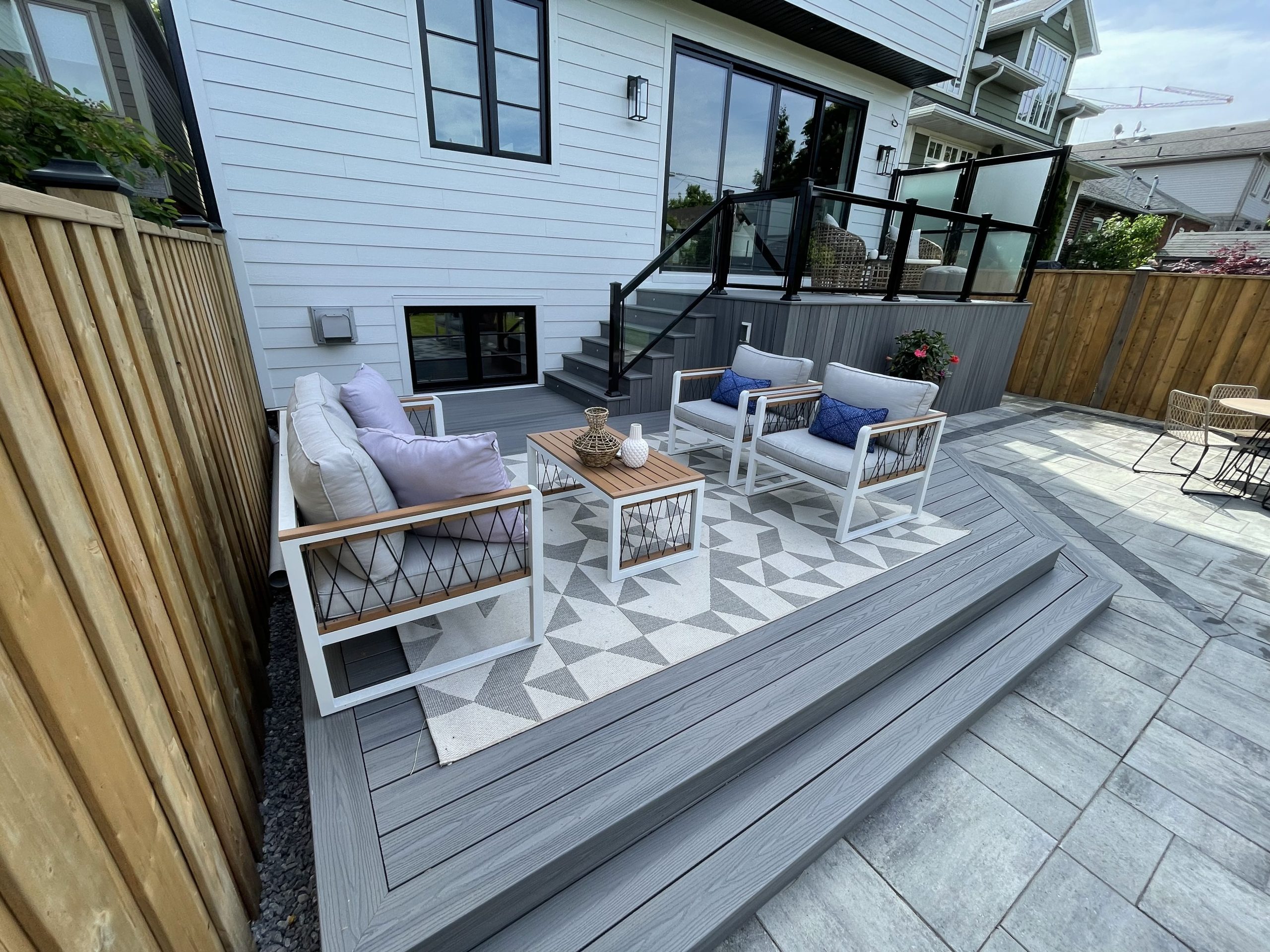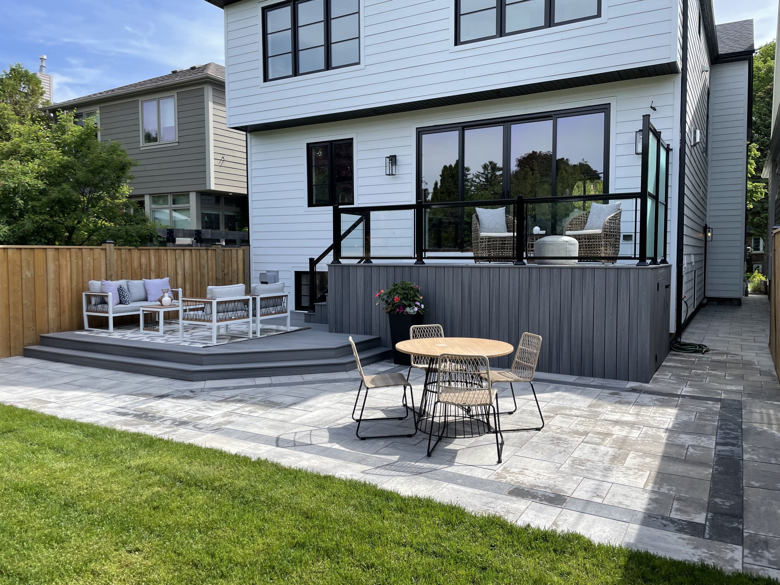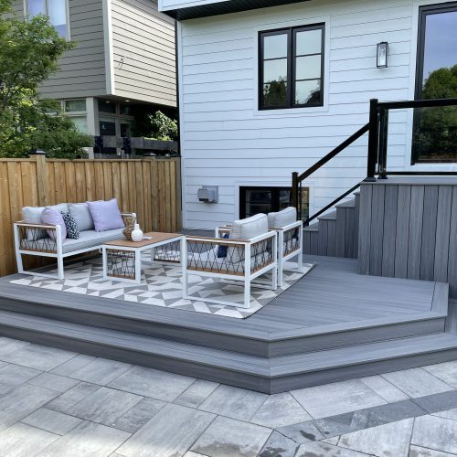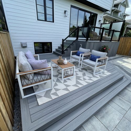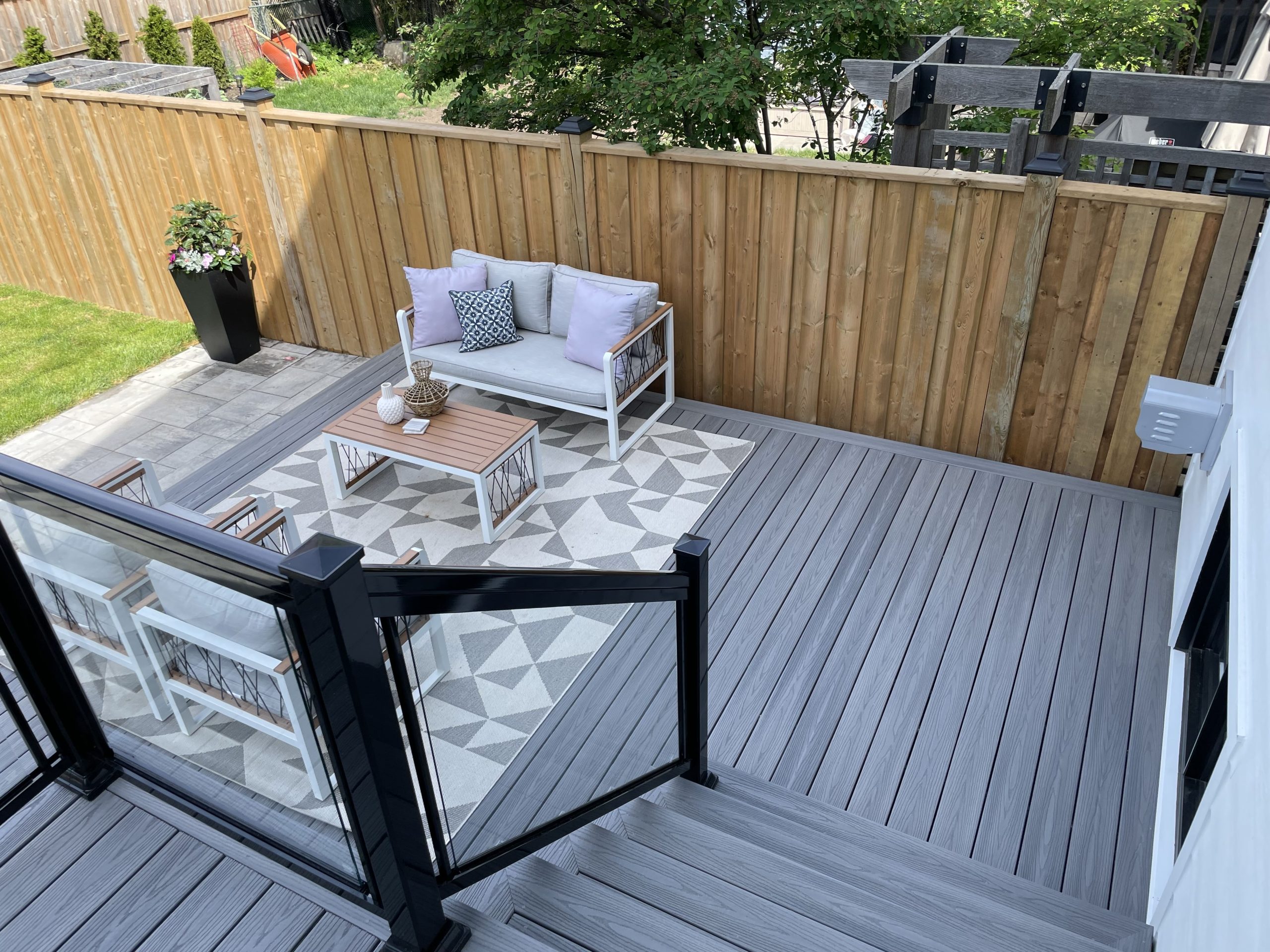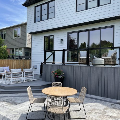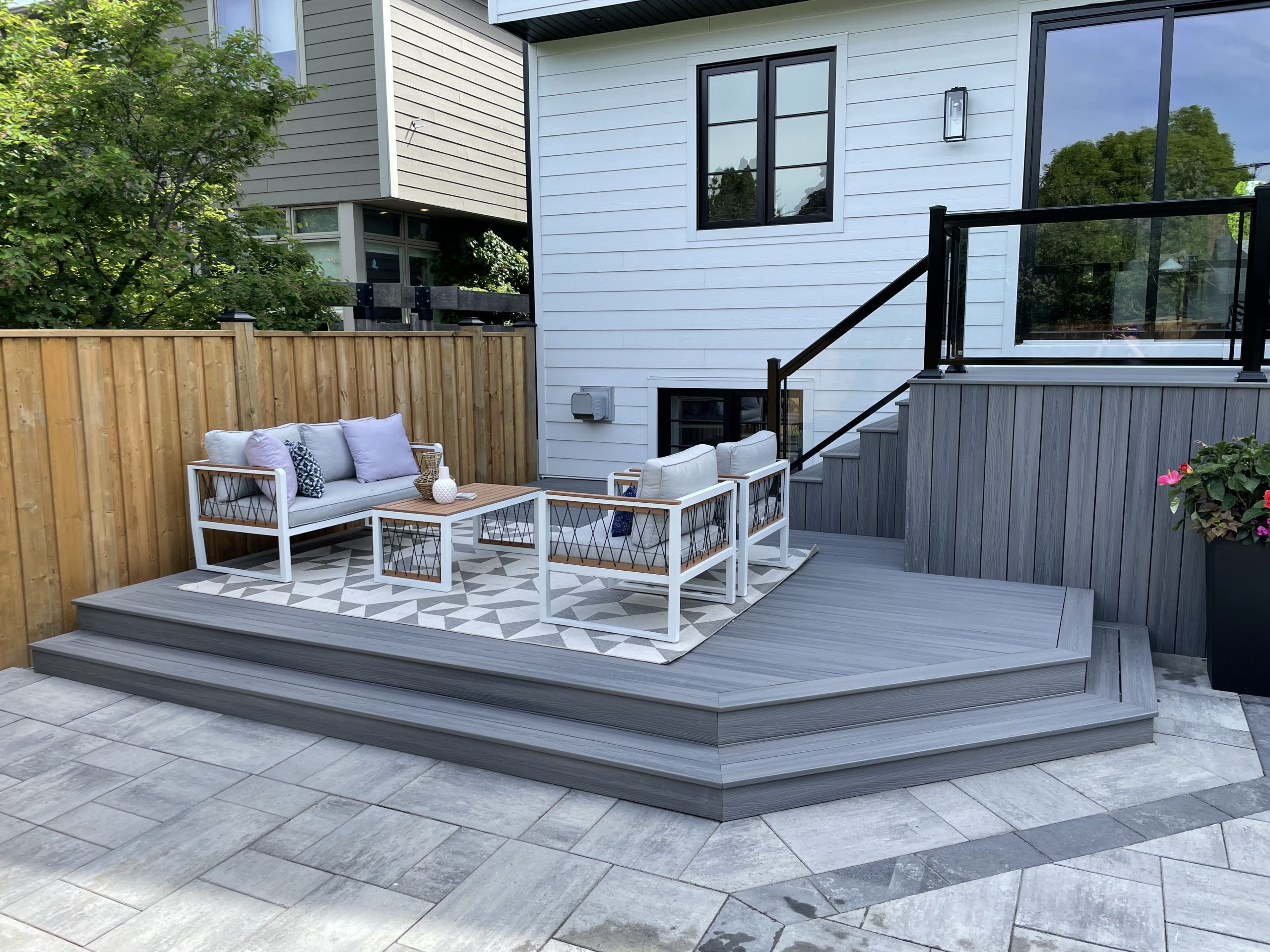 This modern Toronto residence features a sophisticated multi-level outdoor living solution that maximizes functionality in a compact urban setting. Our design team created a cohesive outdoor environment with a low-maintenance composite deck in a refined silver-gray tone that complements the home’s contemporary aesthetic.