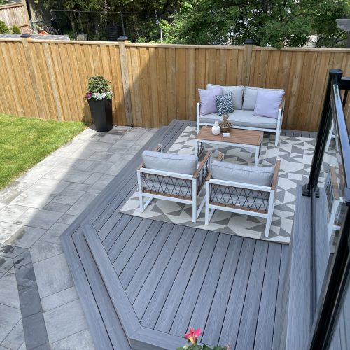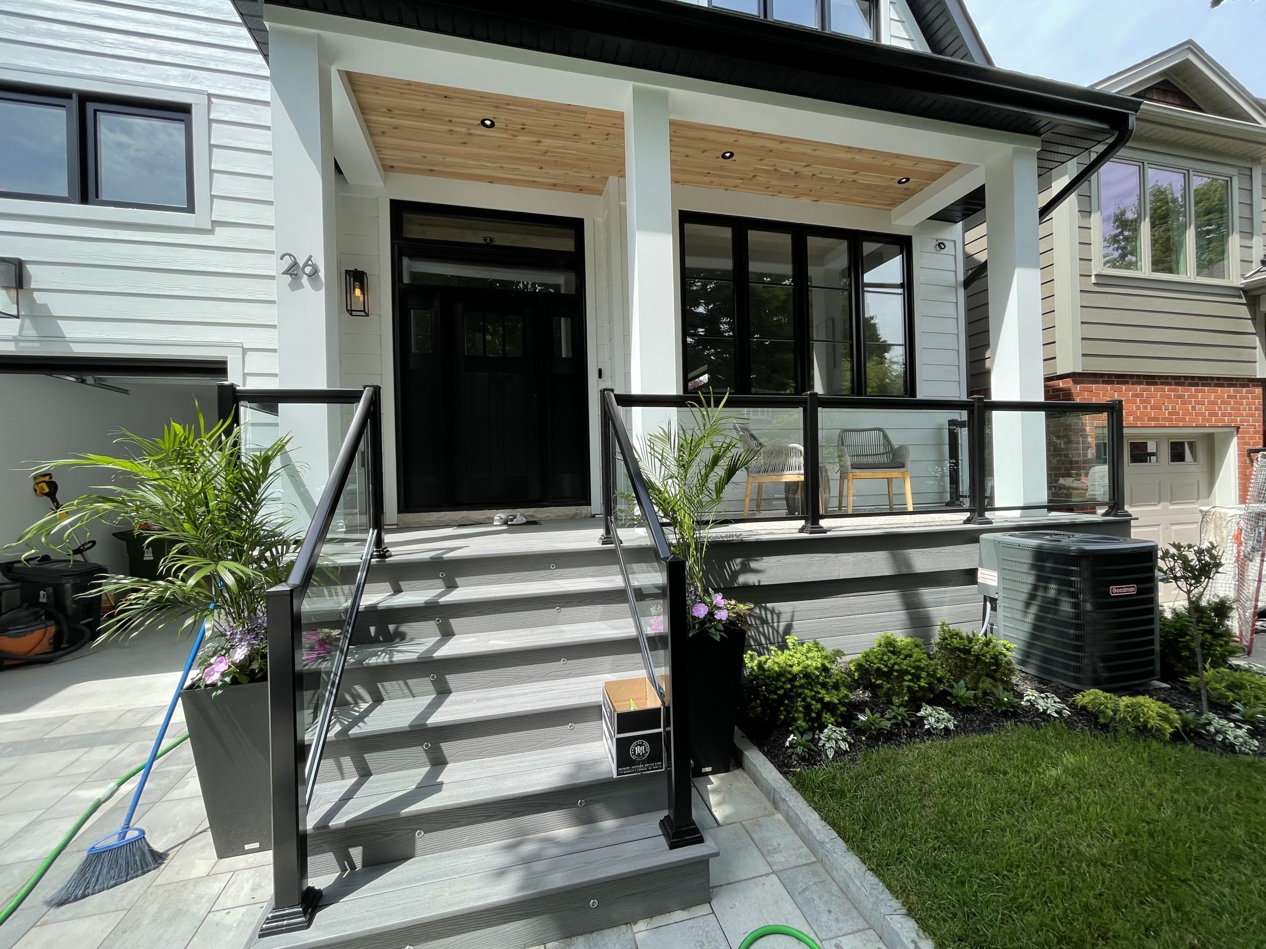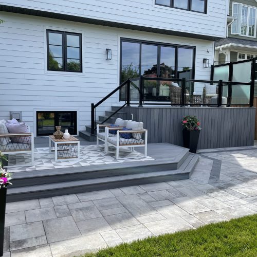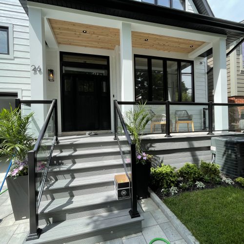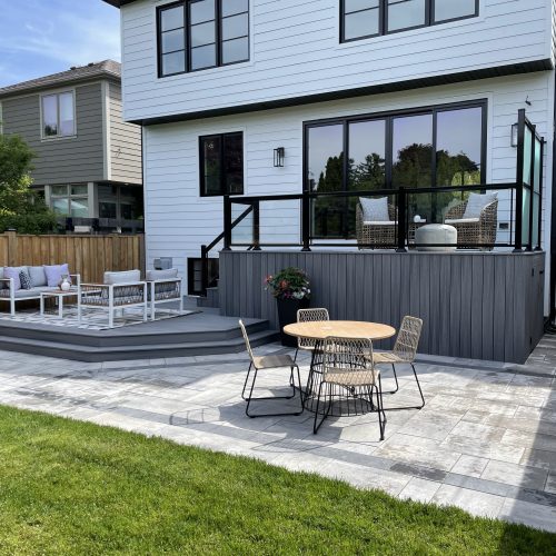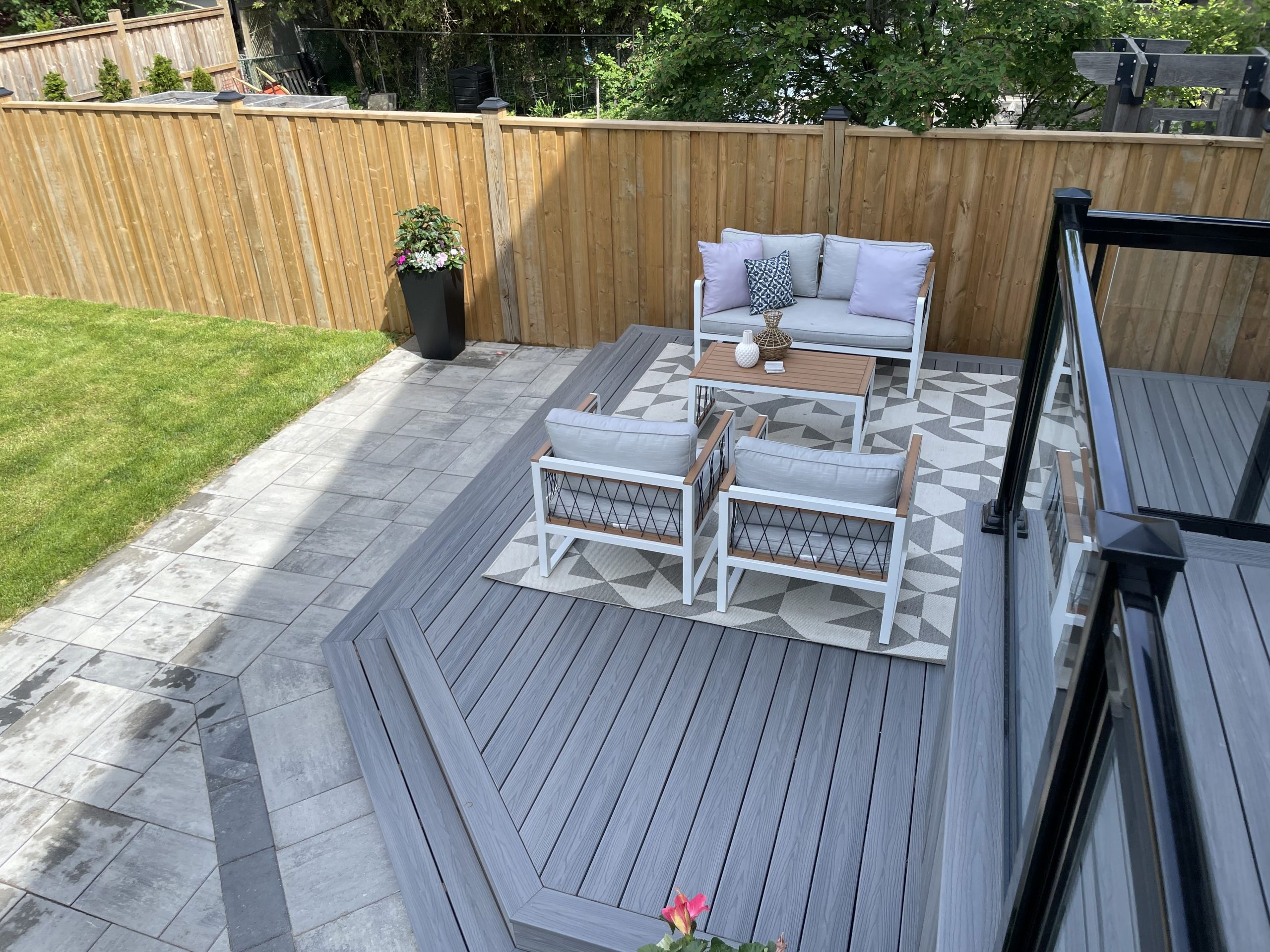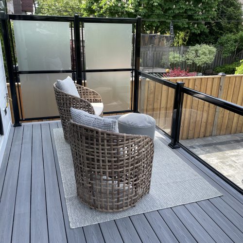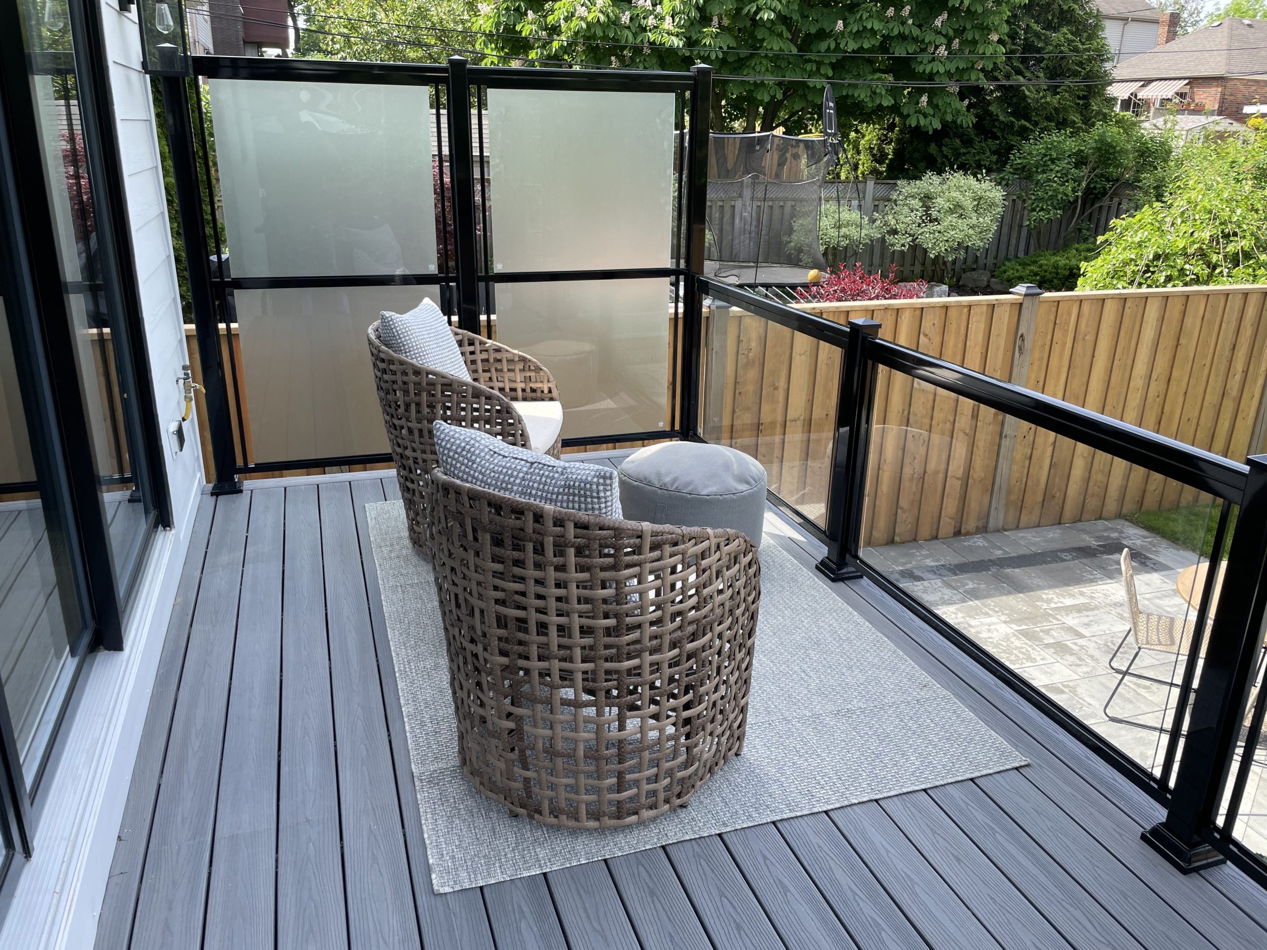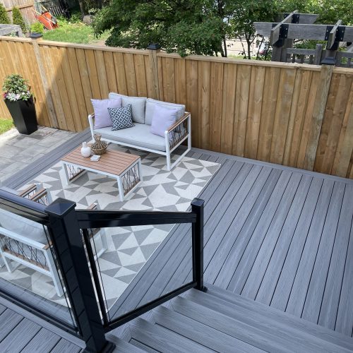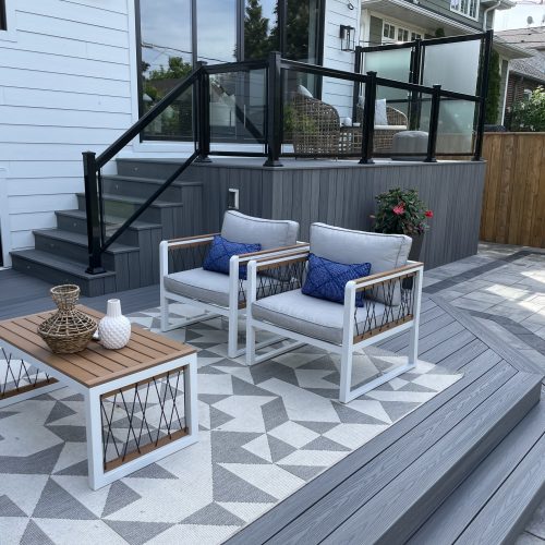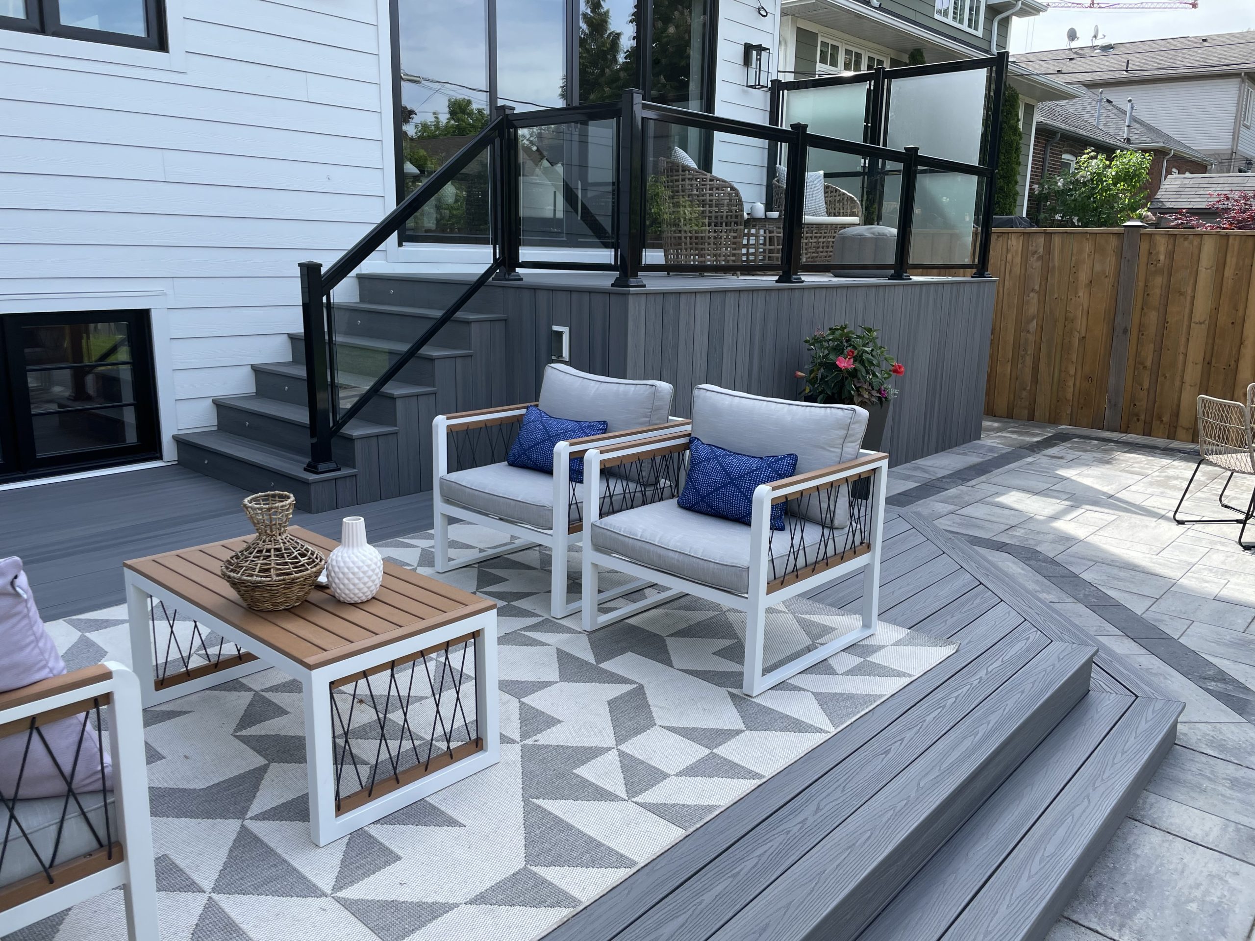 This modern Toronto residence features a sophisticated multi-level outdoor living solution that maximizes functionality in a compact urban setting. Our design team created a cohesive outdoor environment with a low-maintenance composite deck in a refined silver-gray tone that complements the home’s contemporary aesthetic.