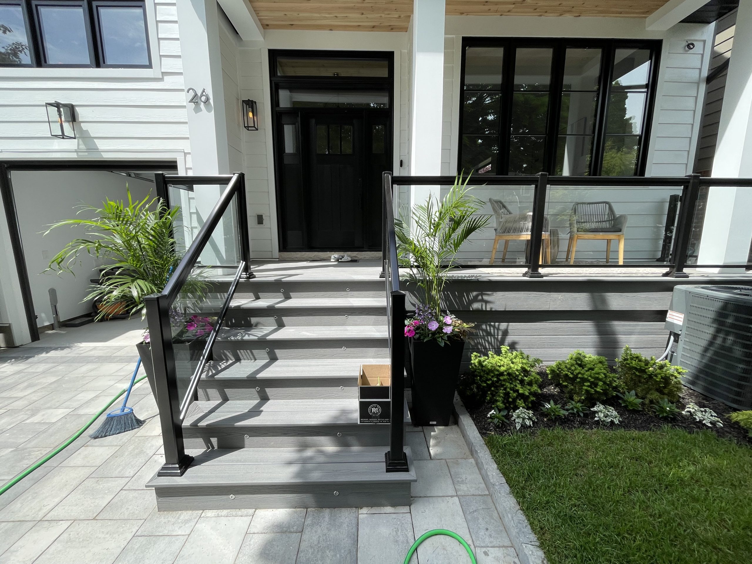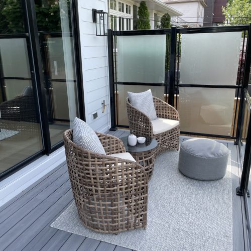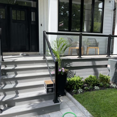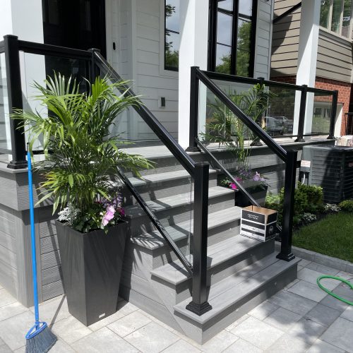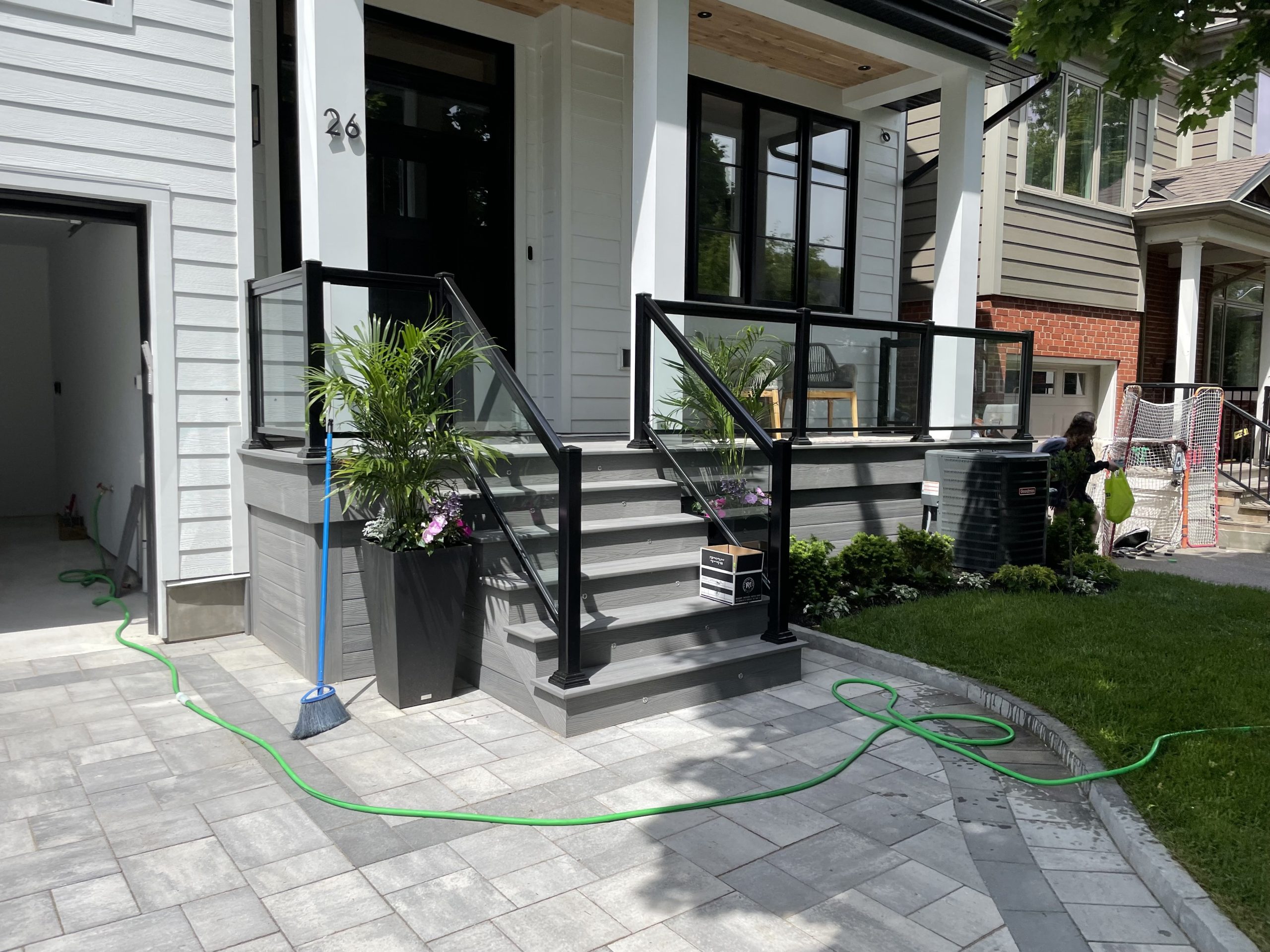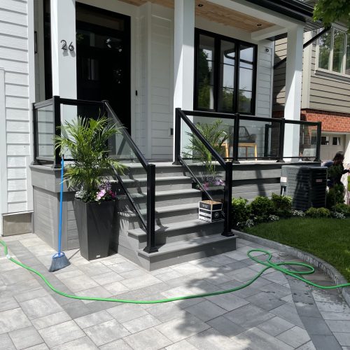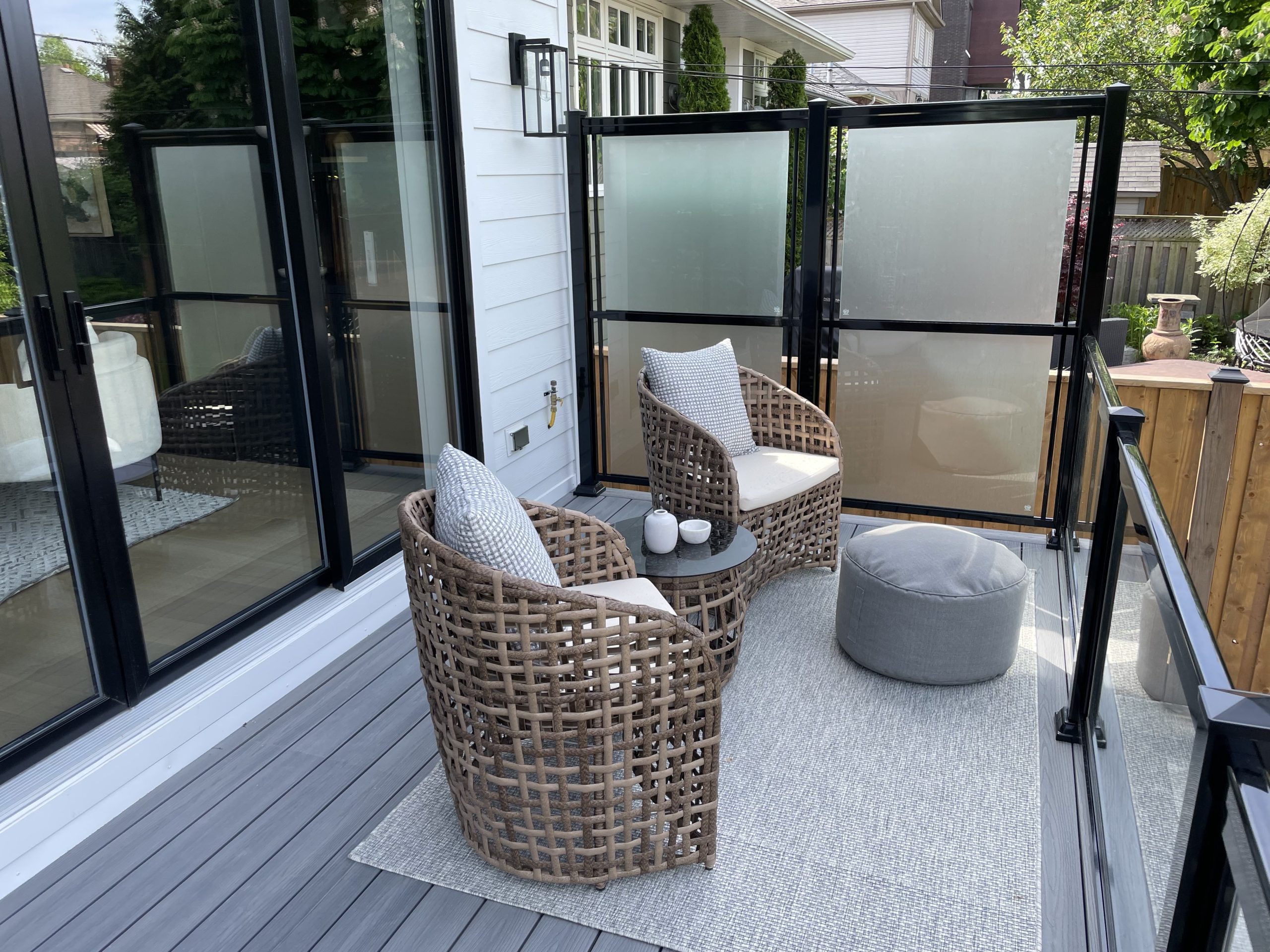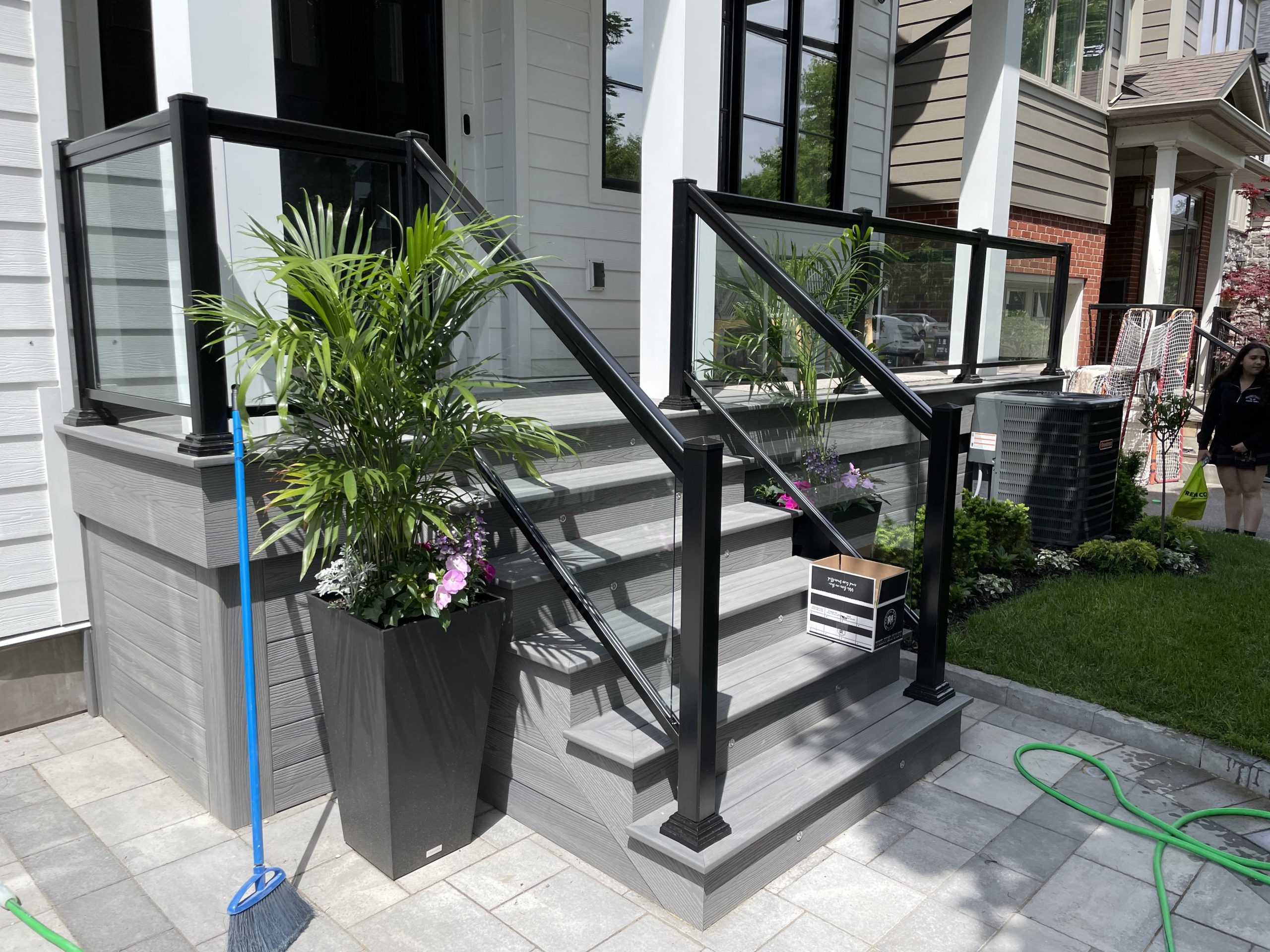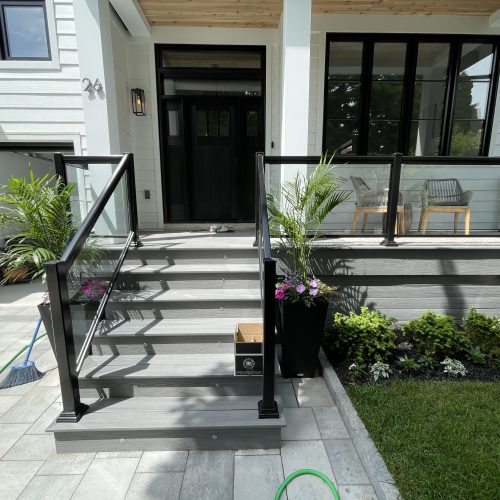 This modern Toronto residence features a sophisticated multi-level outdoor living solution that maximizes functionality in a compact urban setting. Our design team created a cohesive outdoor environment with a low-maintenance composite deck in a refined silver-gray tone that complements the home’s contemporary aesthetic.