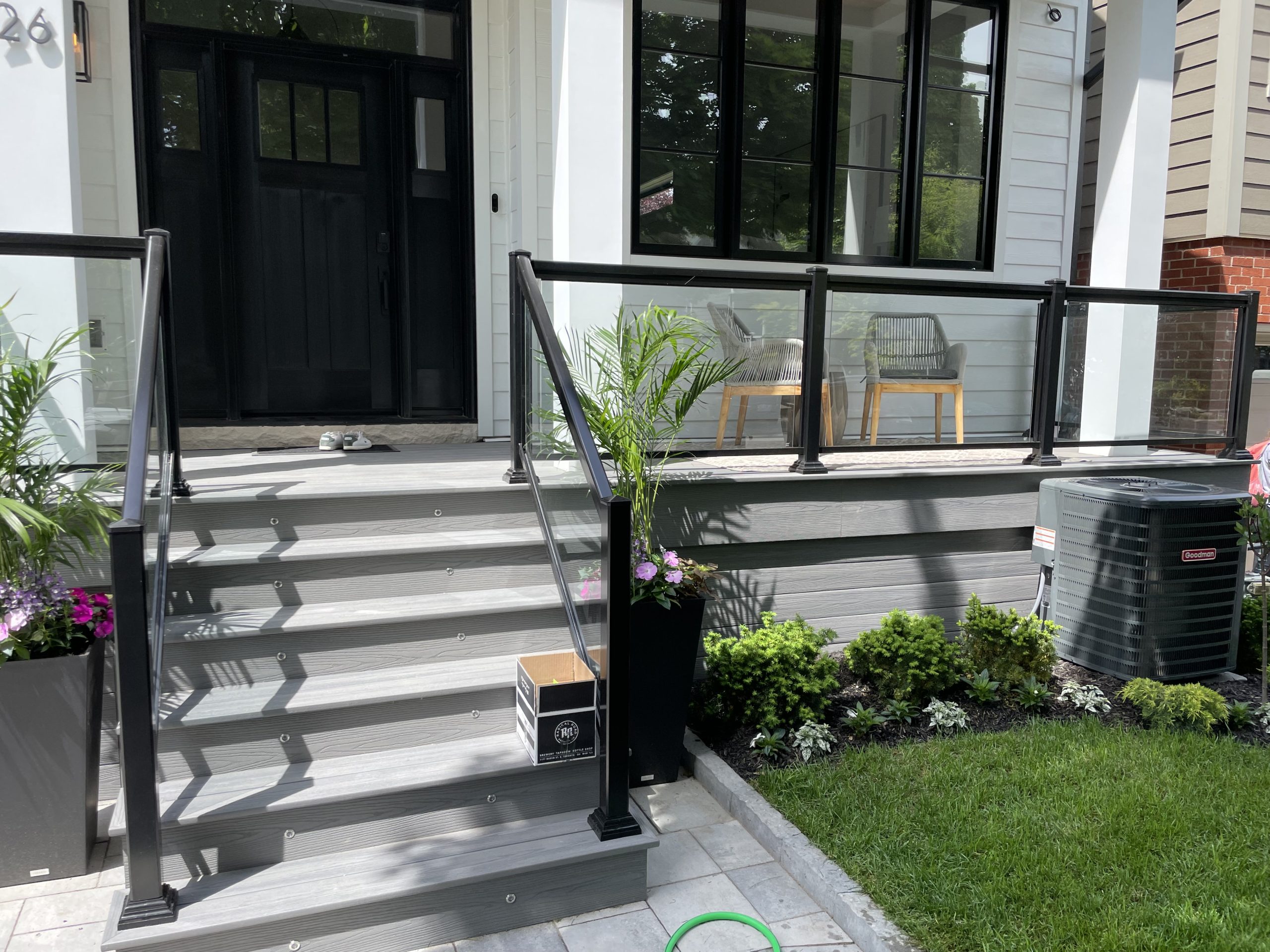 The custom deck design incorporates multiple elevations to create distinct functional zones: an elevated composite deck with glass panel railings provides an intimate dining area, while the lower deck level creates a dedicated conversation space with custom furnishings. This thoughtful deck construction showcases our ability to create architectural interest while optimizing available space.