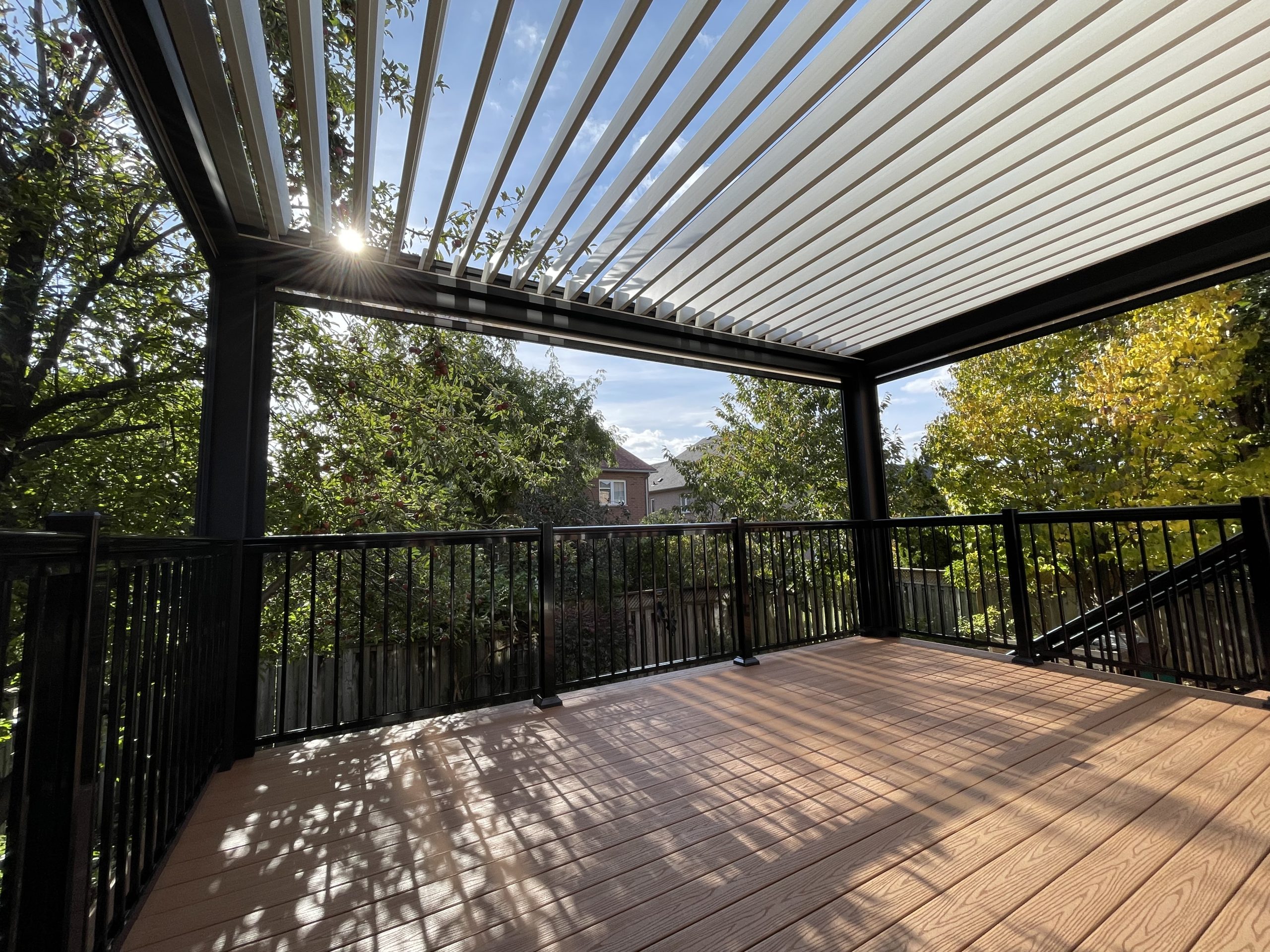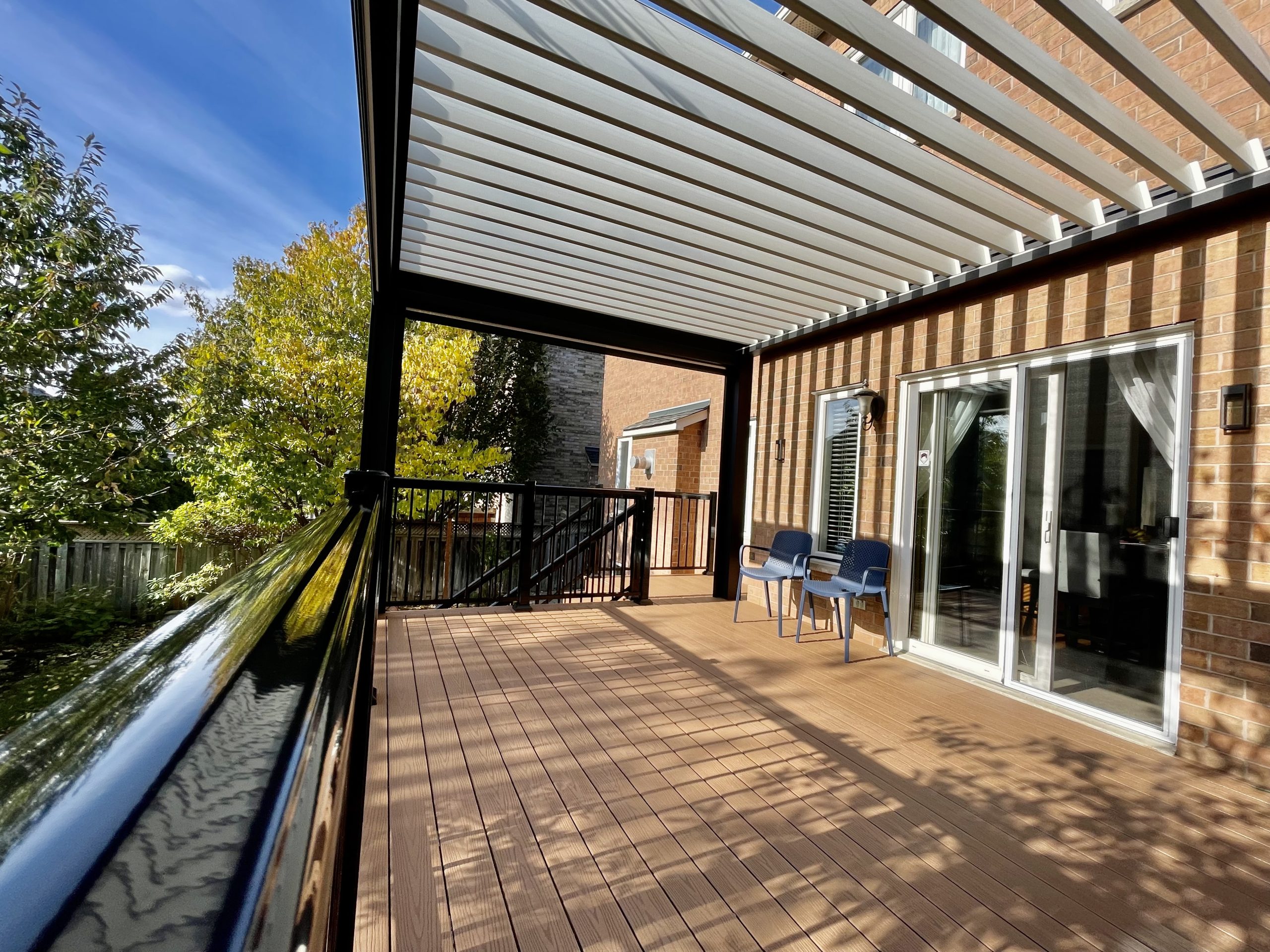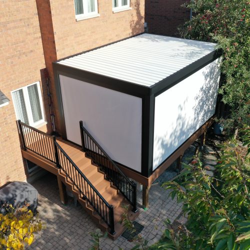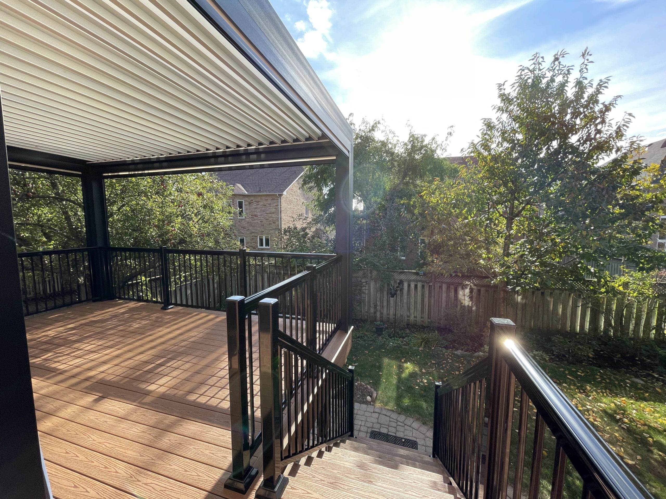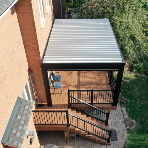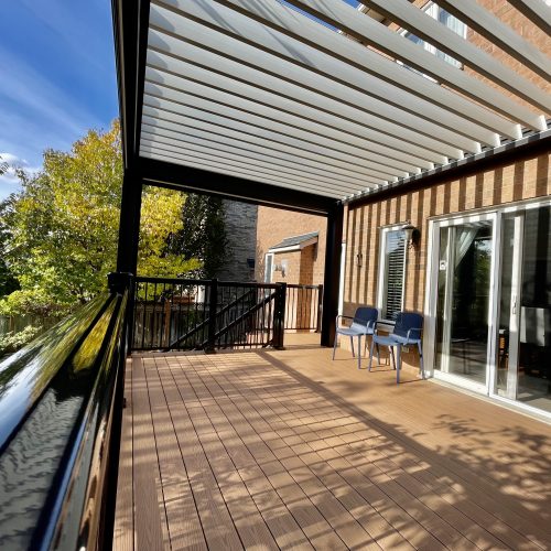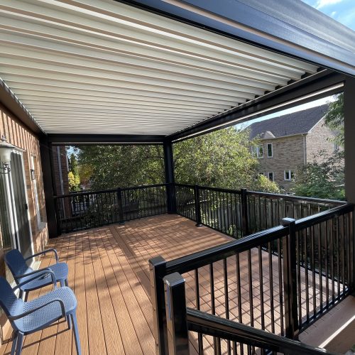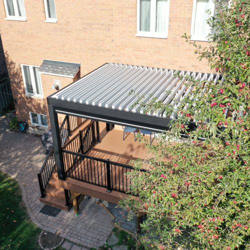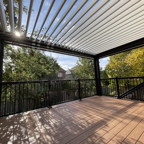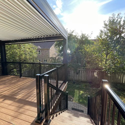 This Richmond Hill project features a custom elevated deck integrated with a premium motorized aluminum louver pergola. The design combines high-performance composite decking with adjustable louvers that provide precise climate control, extending the usability of this outdoor space throughout the seasons.