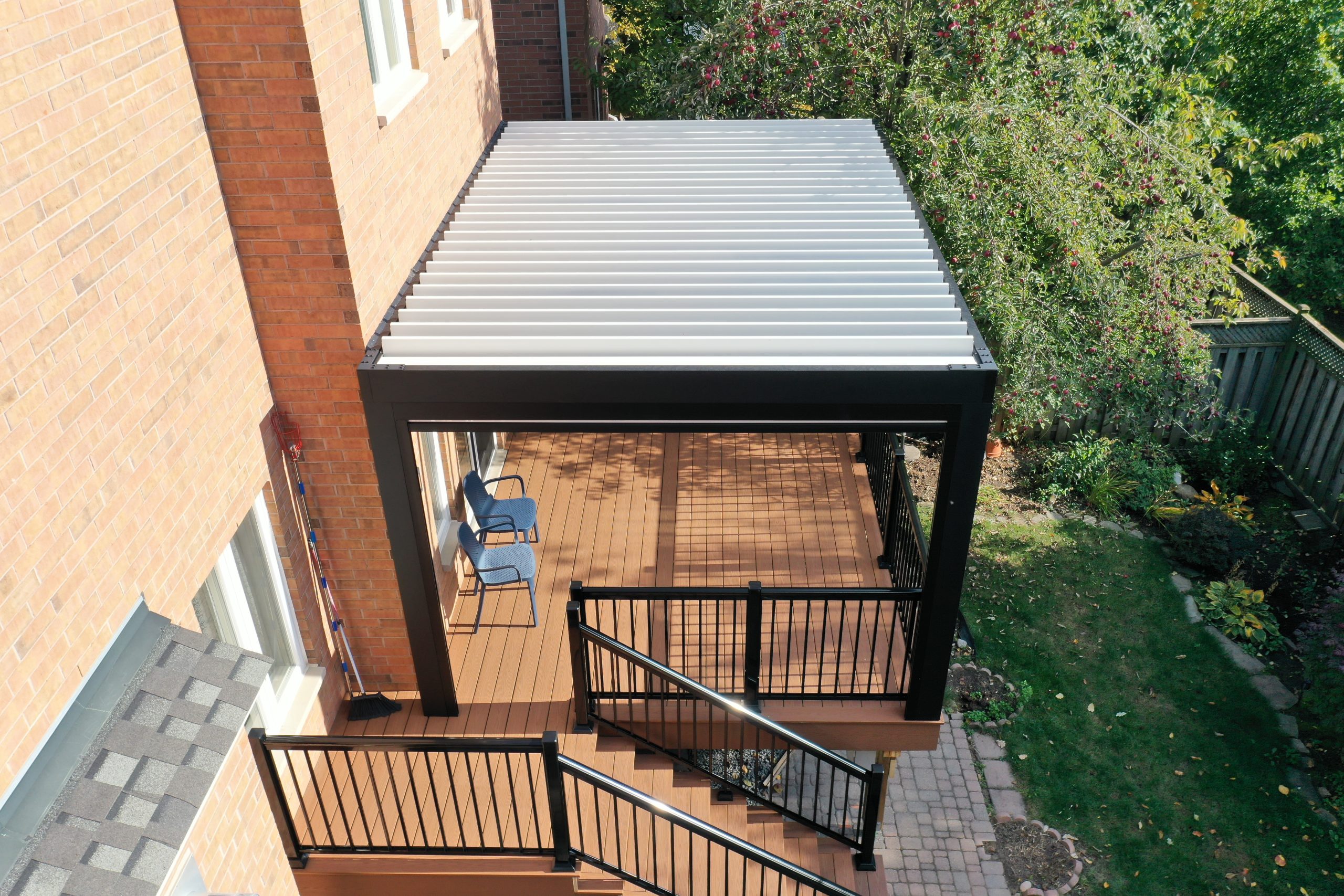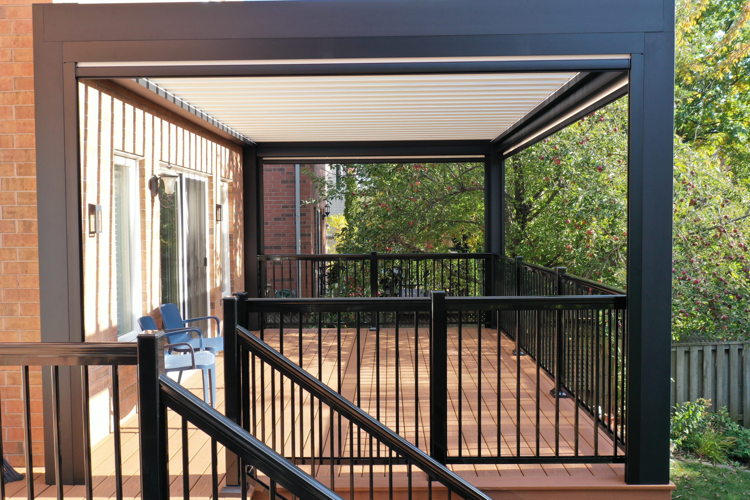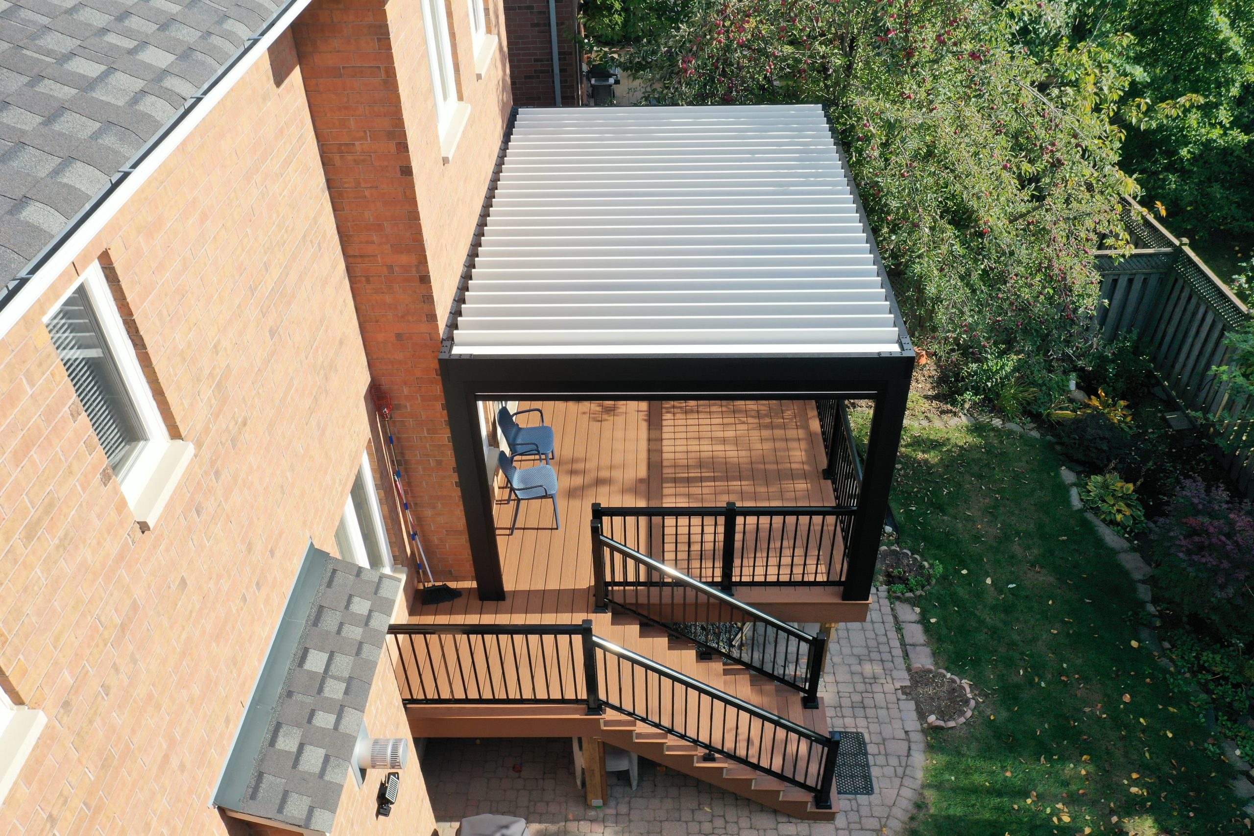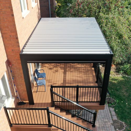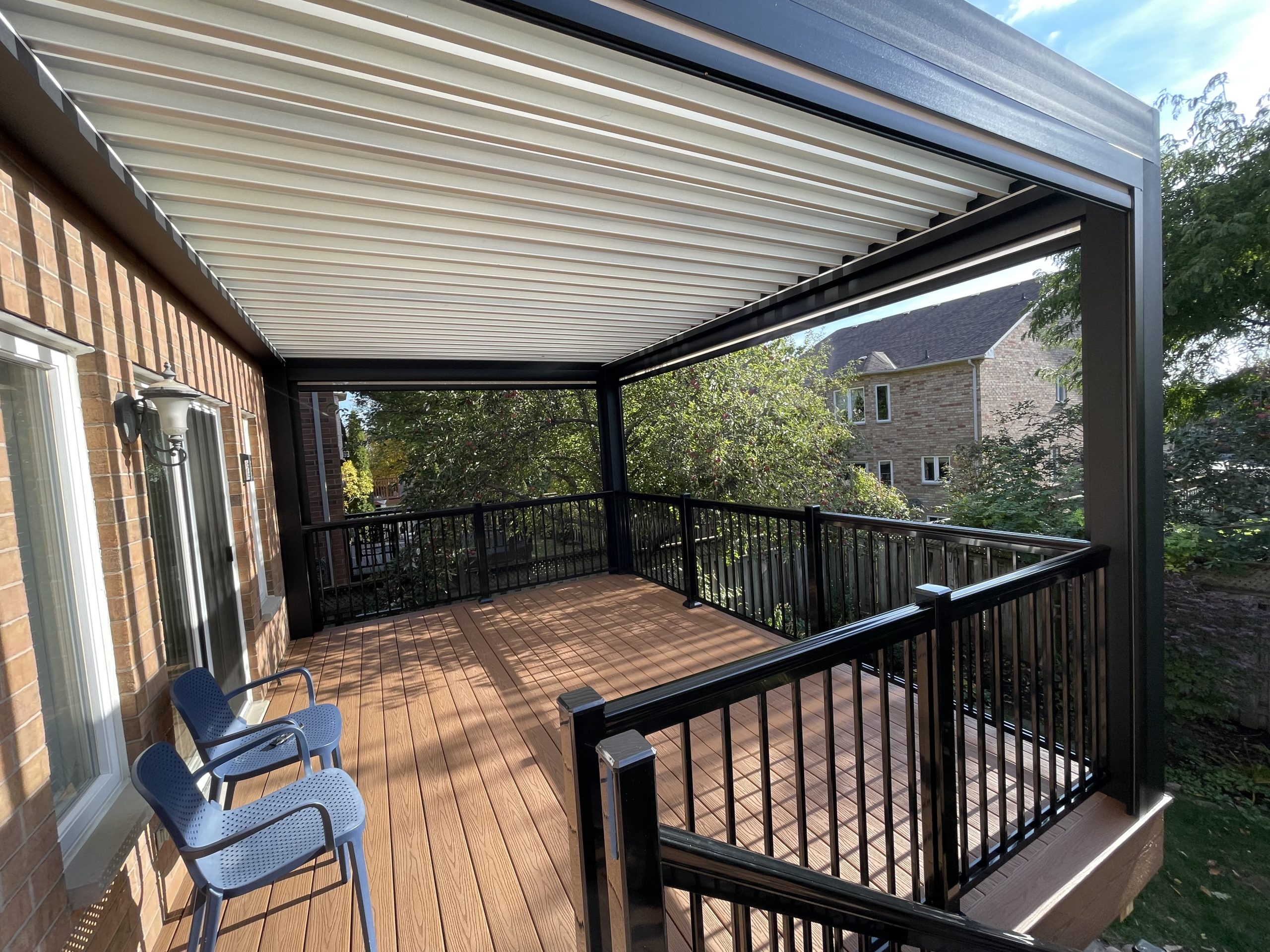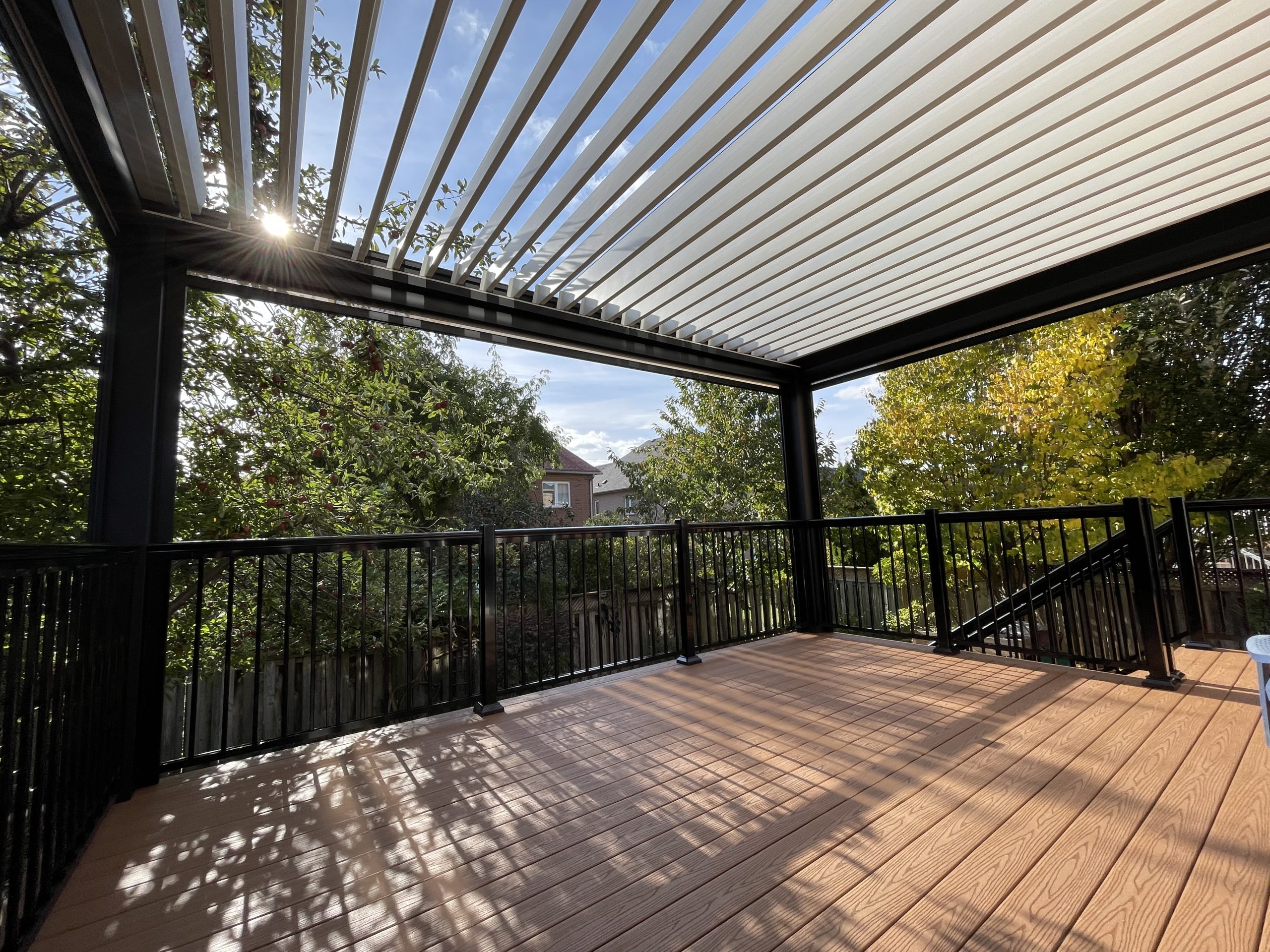 This Richmond Hill project features a custom elevated deck integrated with a premium motorized aluminum louver pergola. The design combines high-performance composite decking with adjustable louvers that provide precise climate control, extending the usability of this outdoor space throughout the seasons.