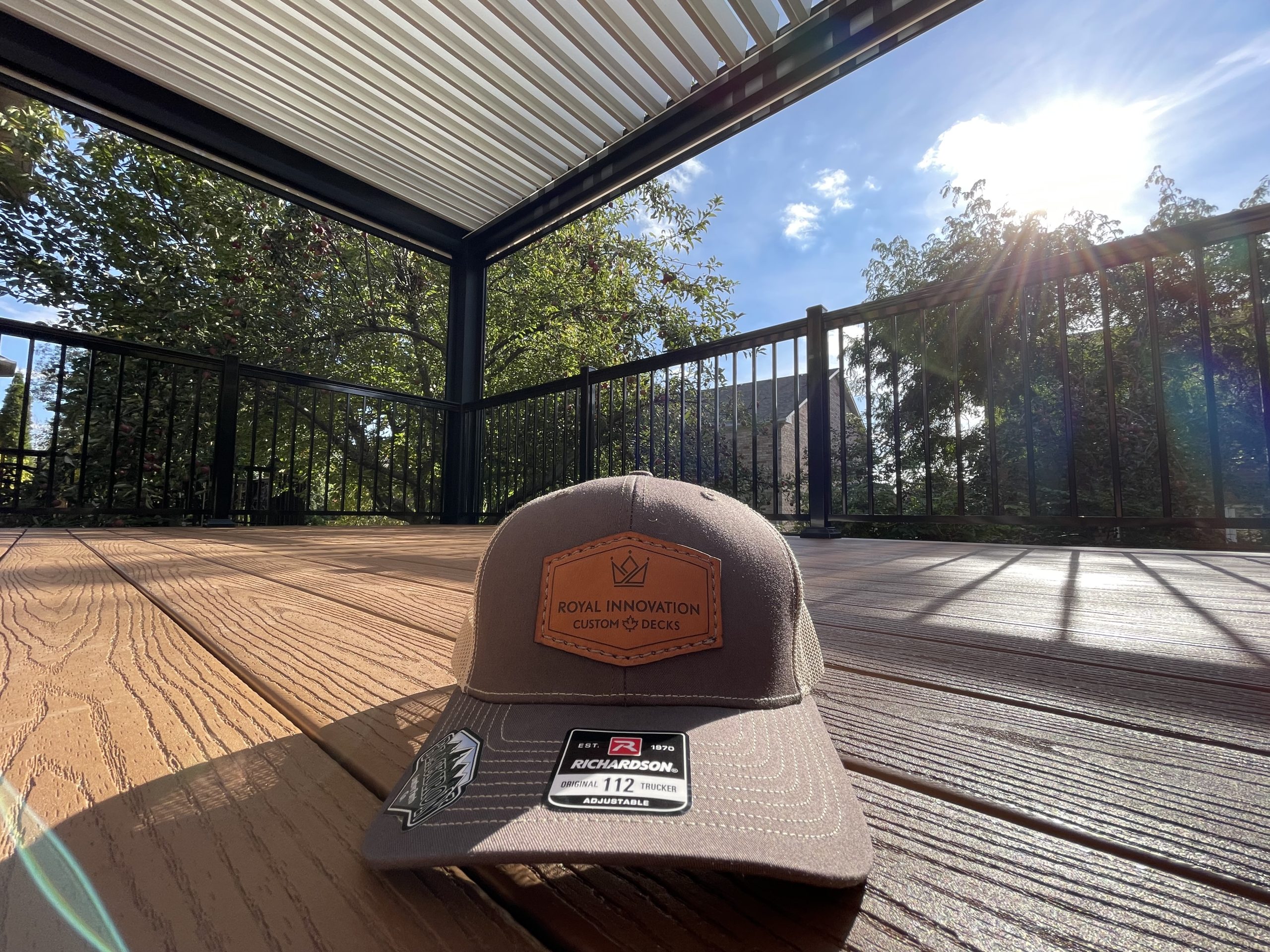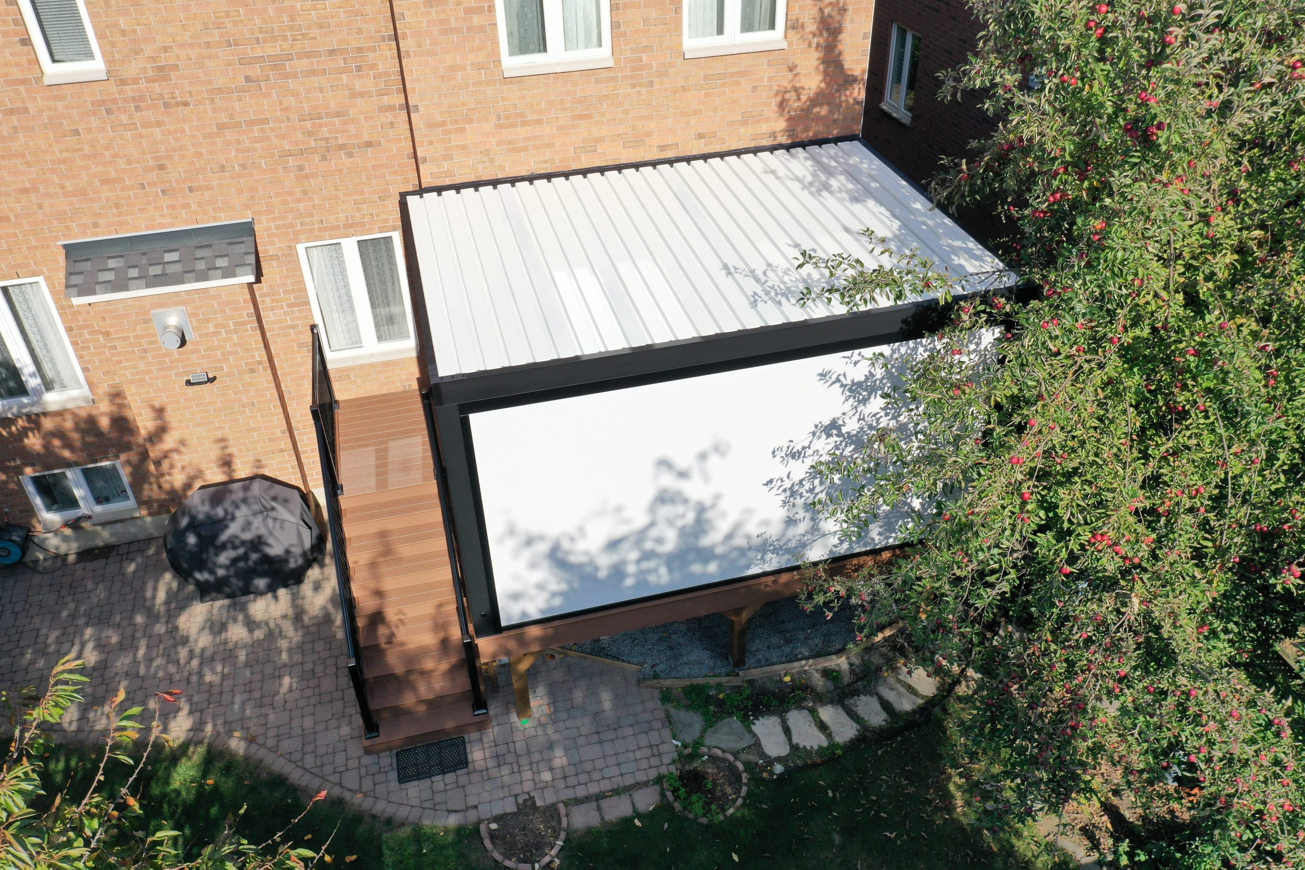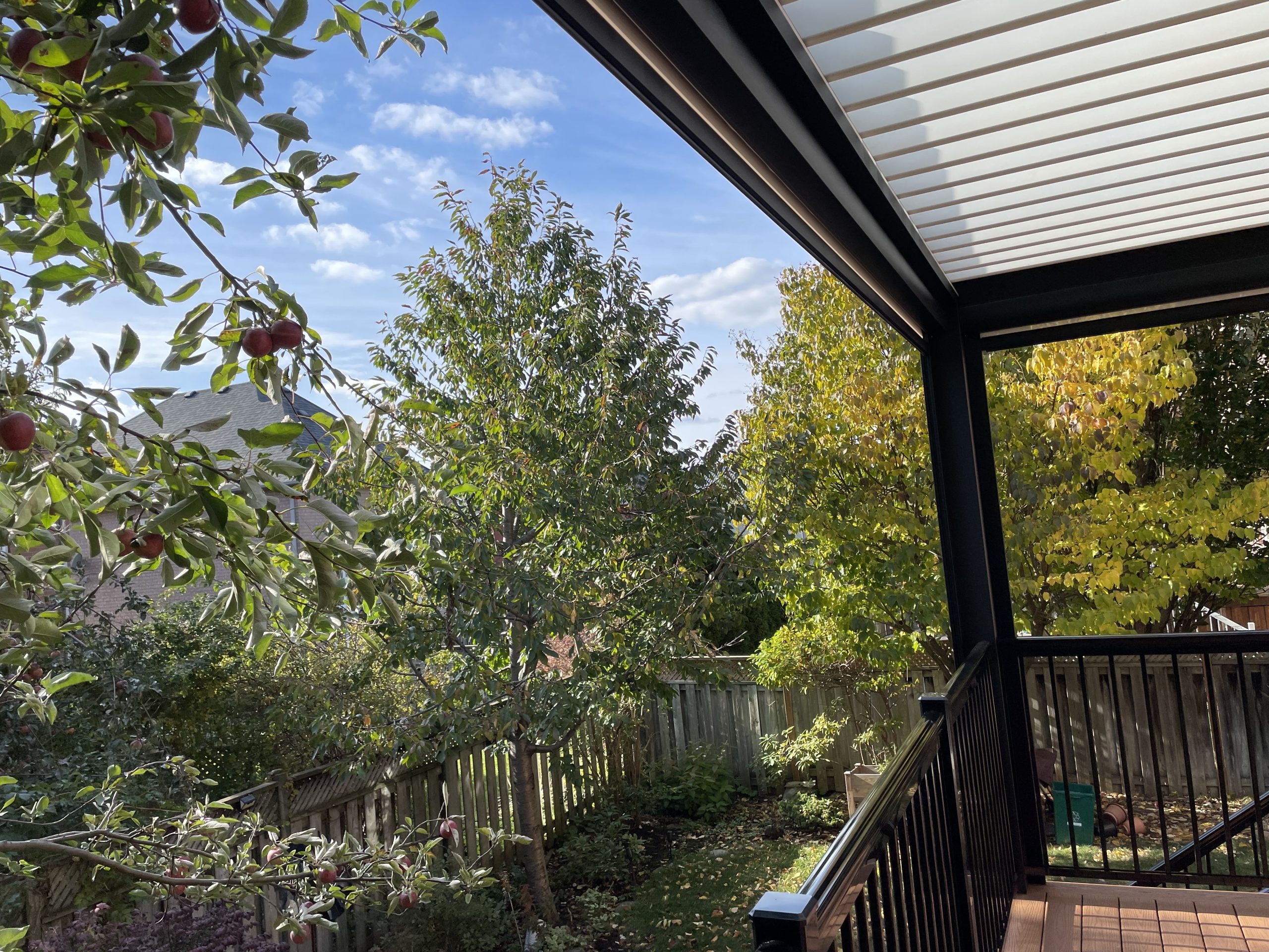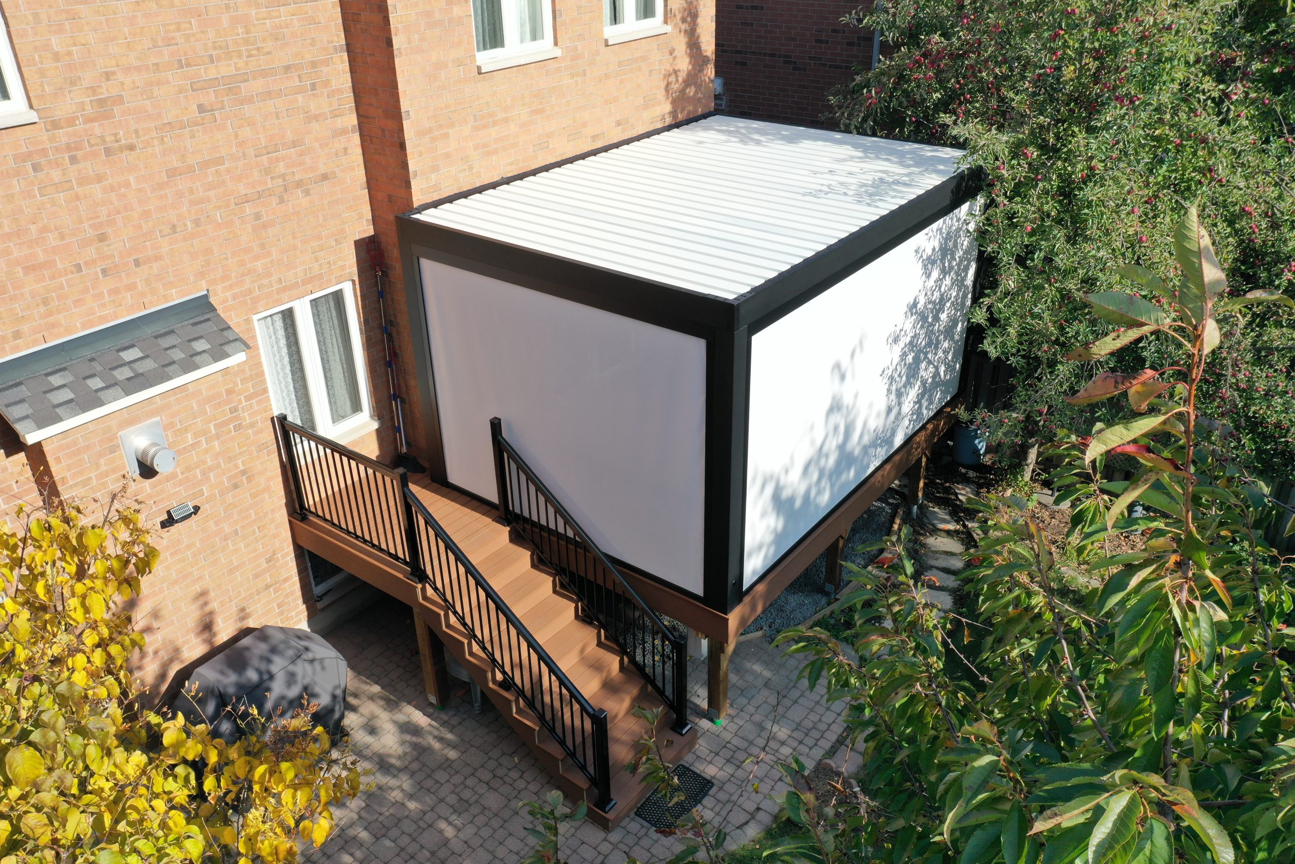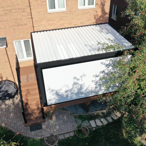 This Richmond Hill project features a custom elevated deck integrated with a premium motorized aluminum louver pergola. The design combines high-performance composite decking with adjustable louvers that provide precise climate control, extending the usability of this outdoor space throughout the seasons.