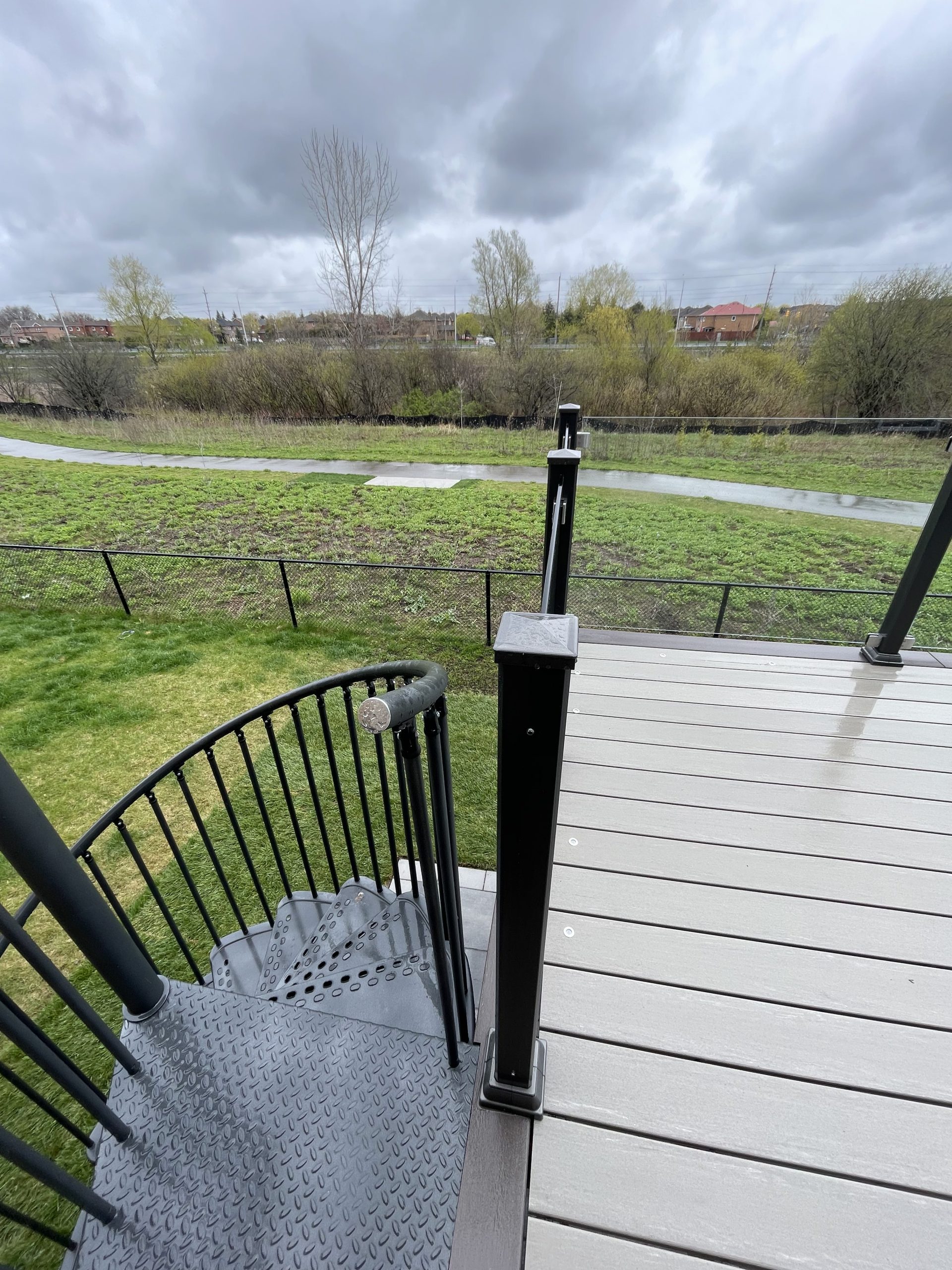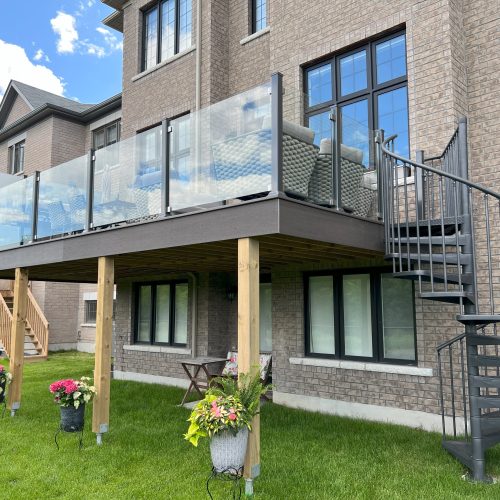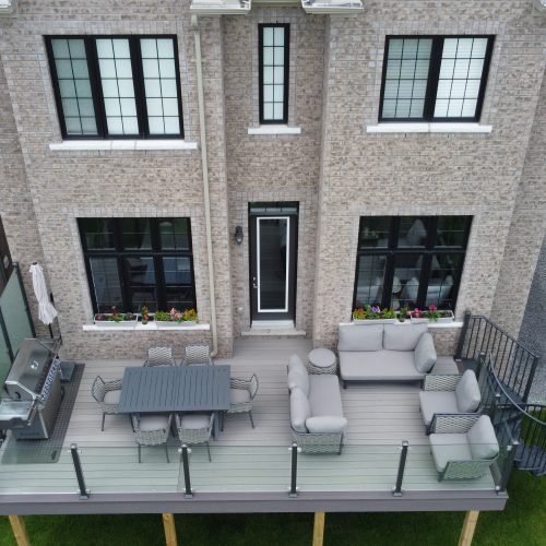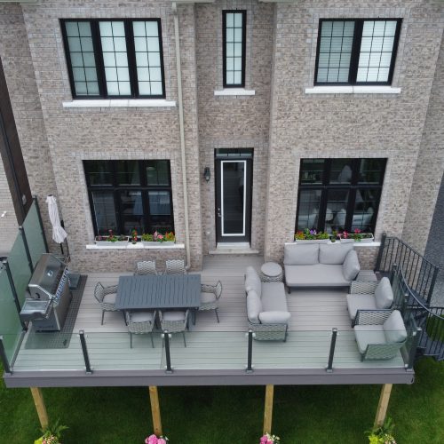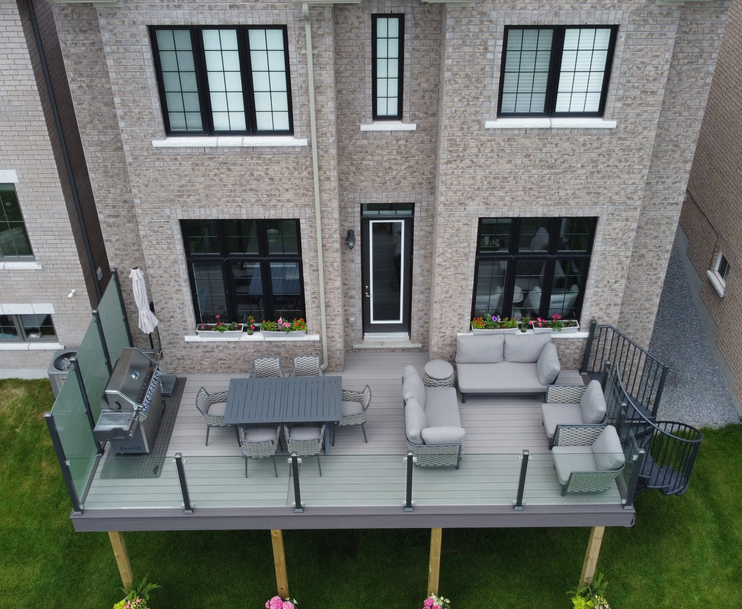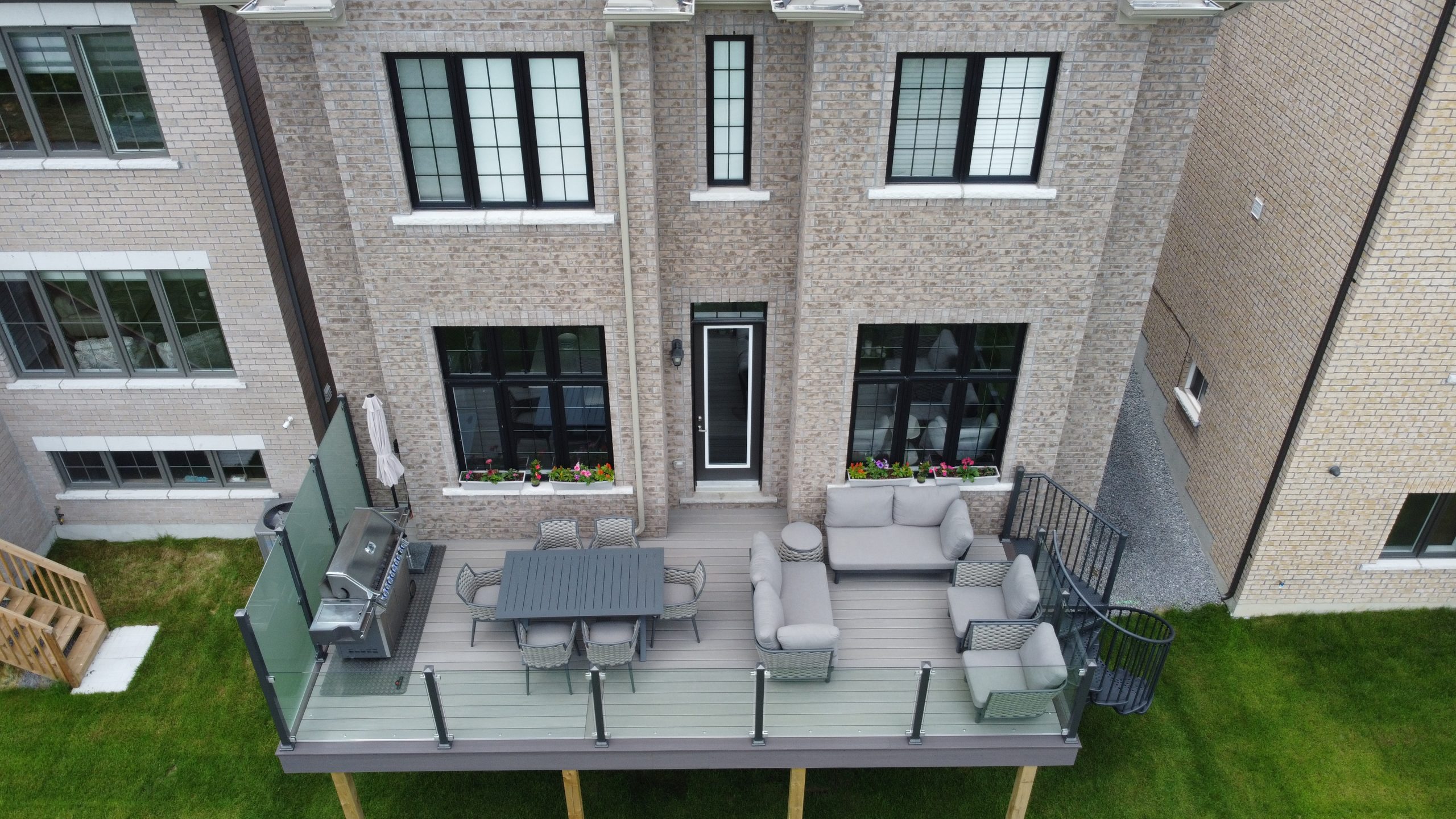 This stylish Ajax residence features a sophisticated elevated deck system designed to maximize outdoor entertainment potential in a modern urban setting. Our deck contractors selected premium PVC decking in a refined silver-gray tone that beautifully complements the home’s contemporary brick exterior.