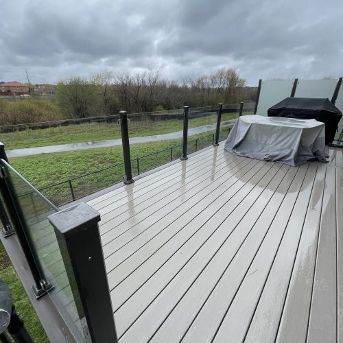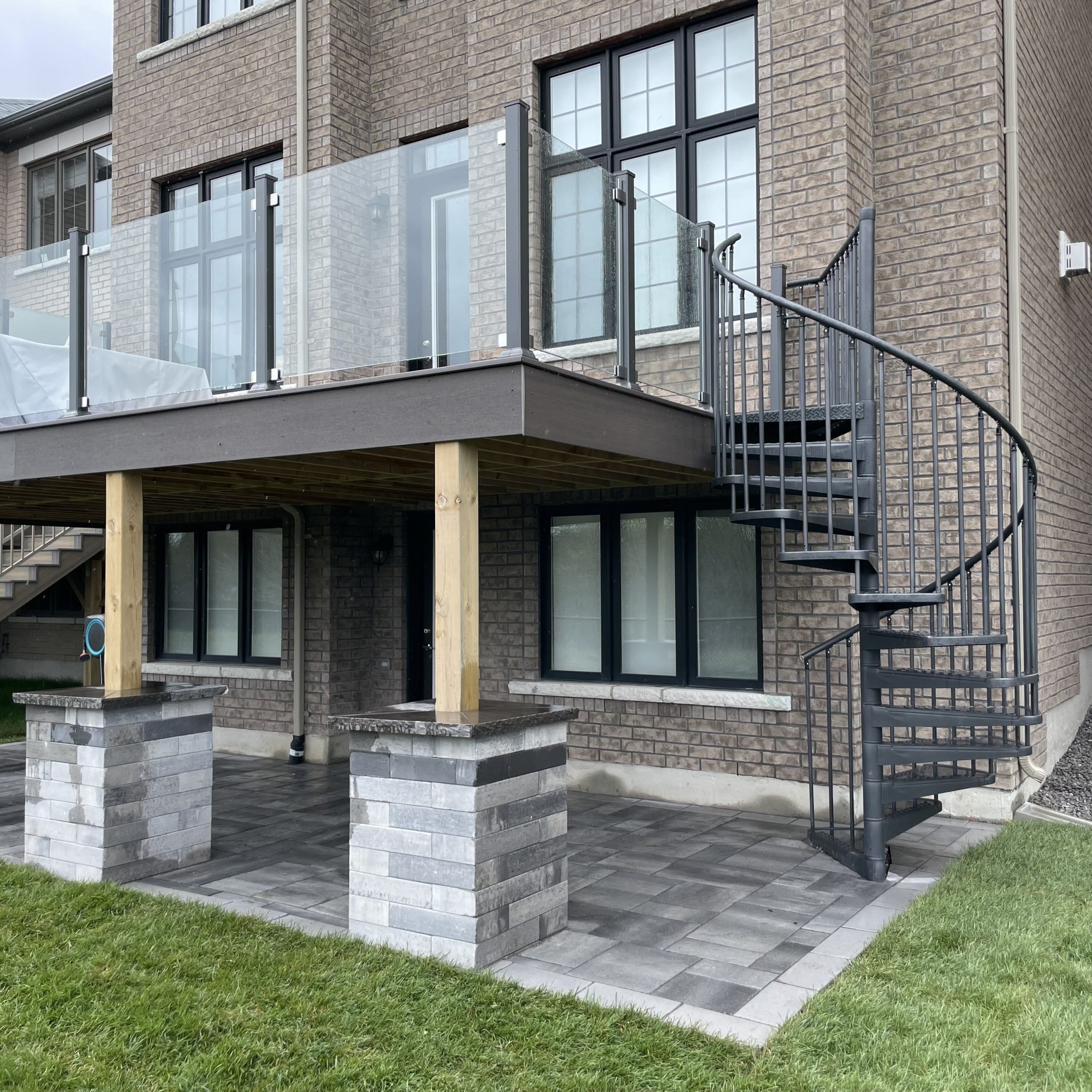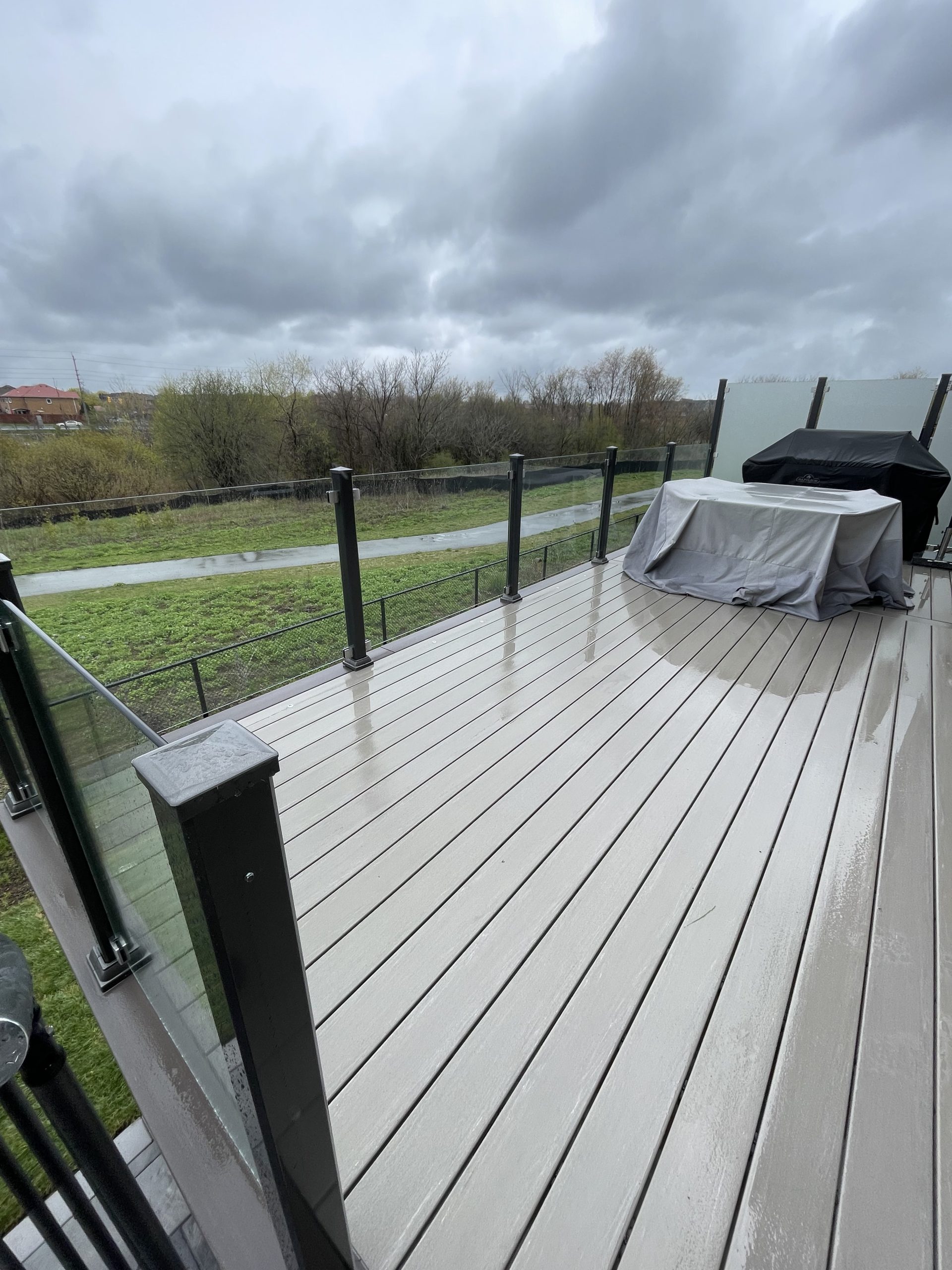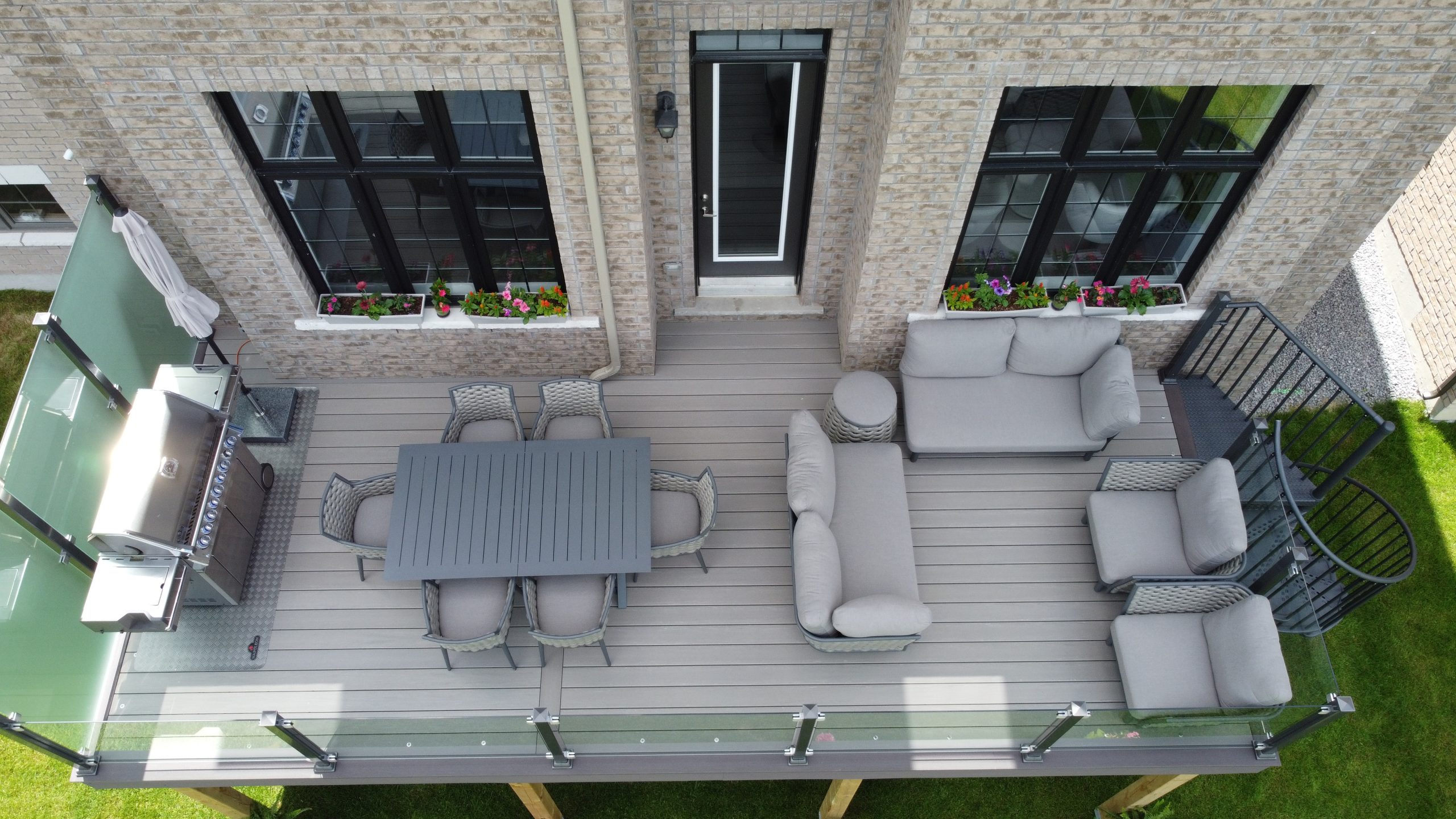This stylish Ajax residence features a sophisticated elevated deck system designed to maximize outdoor entertainment potential in a modern urban setting. Our deck contractors selected premium PVC decking in a refined silver-gray tone that beautifully complements the home’s contemporary brick exterior.