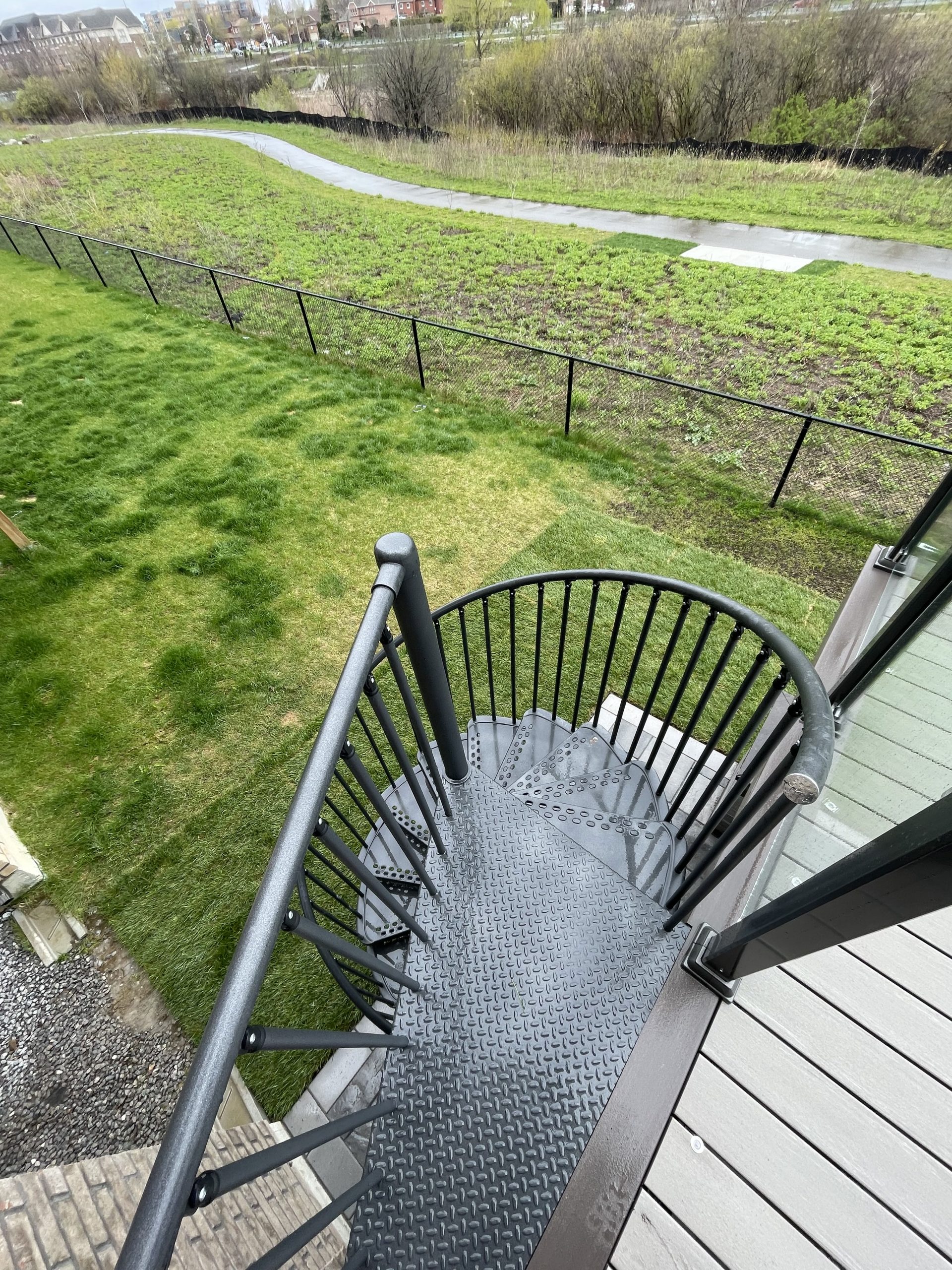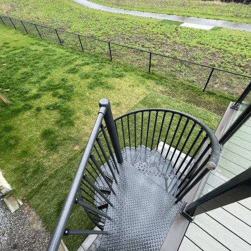 An architectural highlight is the custom spiral staircase that provides elegant access between levels while serving as a striking design feature. This space-efficient solution preserves valuable deck square footage while adding significant visual interest to the overall design.