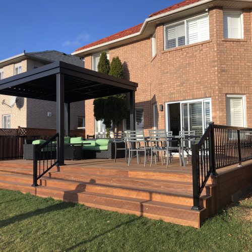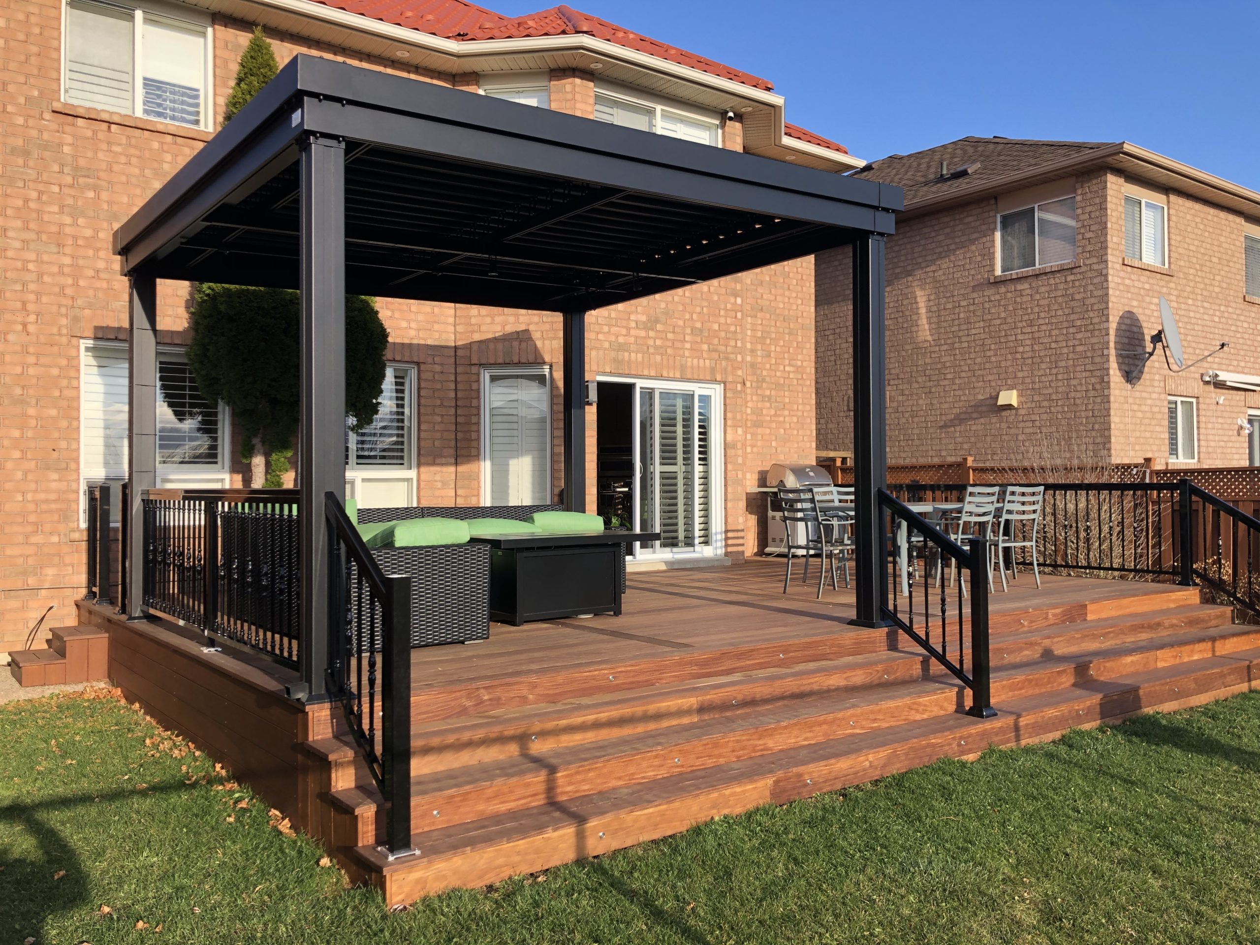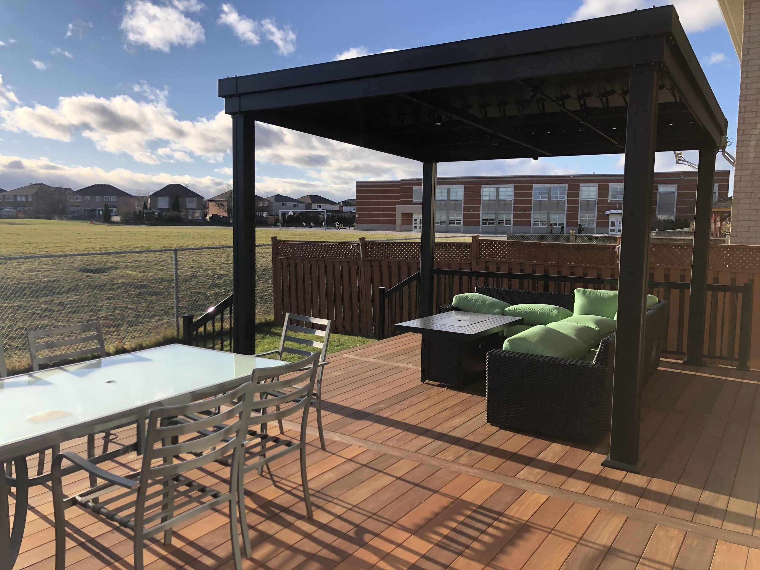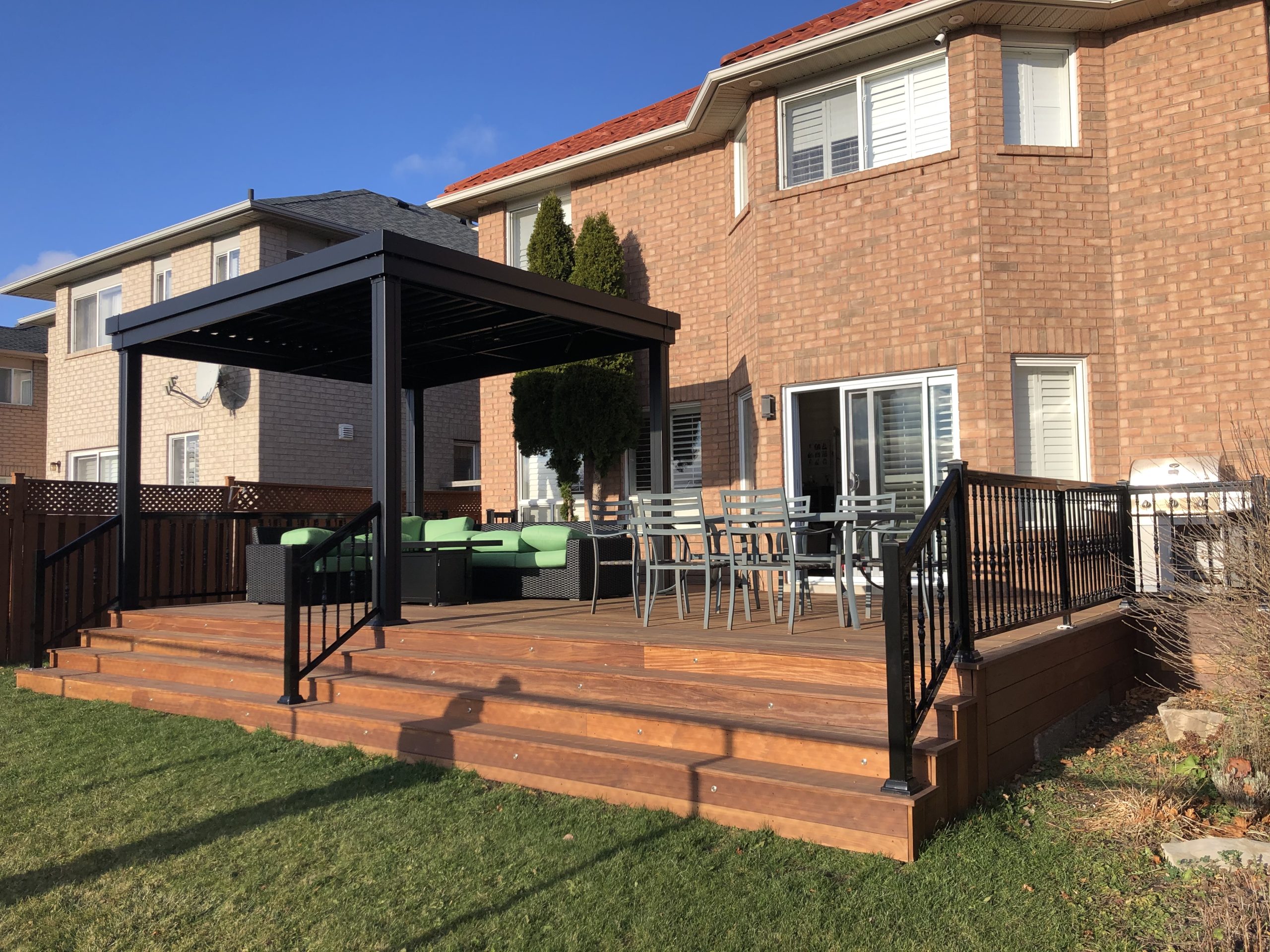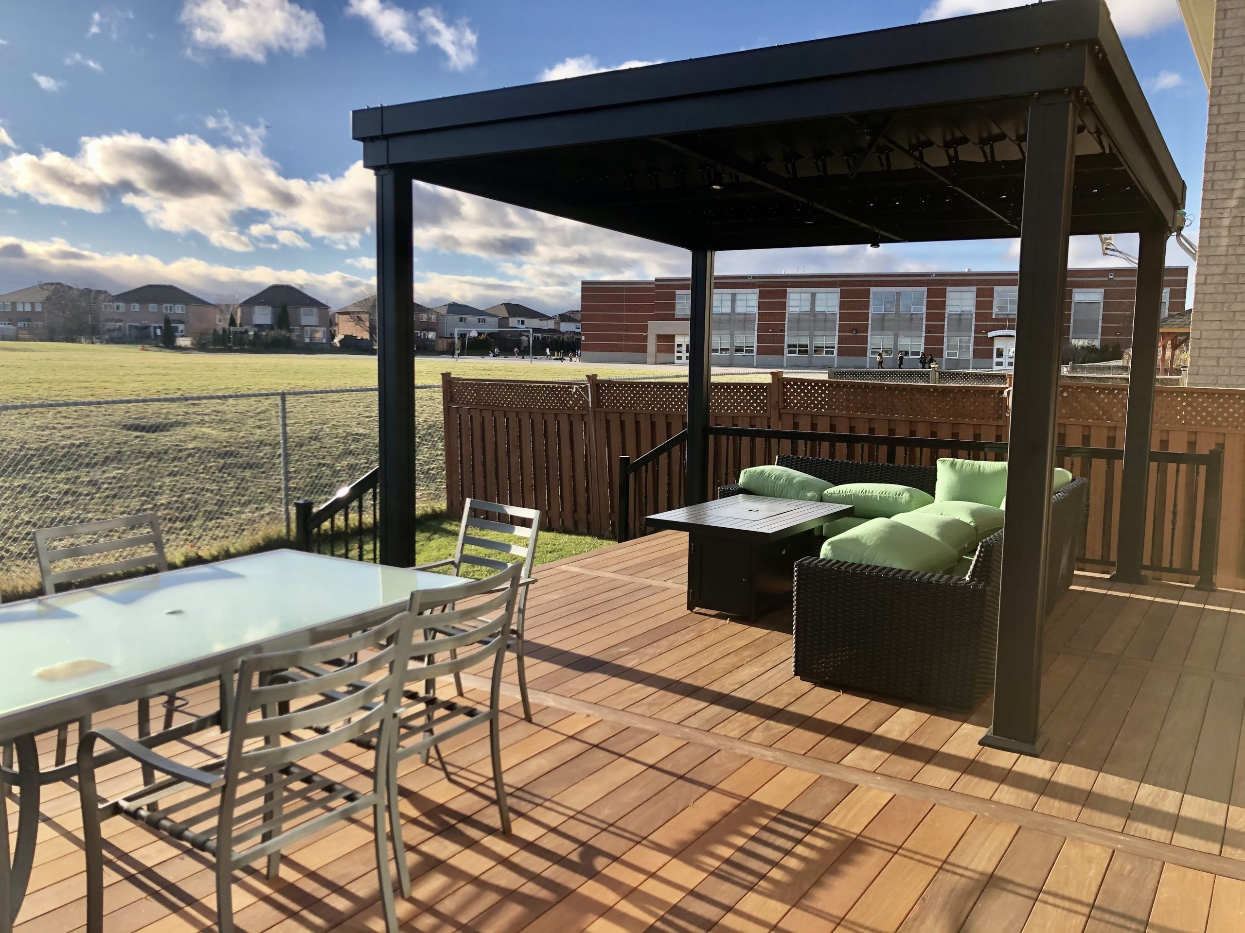 This Aurora suburban residence showcases our approach to all-season outdoor entertainment spaces through the harmonious integration of a luxurious Ipe hardwood deck with a sophisticated aluminum louvered gazebo. The design creates a year-round sanctuary that extends the home’s living area while addressing the variable Ontario climate.