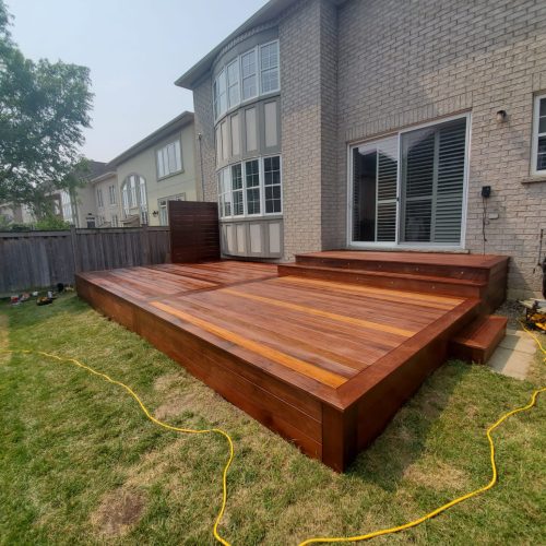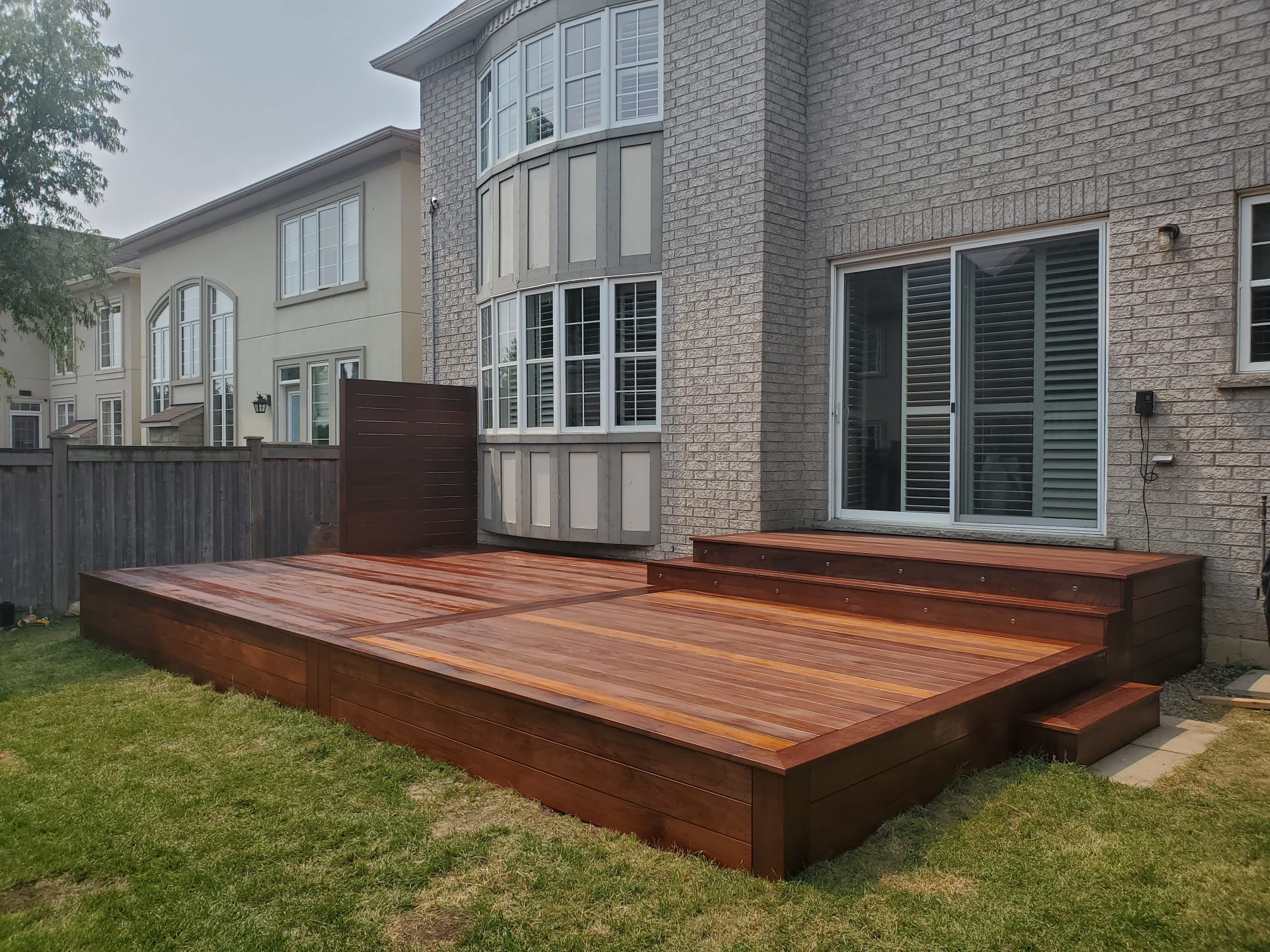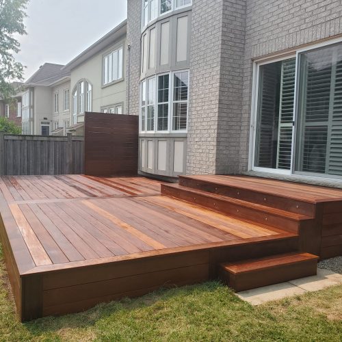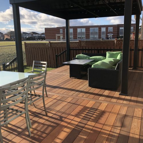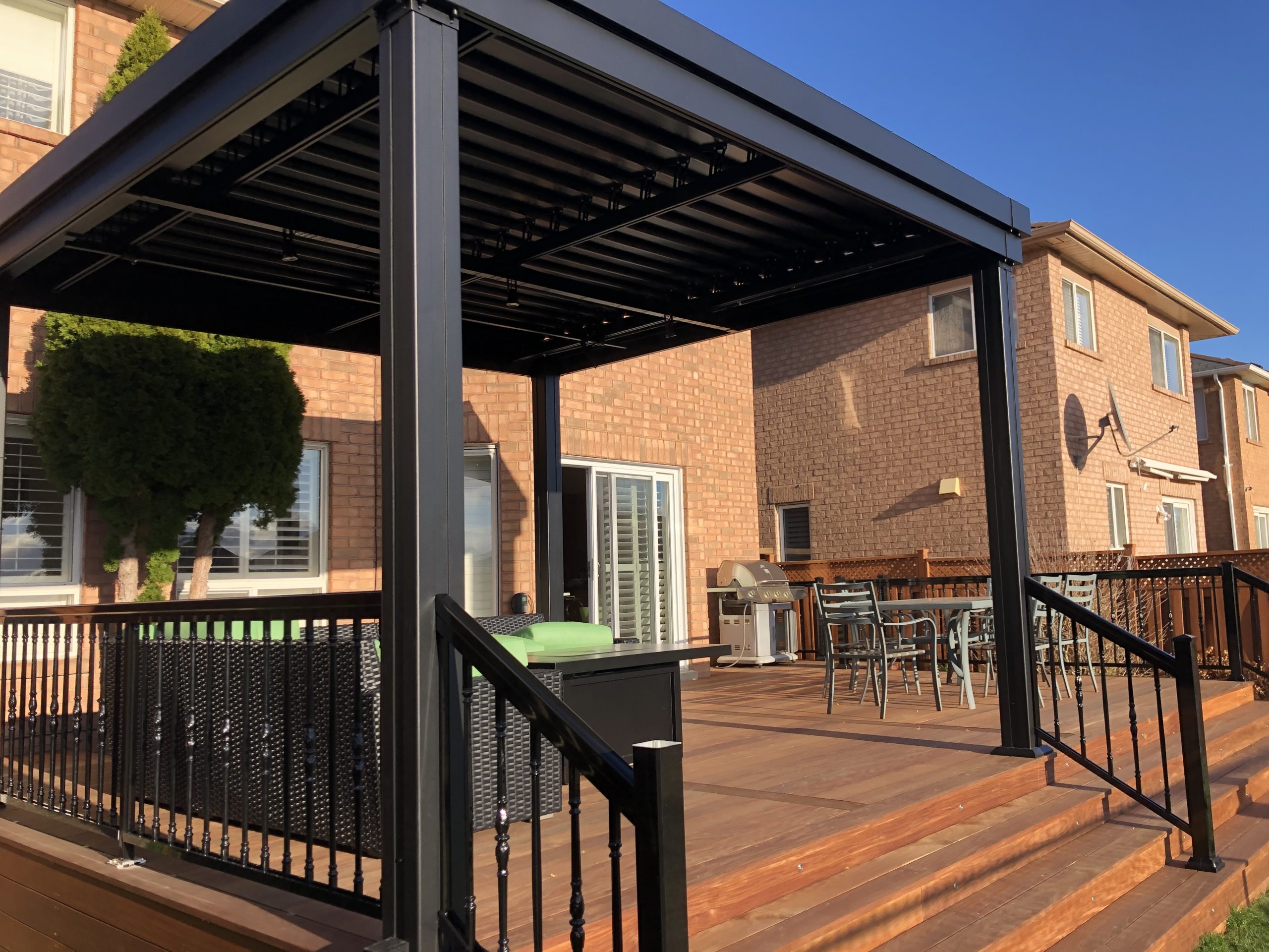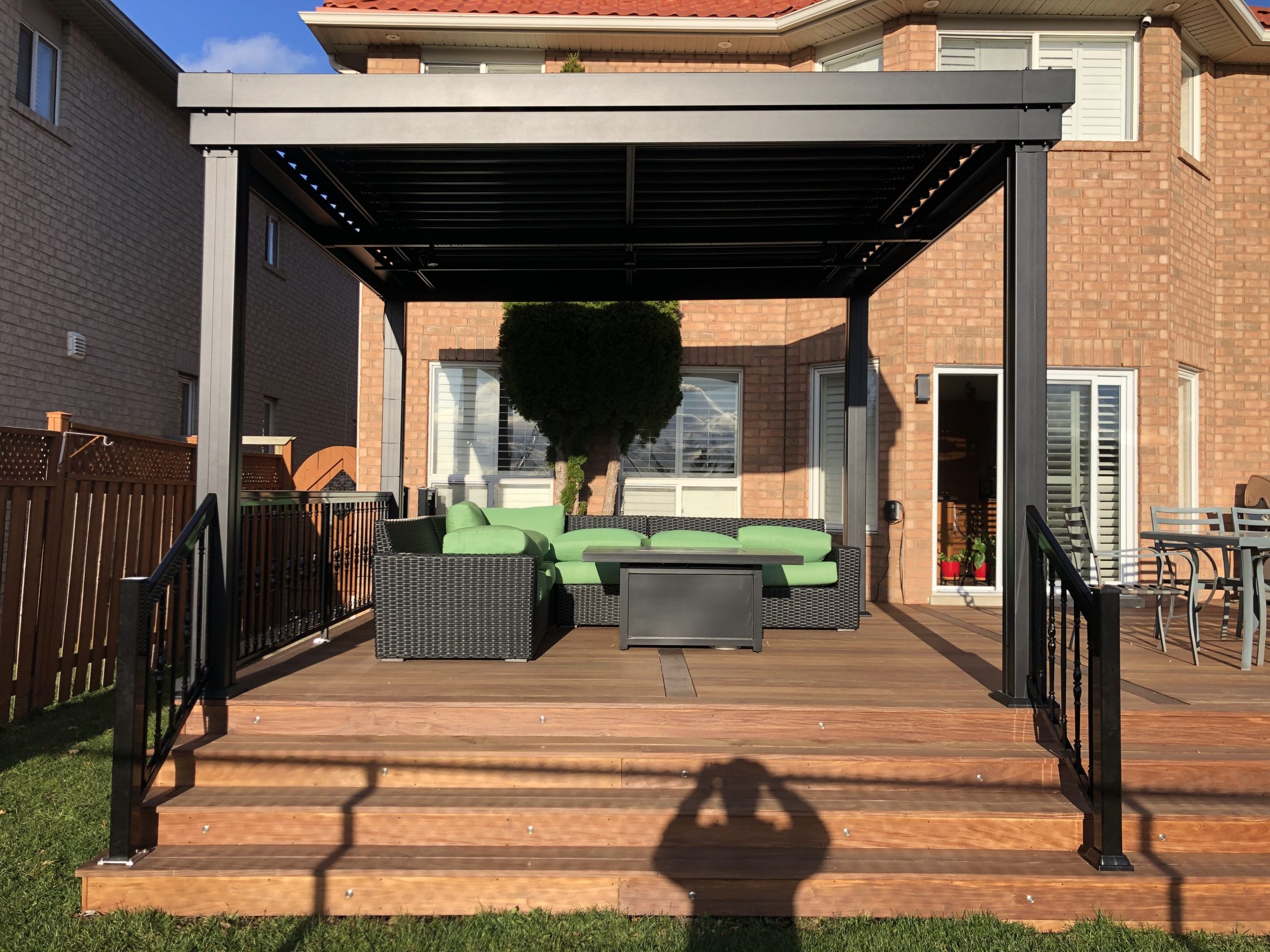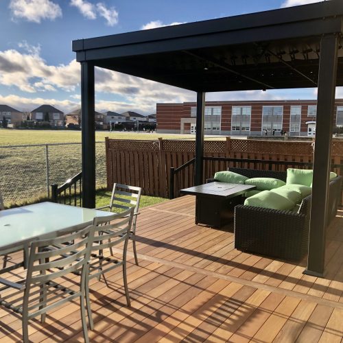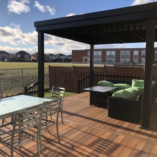 This Aurora suburban residence showcases our approach to all-season outdoor entertainment spaces through the harmonious integration of a luxurious Ipe hardwood deck with a sophisticated aluminum louvered gazebo. The design creates a year-round sanctuary that extends the home’s living area while addressing the variable Ontario climate.