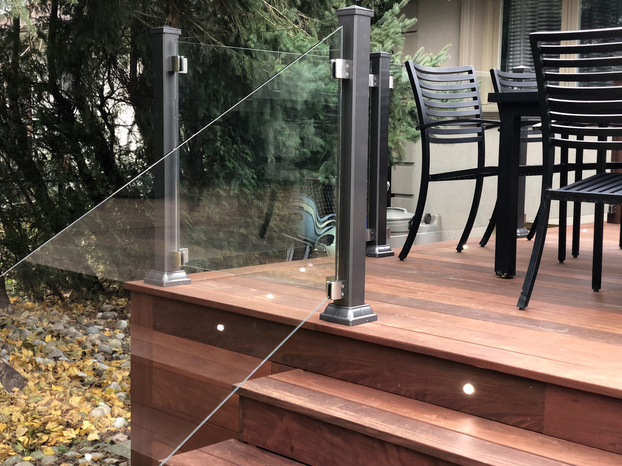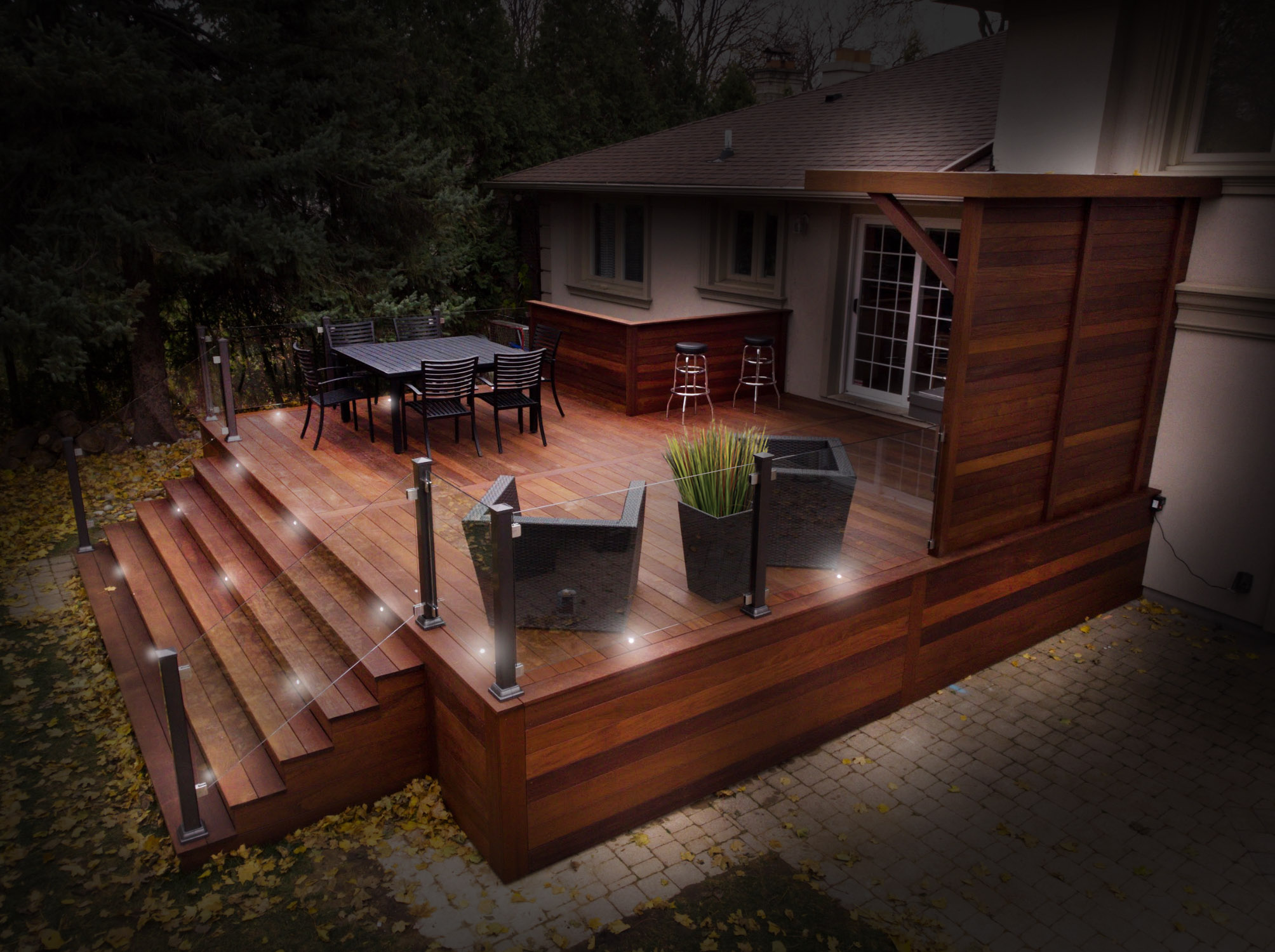 The thoughtful deck design incorporates a sheltered outdoor kitchen with a built-in BBQ station and professional deck lighting for evening entertaining. Modern frameless glass railings with sleek aluminum posts maintain open sightlines while ensuring safety.