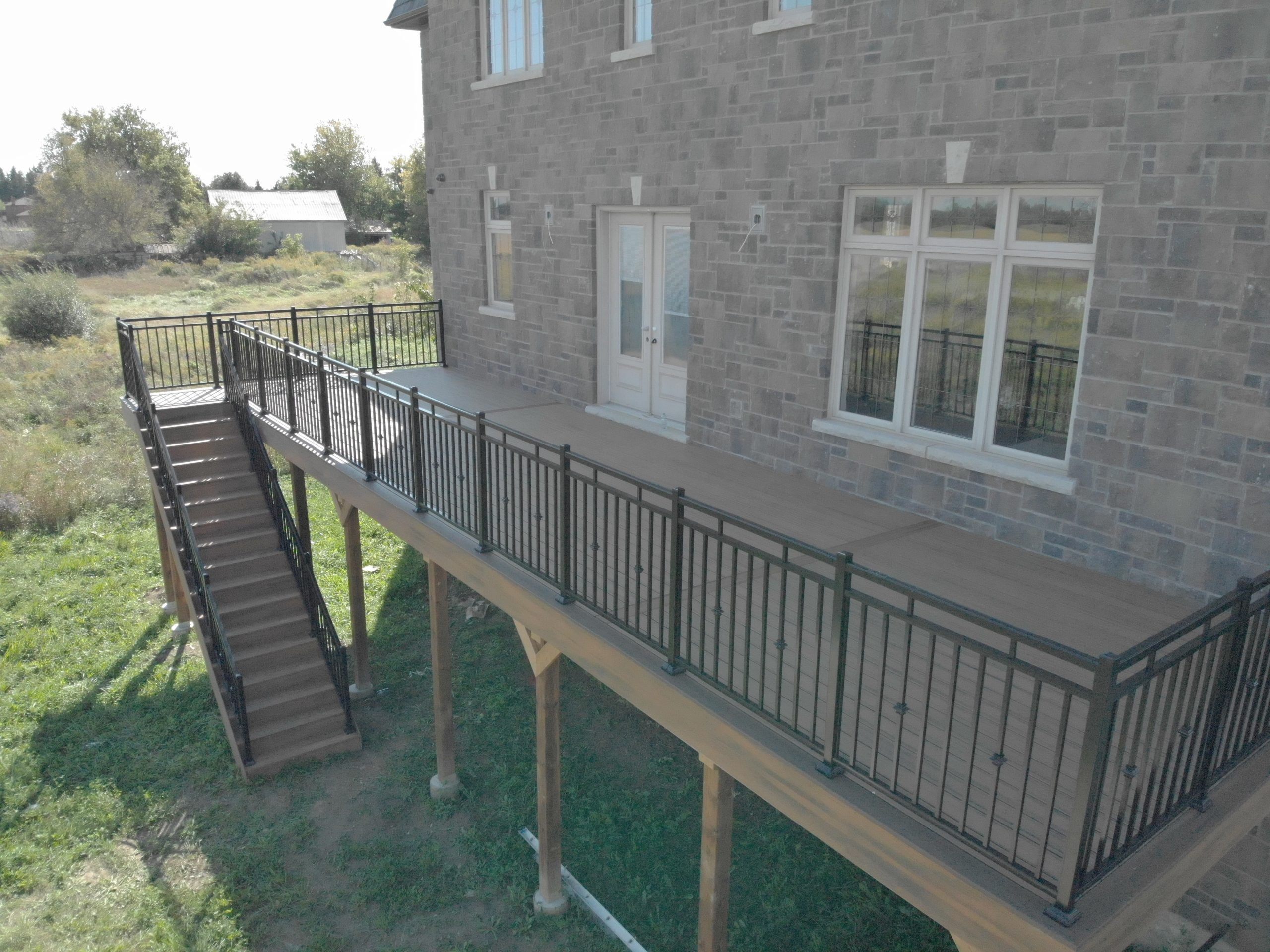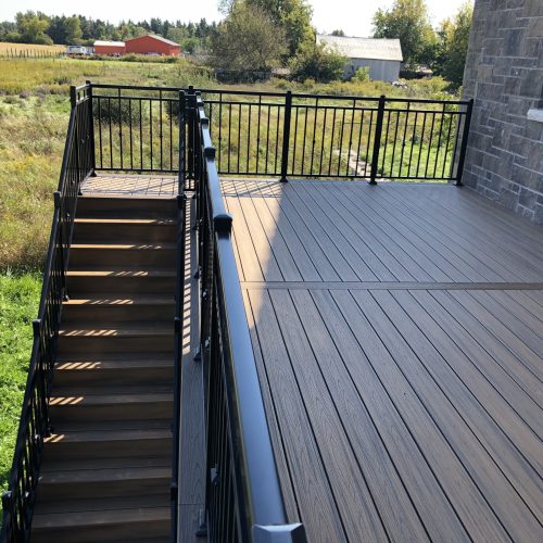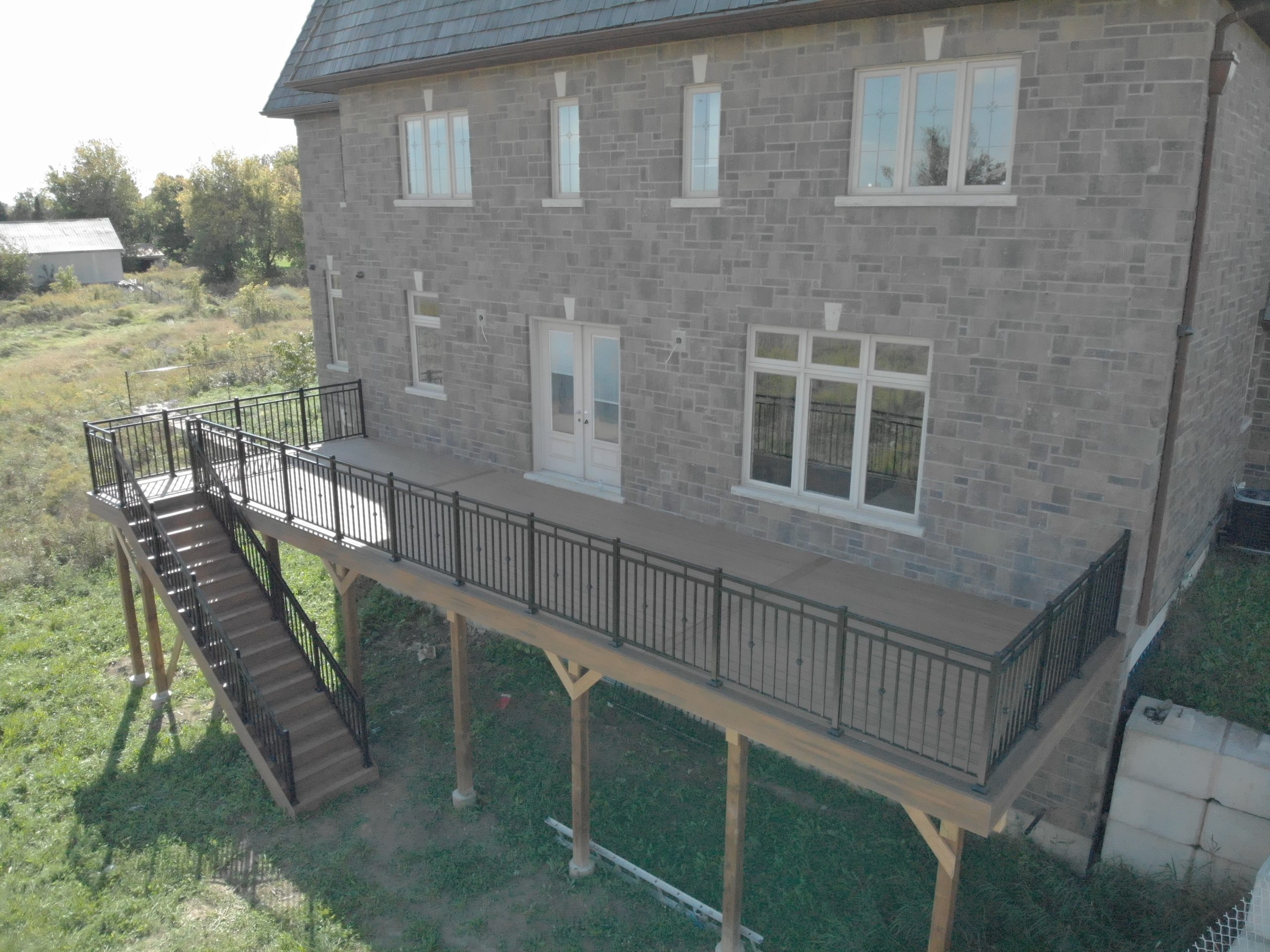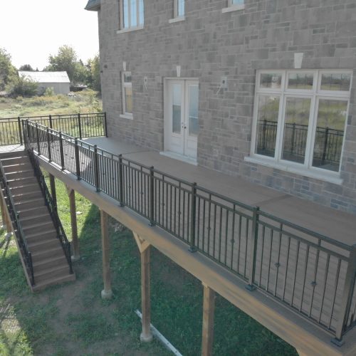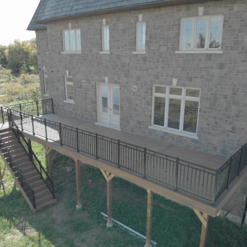 This distinctive rural Ontario residence features a thoughtfully engineered custom deck installation that creates an exceptional outdoor vantage point overlooking the surrounding countryside. Our professional deck builders designed this suspended outdoor living space to maximize panoramic views while providing seamless access from the home’s main level.