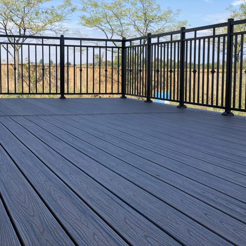 The elevated deck construction employs a hybrid approach, utilizing robust timber framing for structural support with premium composite decking for the walking surface. The sophisticated border detail features a contrasting picture-frame pattern that creates visual interest while defining the space’s perimeter. Our design incorporates aluminum deck railings in a classic vertical picket style that offers essential safety while maintaining optimal sightlines.