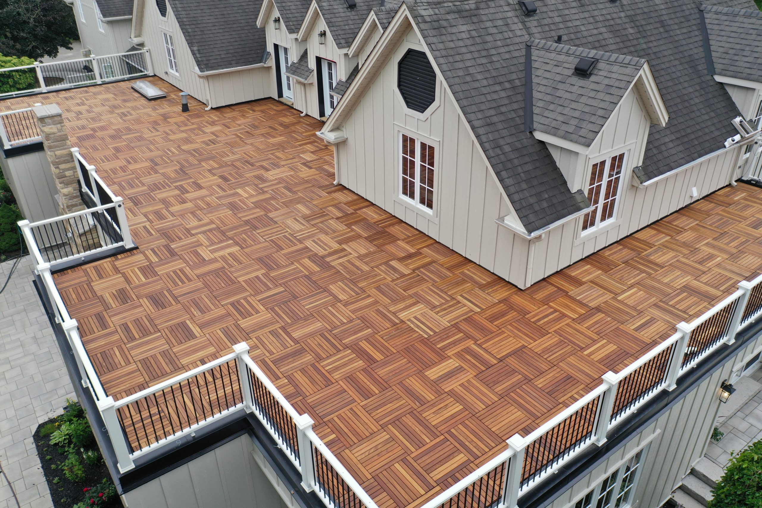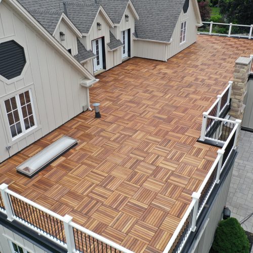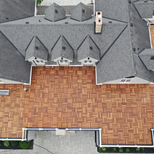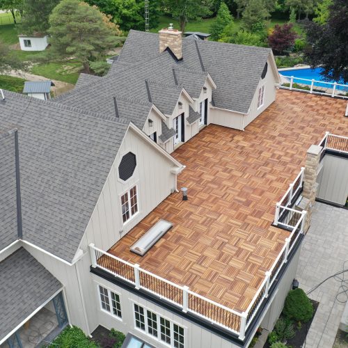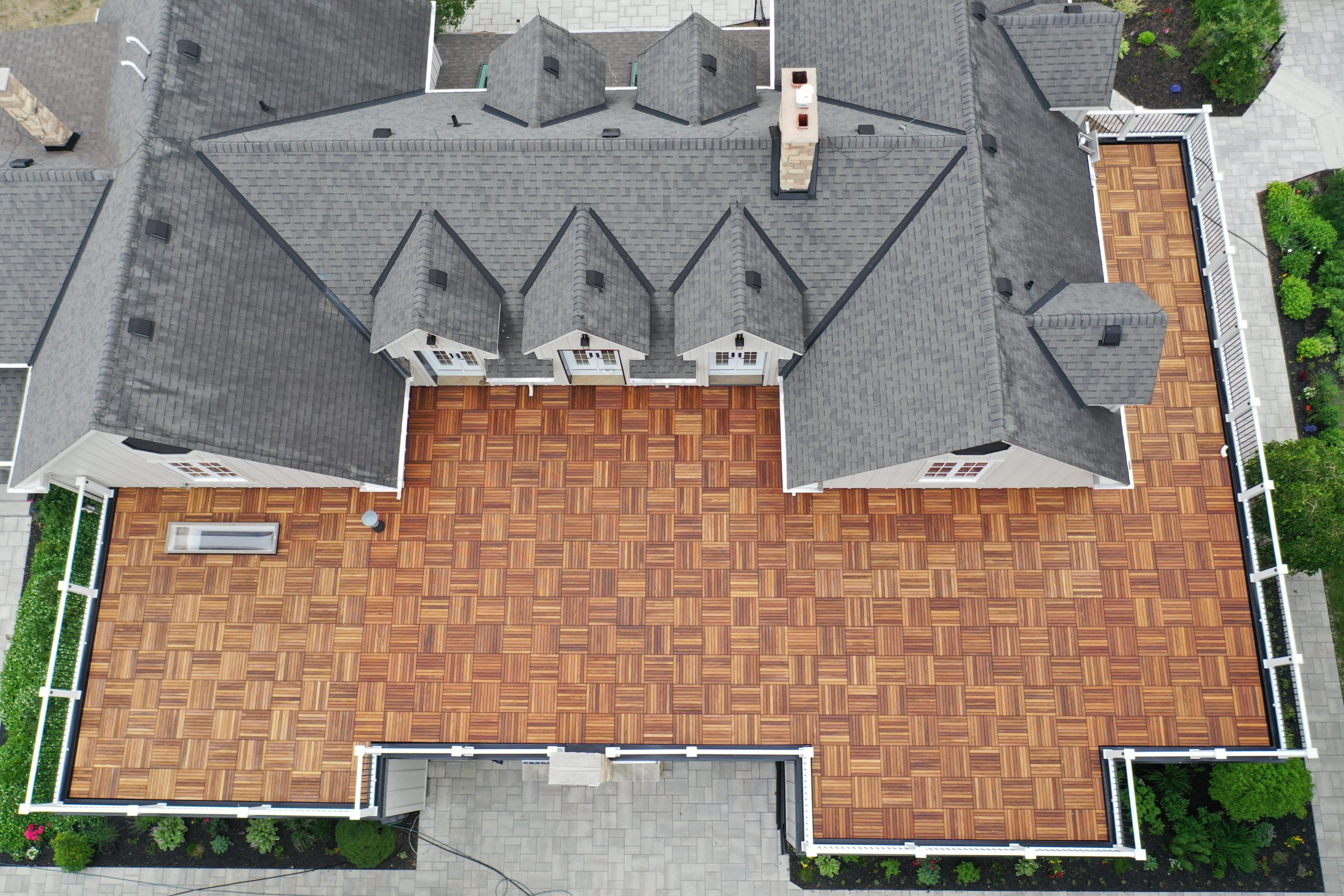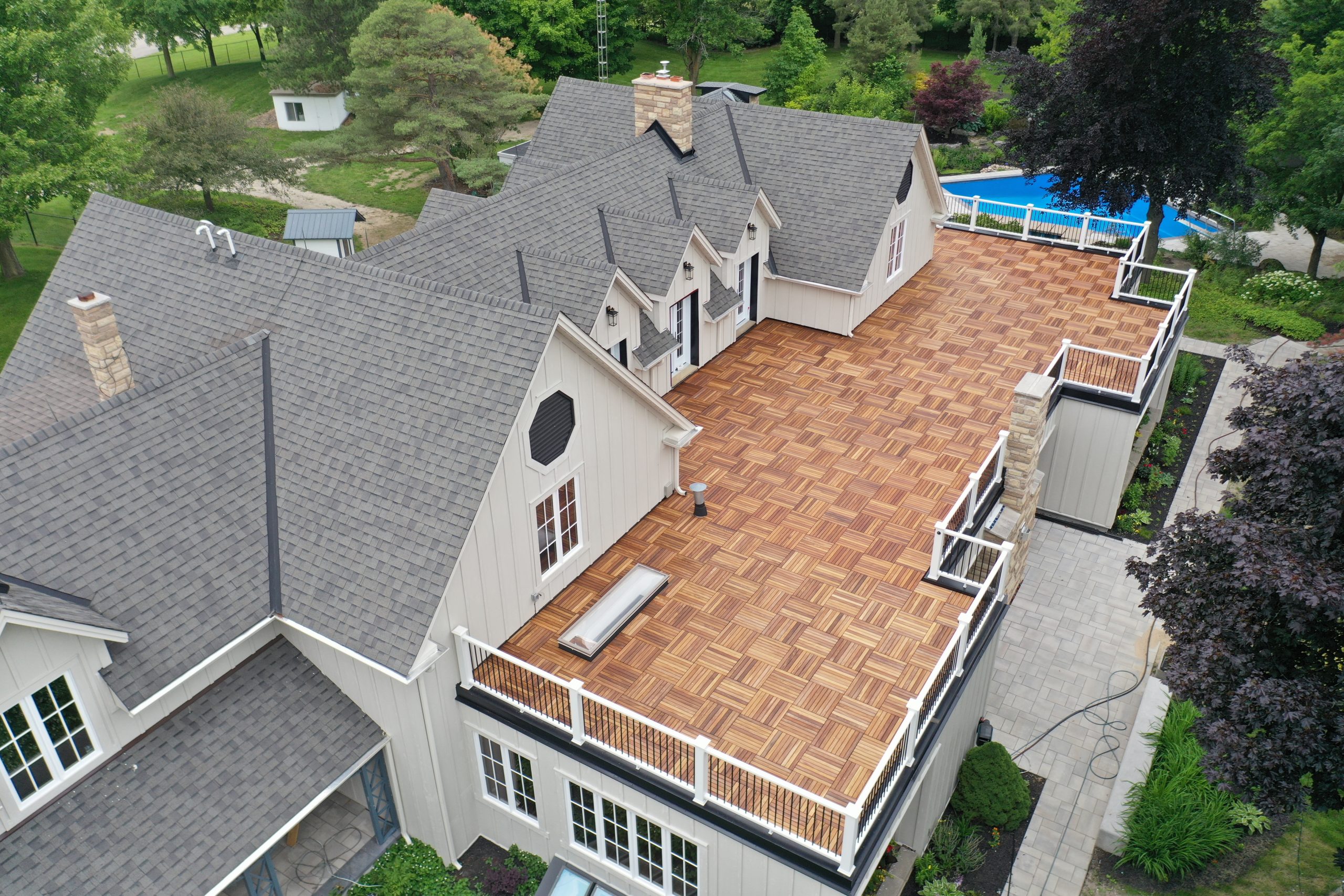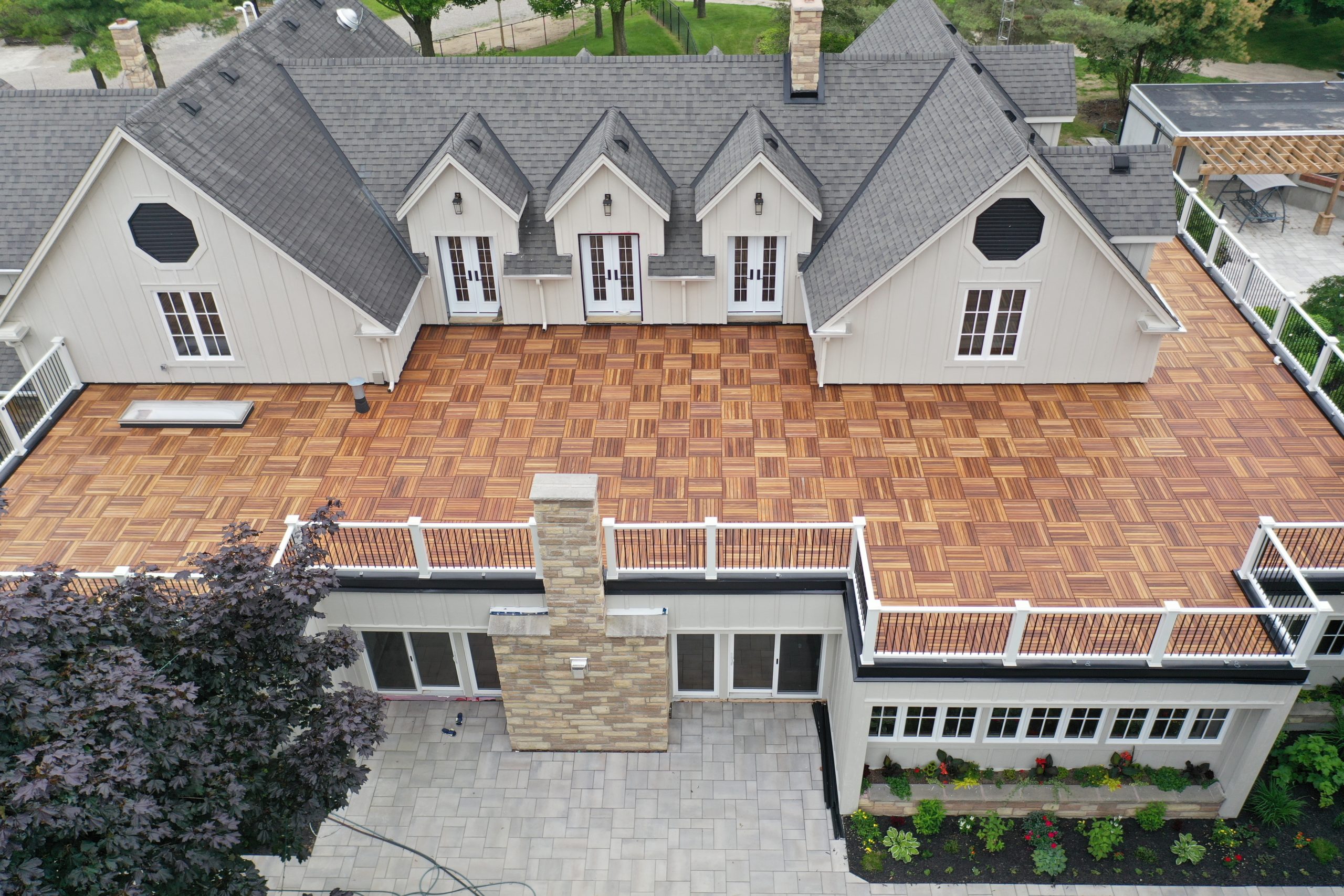 This expansive Bradford estate features a stunning rooftop deck installation utilizing premium Ipe hardwood deck tiles arranged in an elegant parquet pattern. The project transformed an unused roof space into a magnificent 3,000 square foot outdoor living area with panoramic views of the surrounding property and adjacent swimming pool.