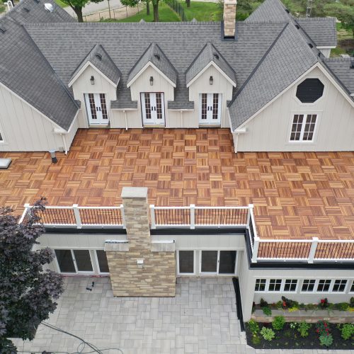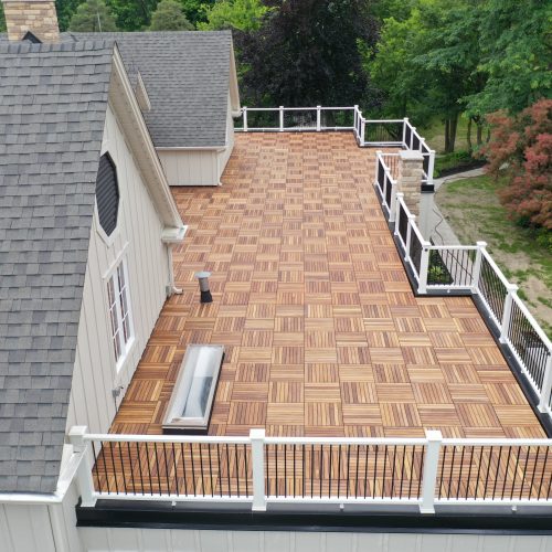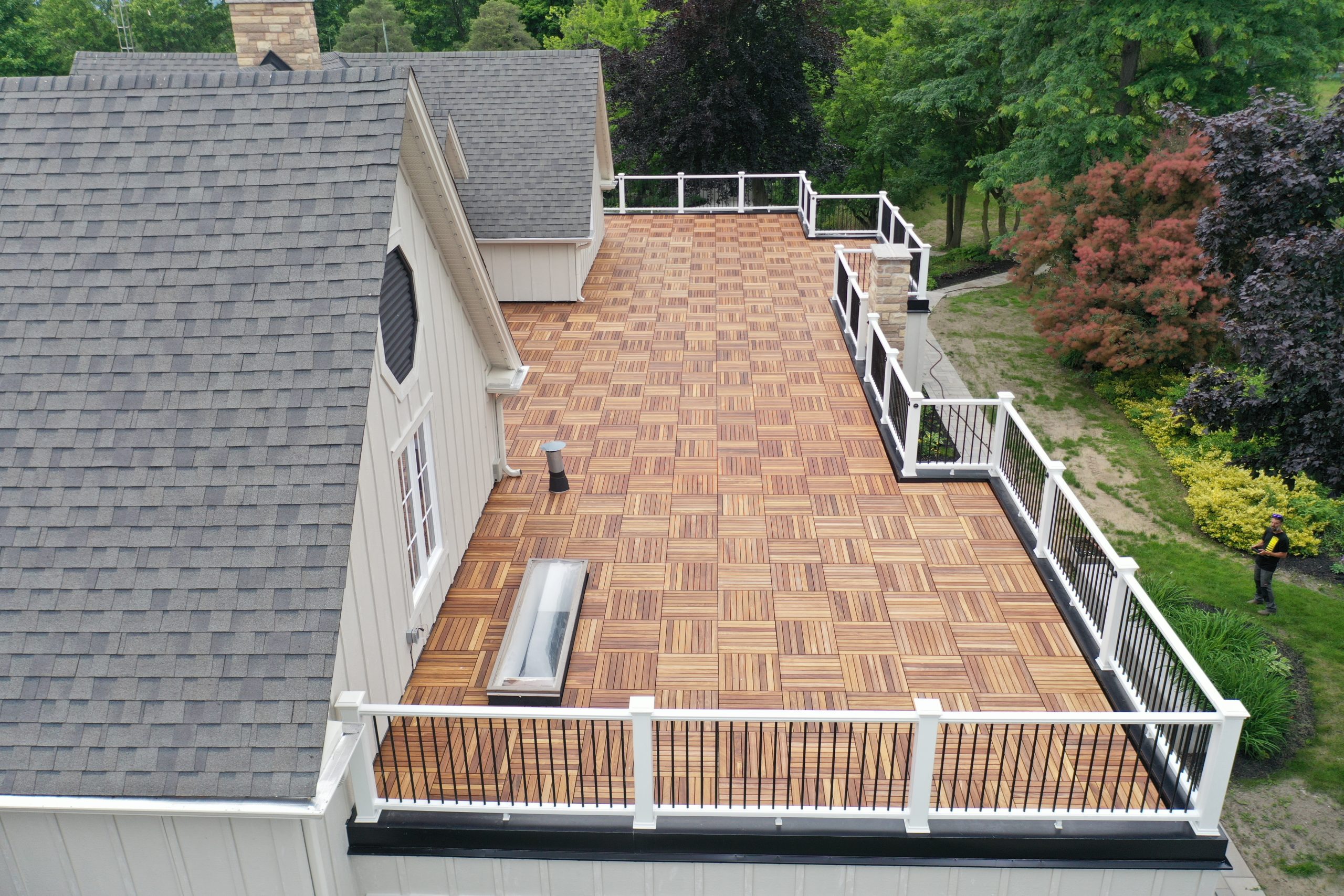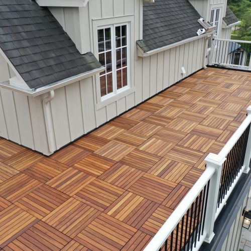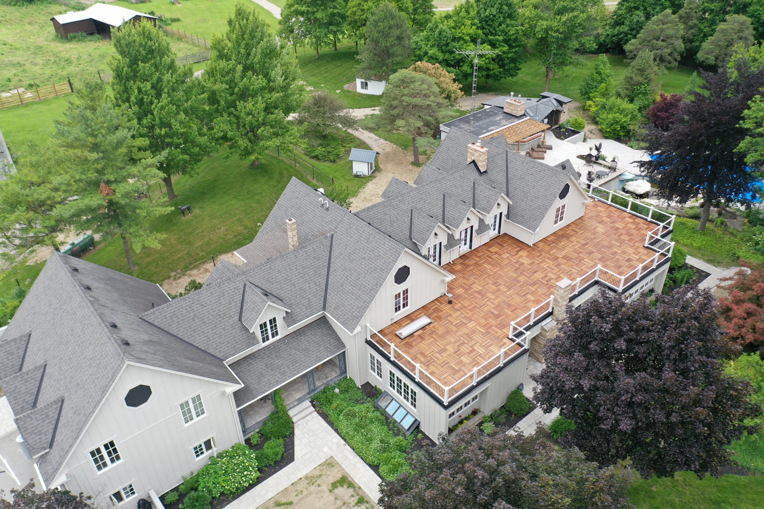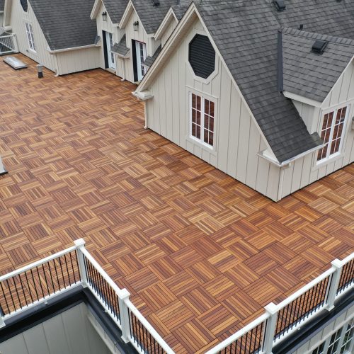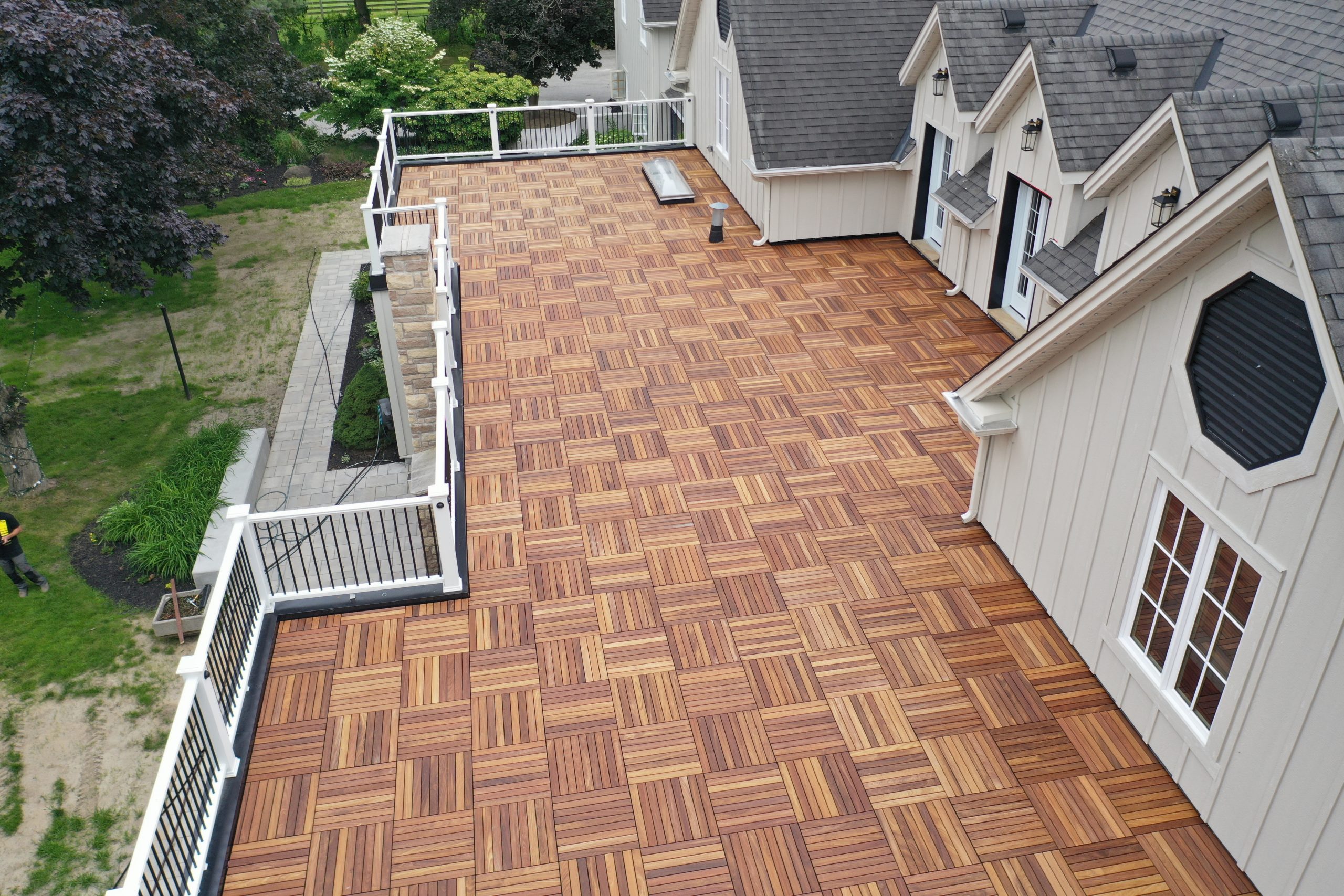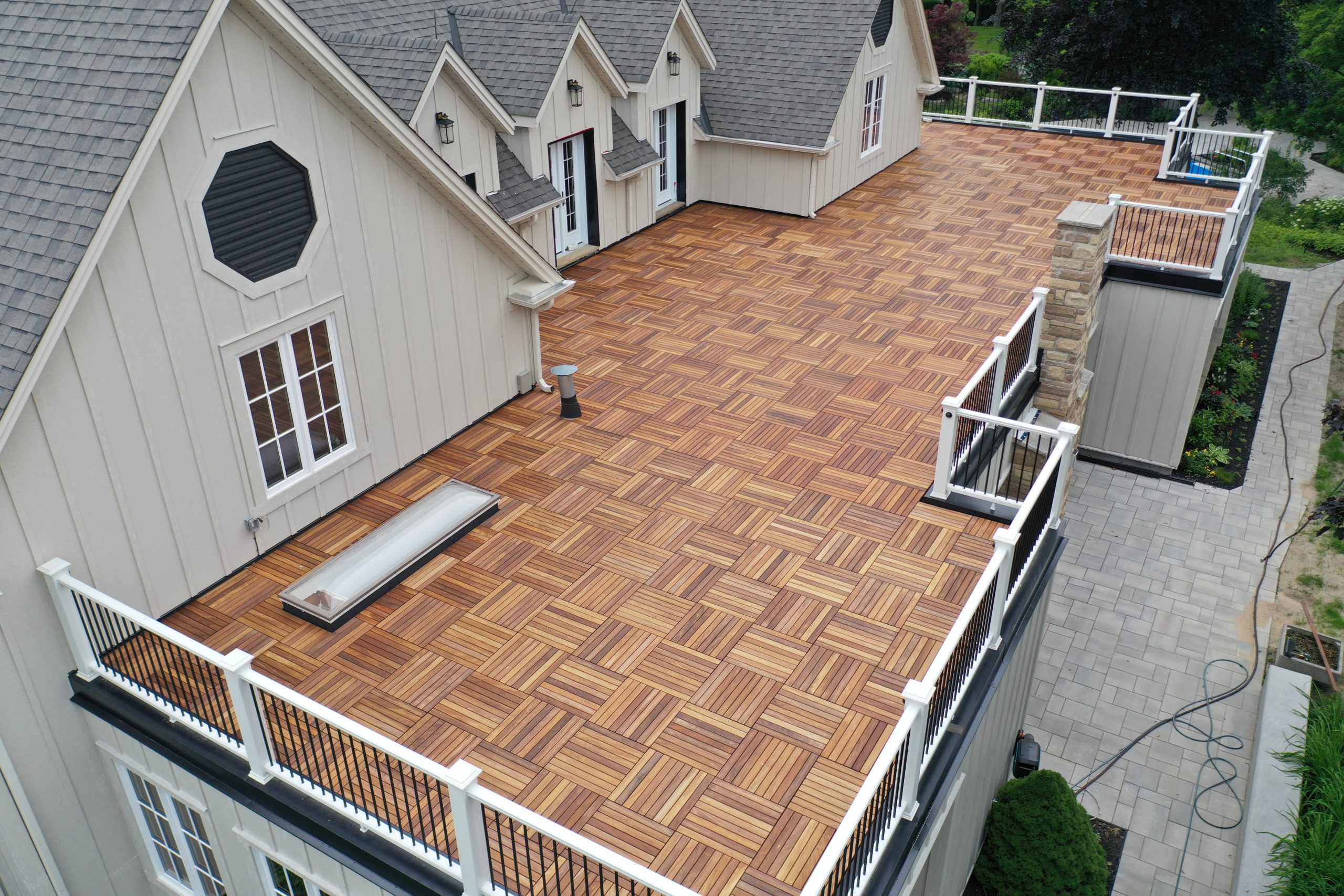 This expansive Bradford estate features a stunning rooftop deck installation utilizing premium Ipe hardwood deck tiles arranged in an elegant parquet pattern. The project transformed an unused roof space into a magnificent 3,000 square foot outdoor living area with panoramic views of the surrounding property and adjacent swimming pool.