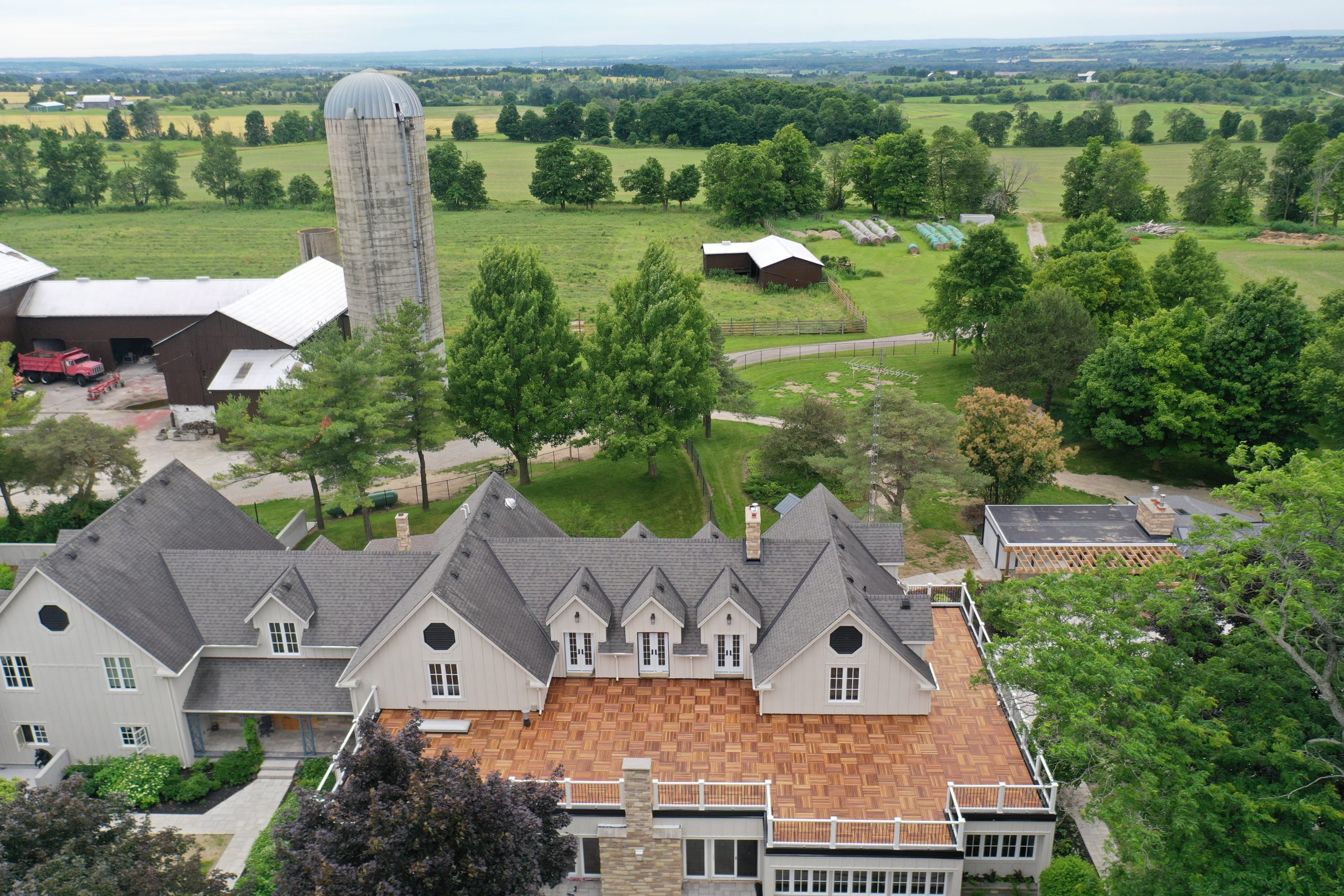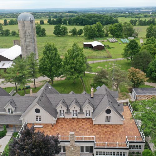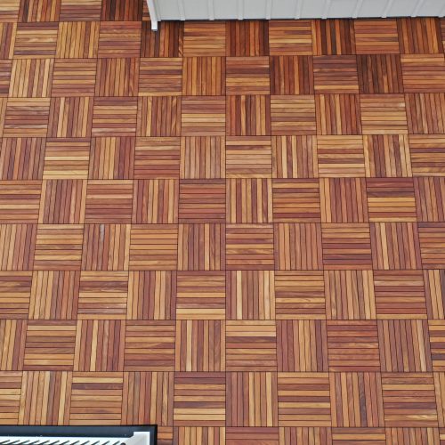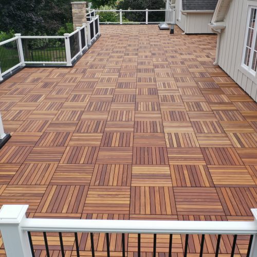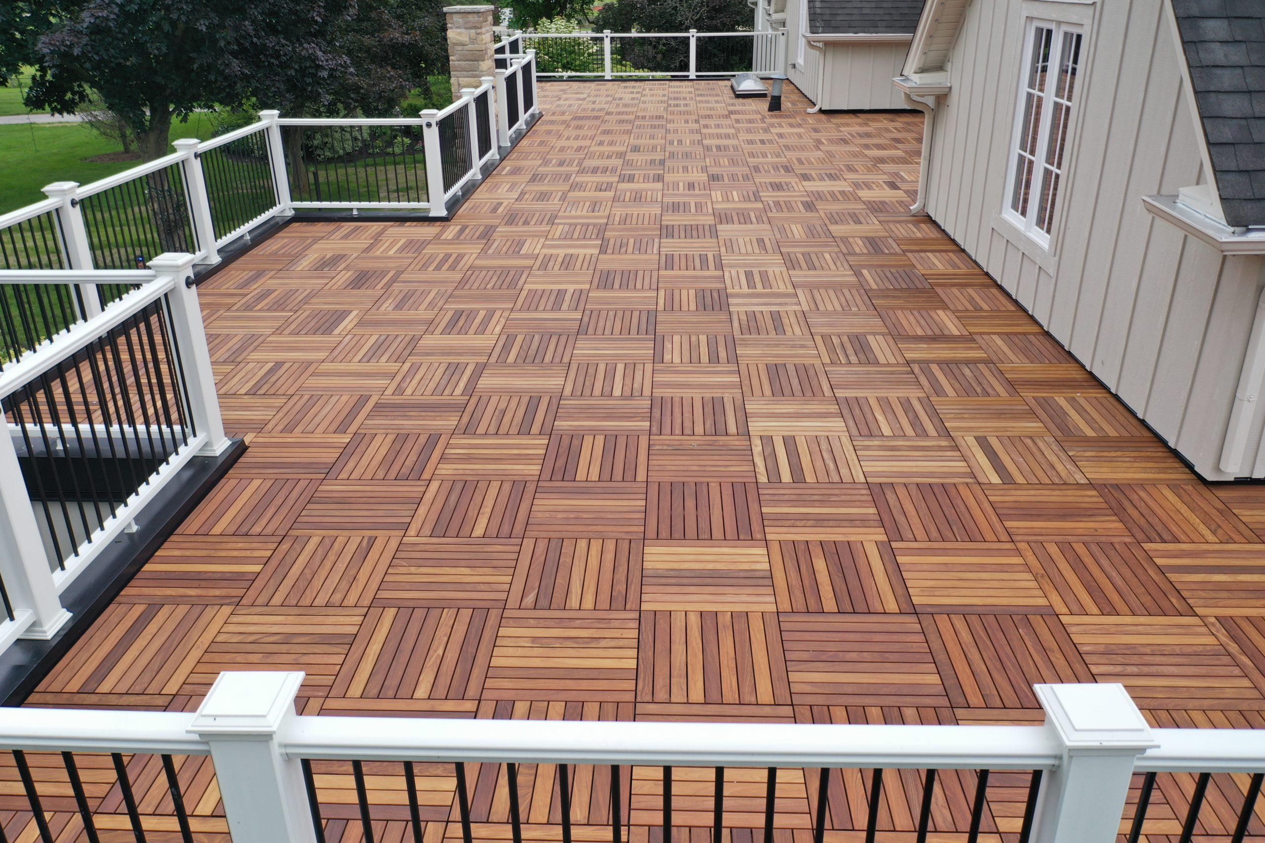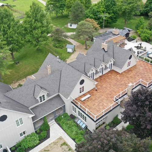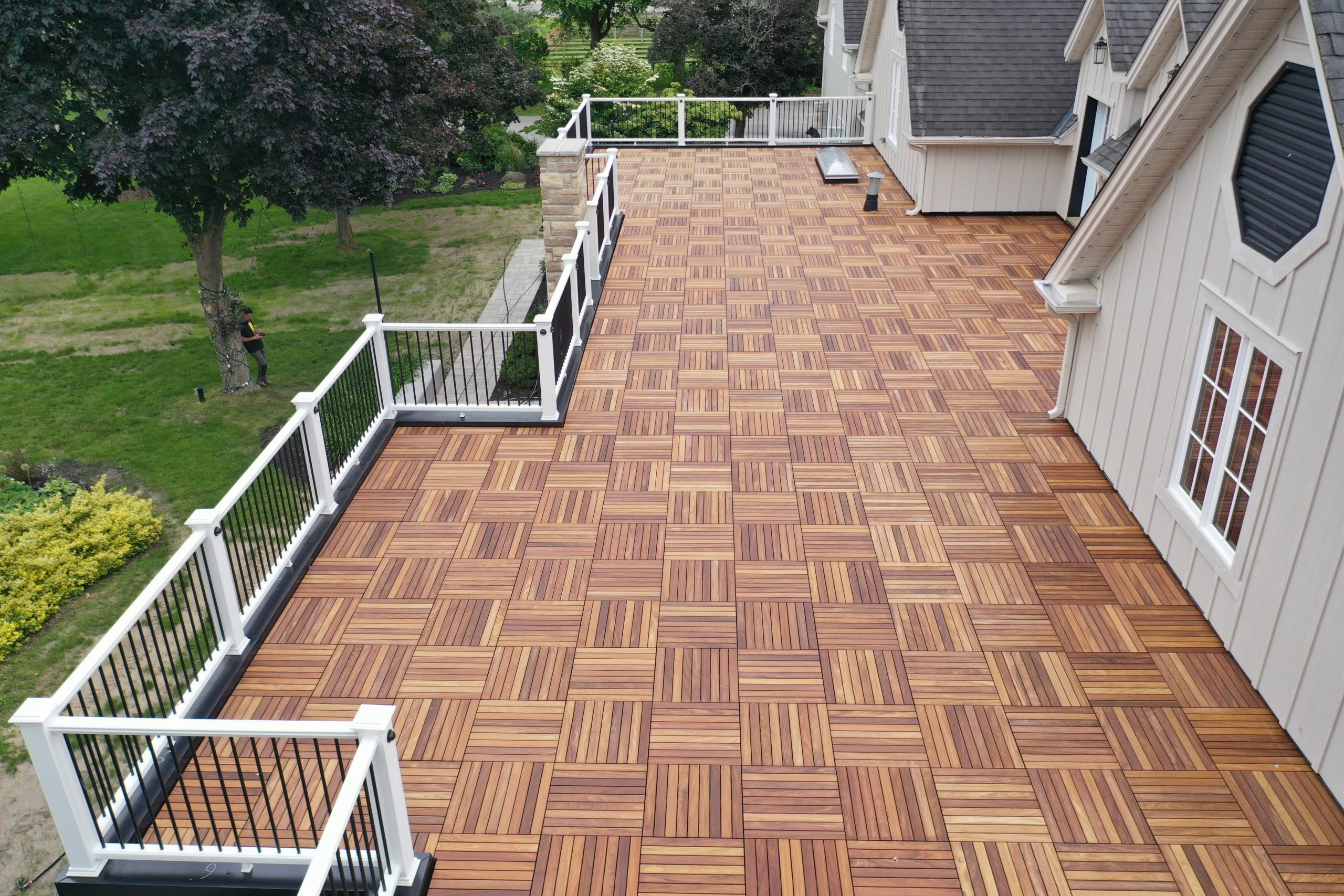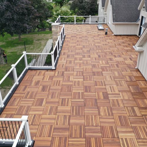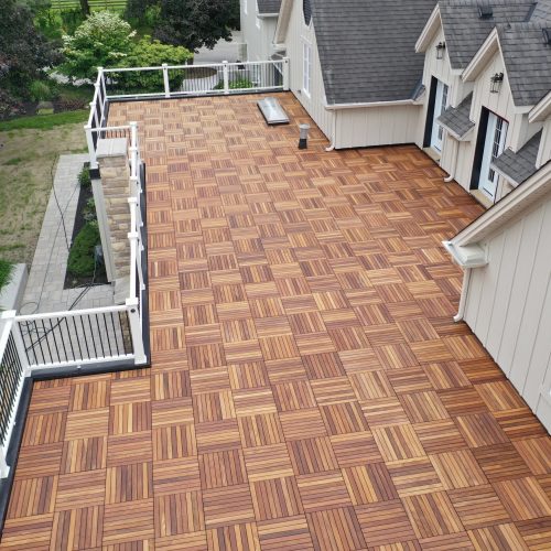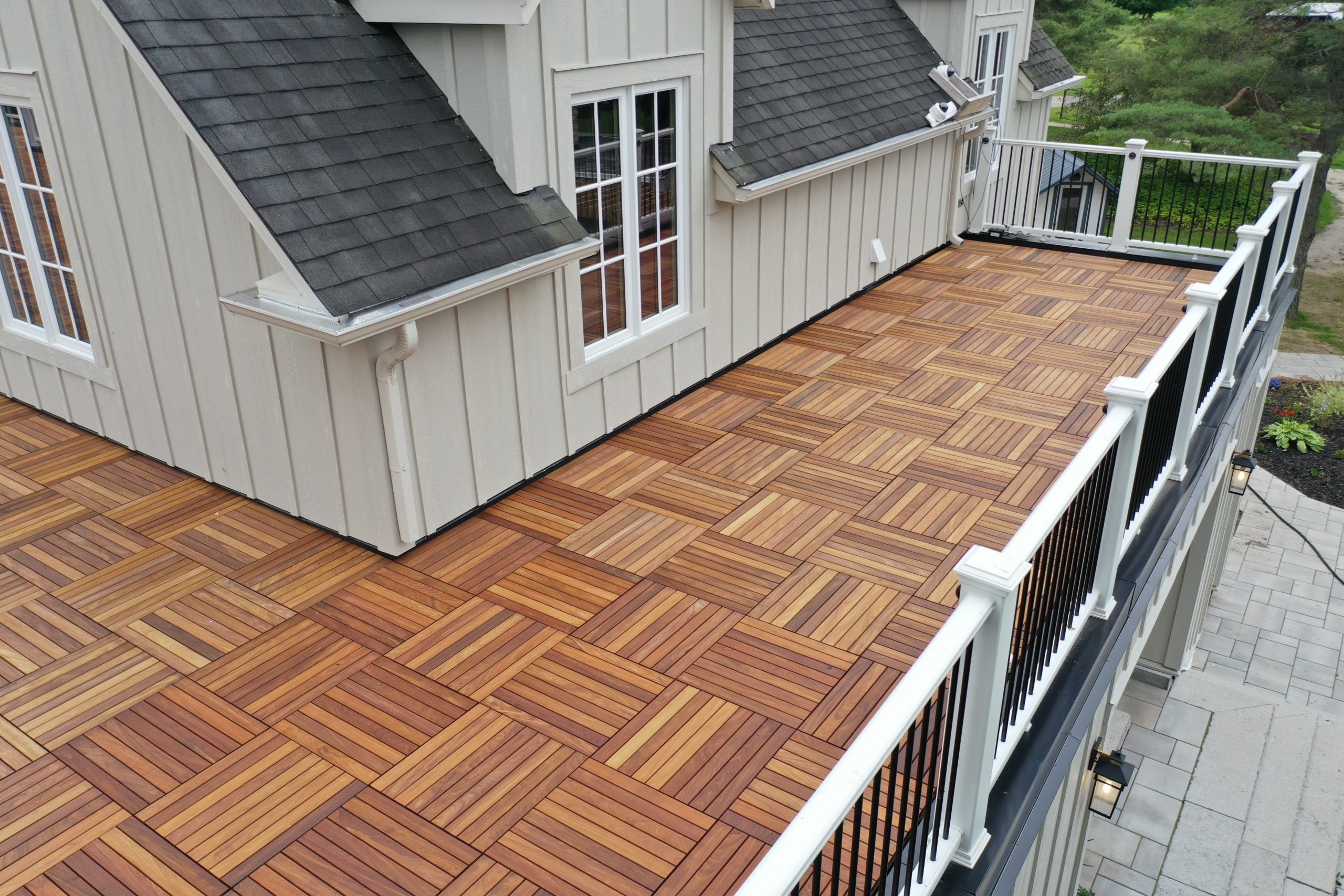 This expansive Bradford estate features a stunning rooftop deck installation utilizing premium Ipe hardwood deck tiles arranged in an elegant parquet pattern. The project transformed an unused roof space into a magnificent 3,000 square foot outdoor living area with panoramic views of the surrounding property and adjacent swimming pool.