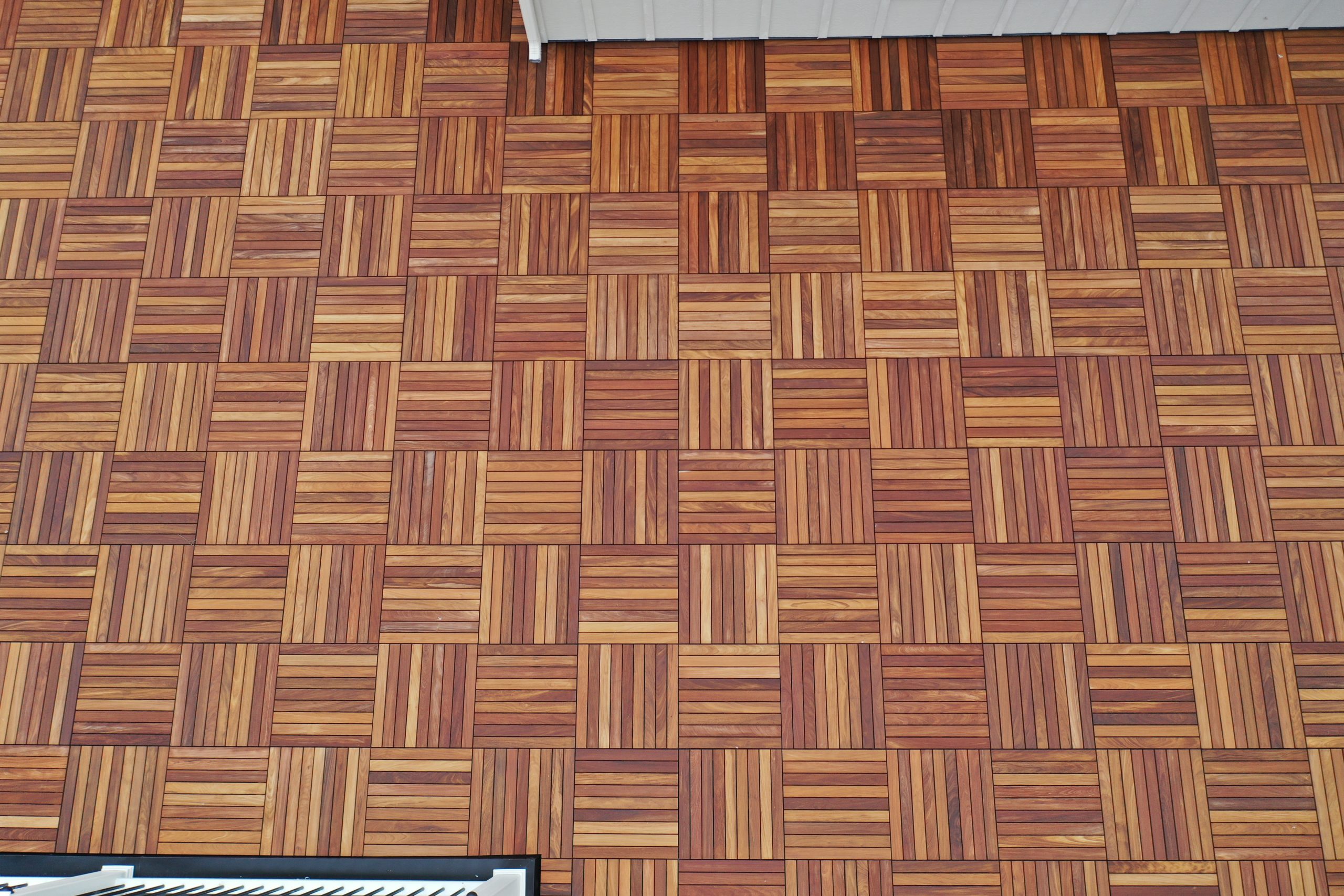 The custom deck design employs removable hardwood tiles that allow for easy access to the roofing membrane beneath while providing the luxurious look and feel of traditional hardwood decking. This innovative approach ensures both exceptional aesthetics and practical maintenance access, crucial for any rooftop deck construction.